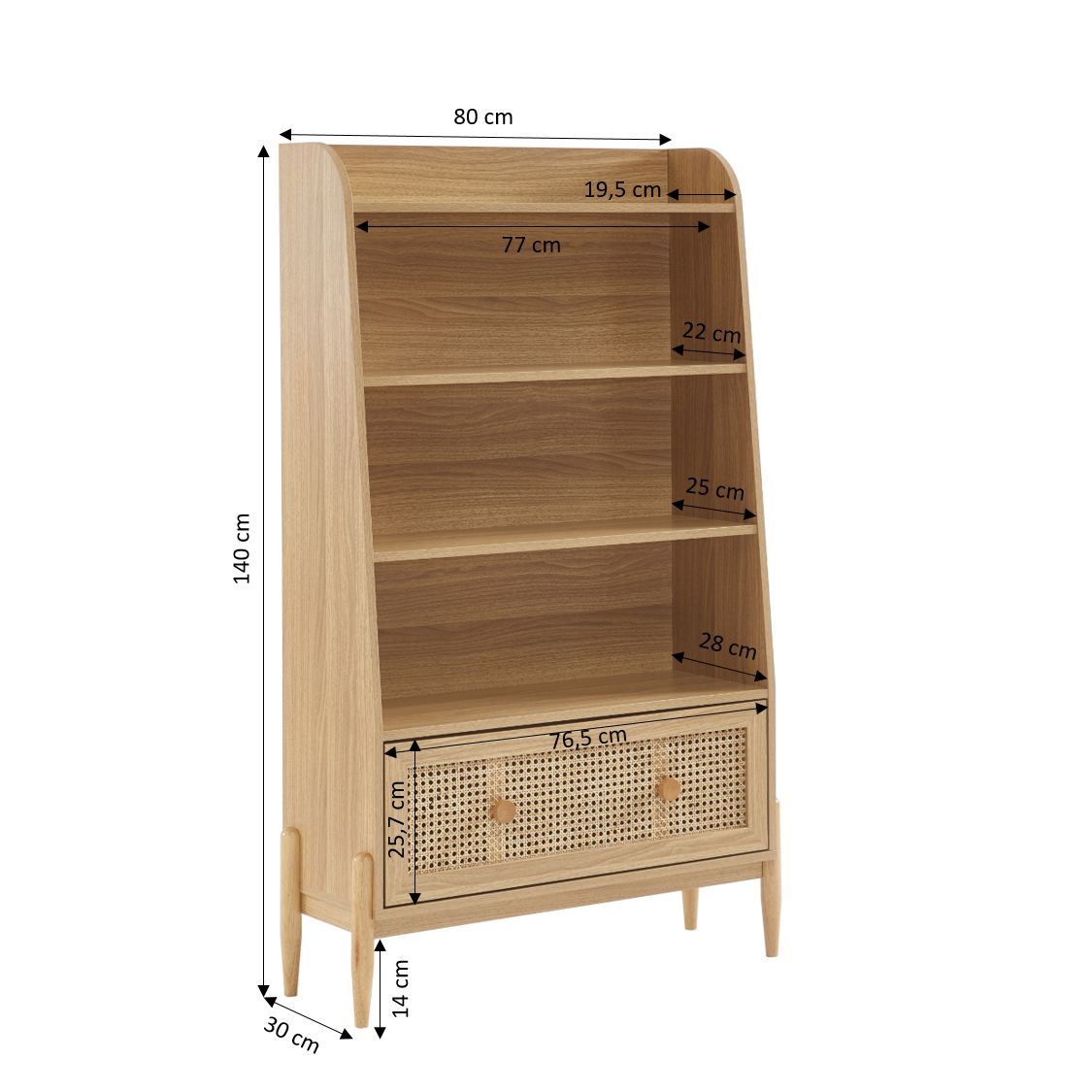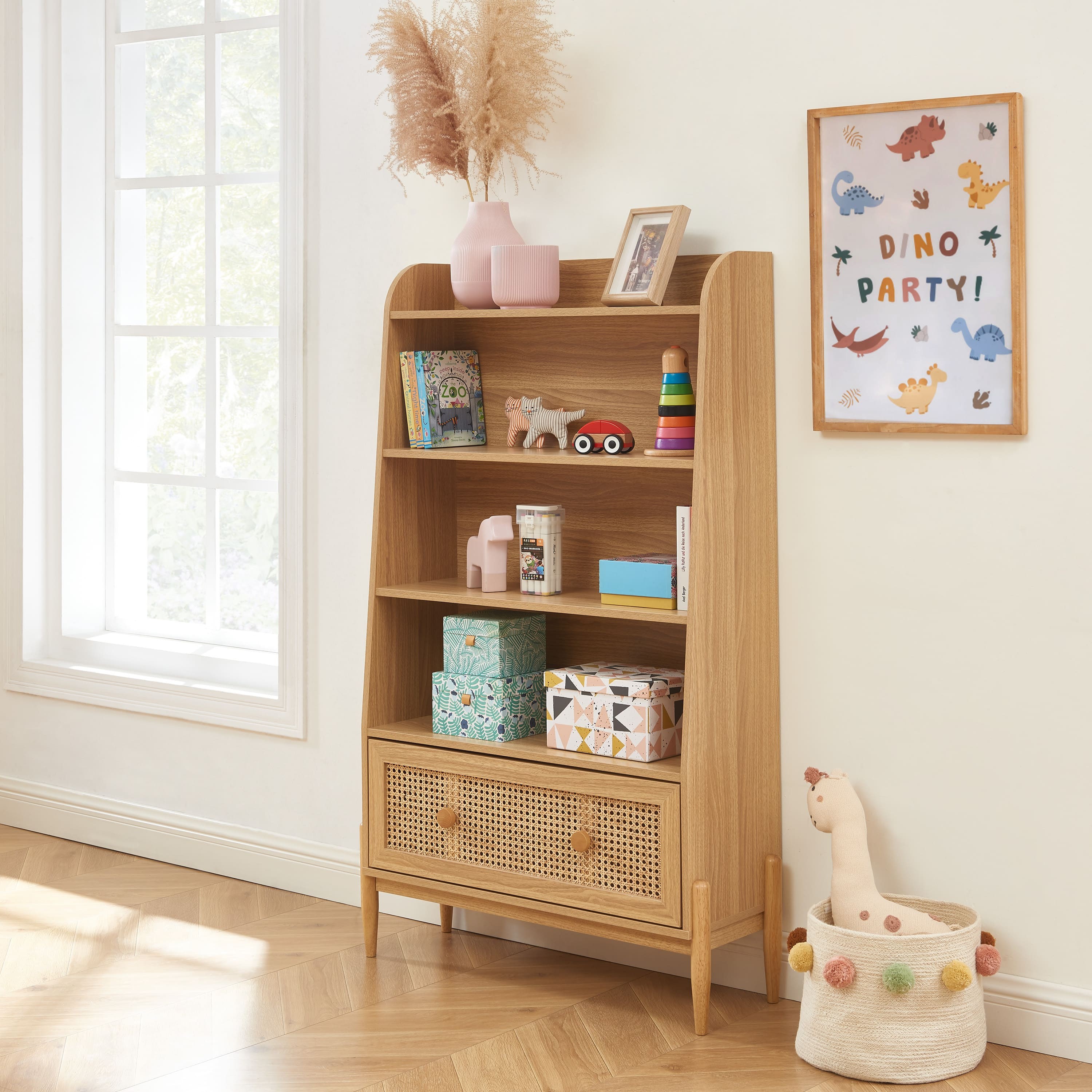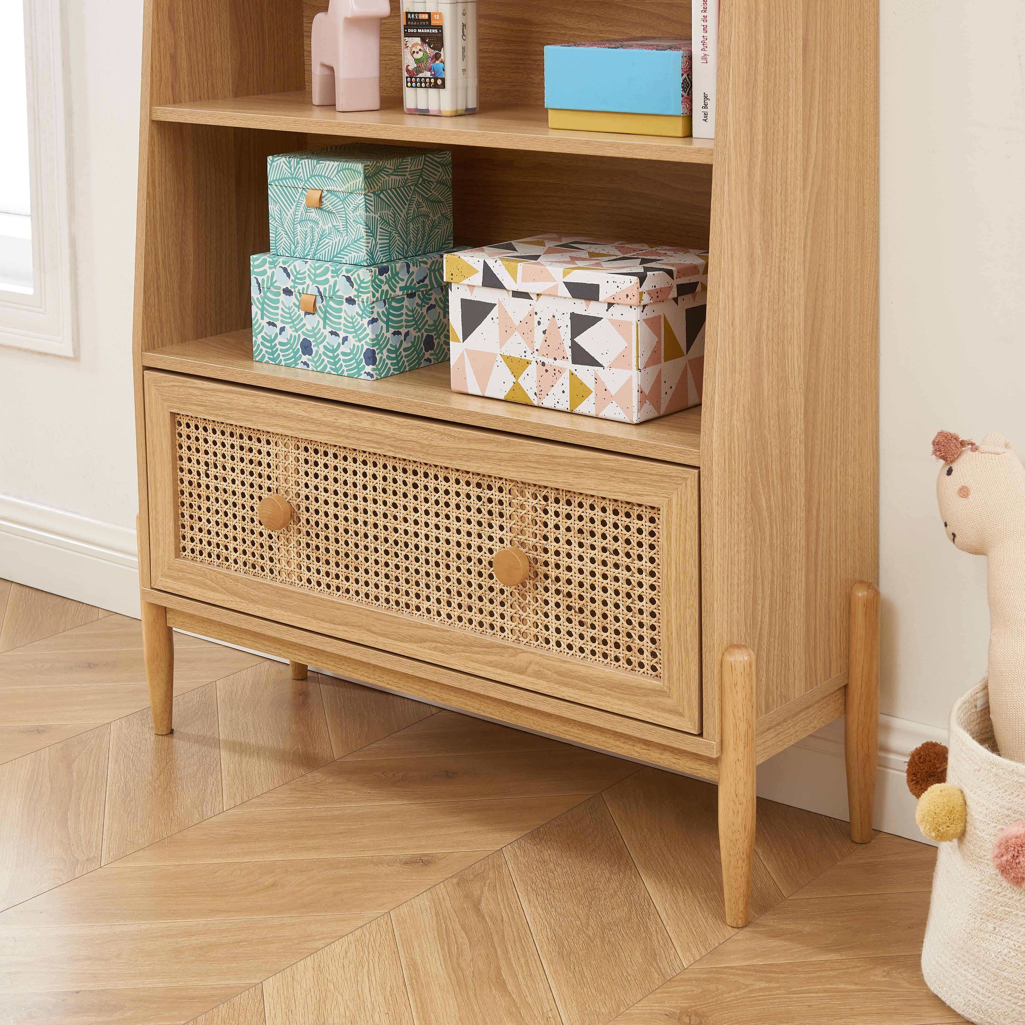 Mit seinen drei Regalen und der Schublade aus Rohrgeflecht bietet dieses Bücherregal viel Platz für die Bücher, Spielsachen und Lieblingsstücke Ihres Kindes. Die Regale sind perfekt dimensioniert, um Bücher aller Größen aufzunehmen, während die Schublade Platz für kleine Schätze und persönliche Gegenstände bietet. Dies macht es zu einem vielseitigen Möbelstück, das ideal ist, um die Organisation und Kreativität Ihres Kindes zu fördern.