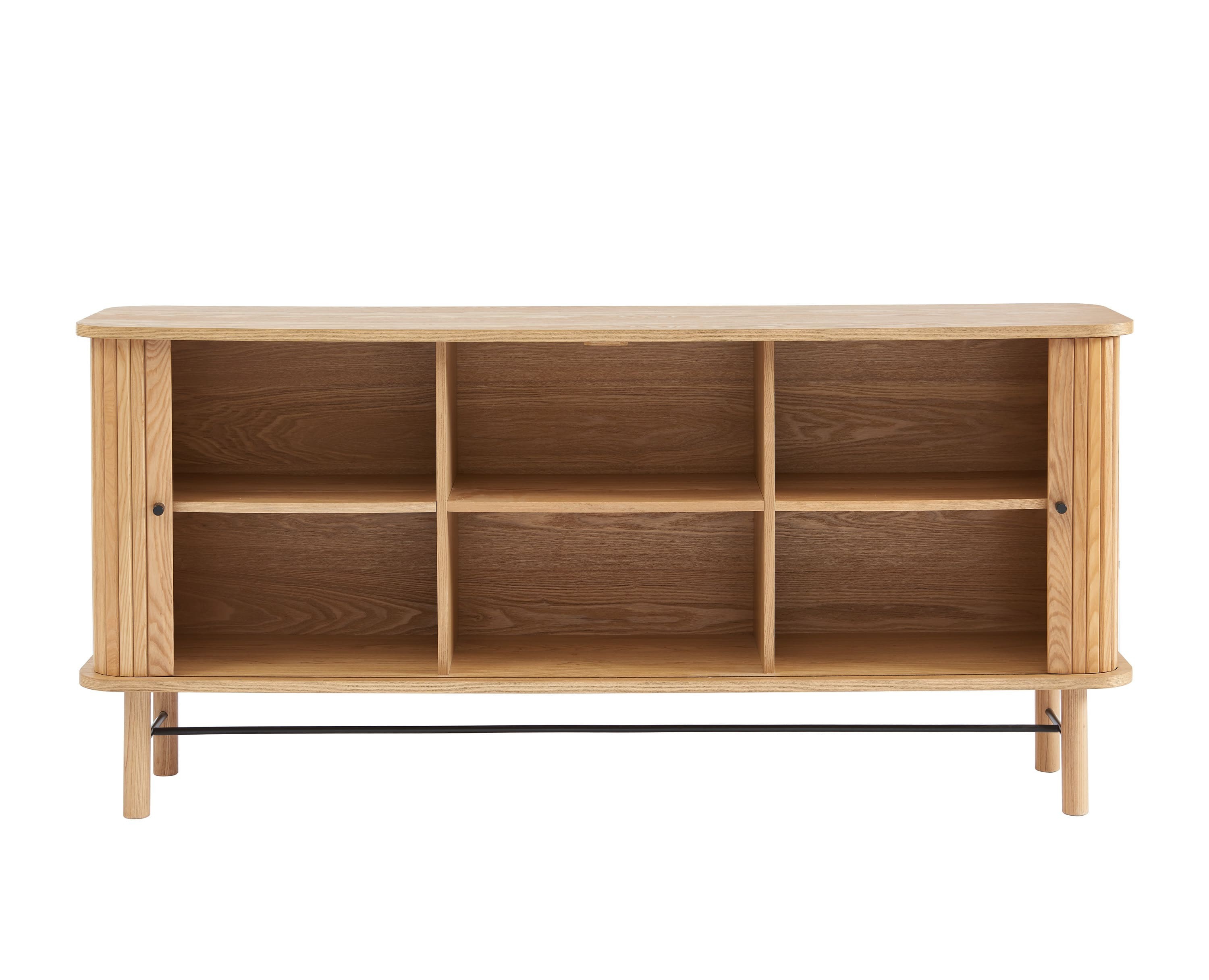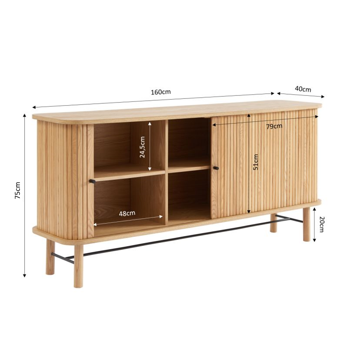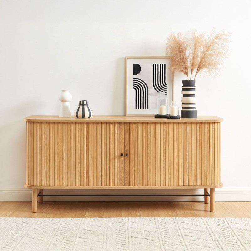 Das Sideboard ERNEST setzt auf den Trend der Rundungen und der Schiebetüren! Verlieben Sie sich in dieses trendige Möbelstück mit seinem Eichenfurnier und den schwarzen Metallgriffen und -füßen.