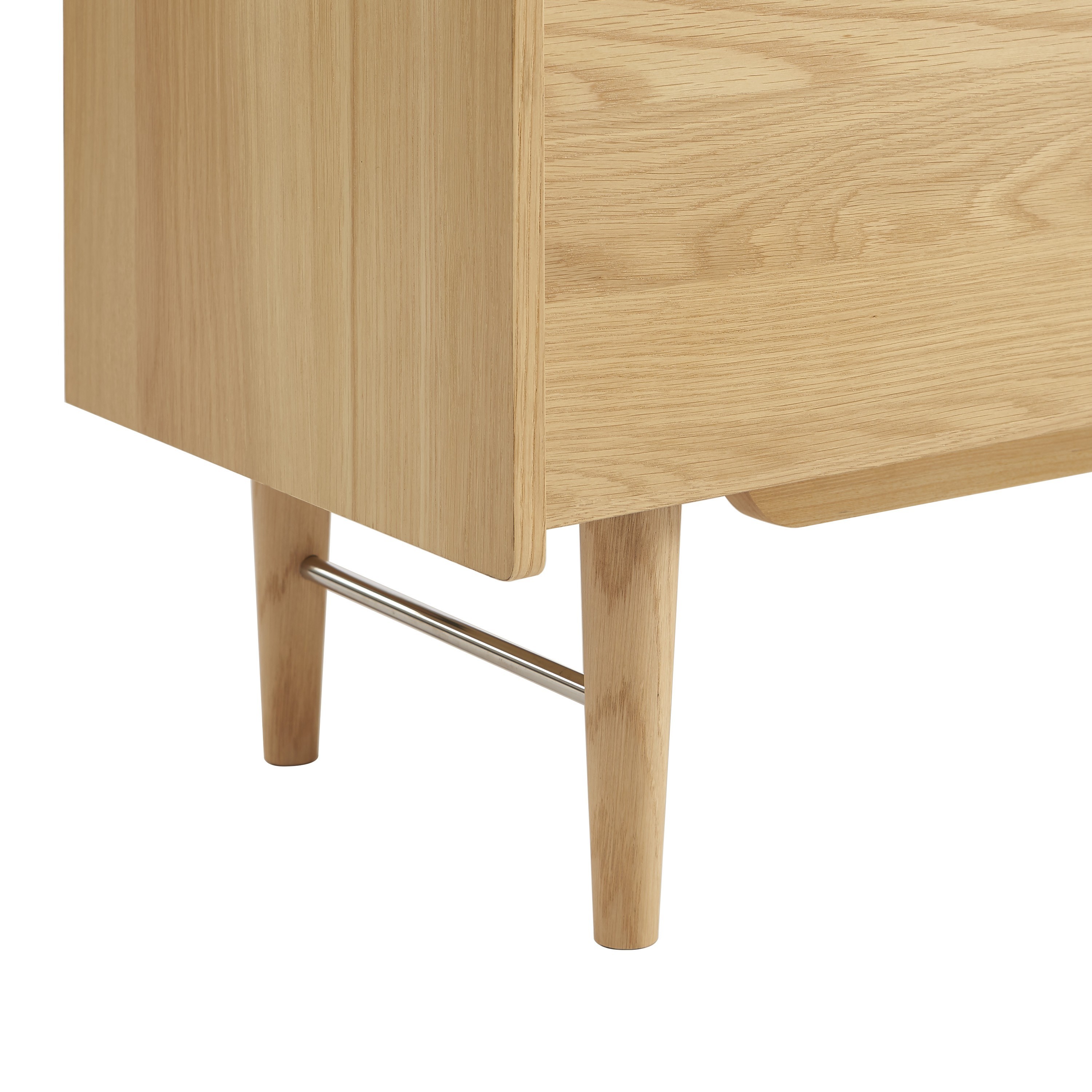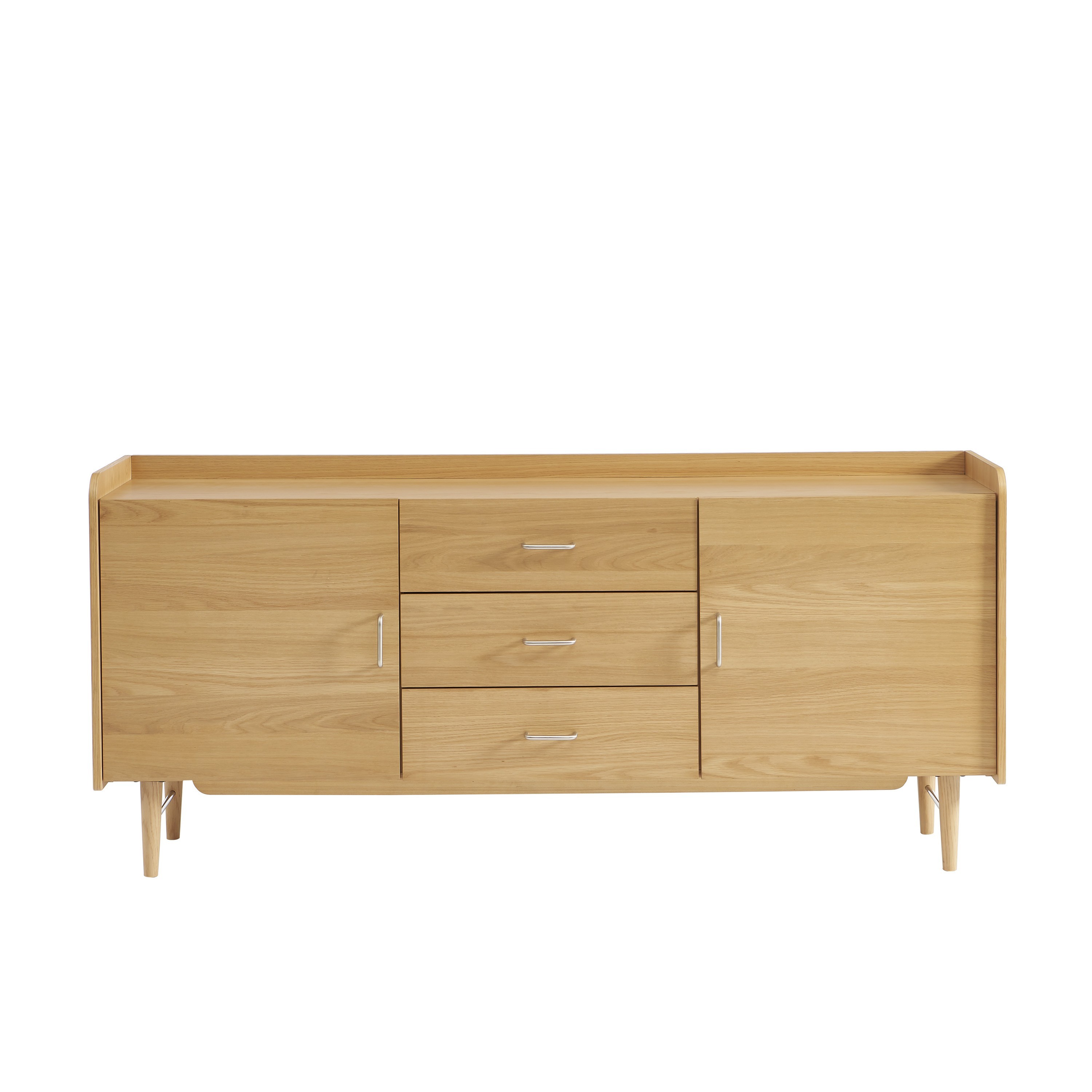 Dieses Sideboard steht auf einem Massivholzgestell, das für Stabilität sorgt und dem Ganzen eine natürliche und authentische Note verleiht. Die Metallgriffe sorgen für eine elegante und moderne Note und bilden einen Kontrast zum warmen Eschenholz.