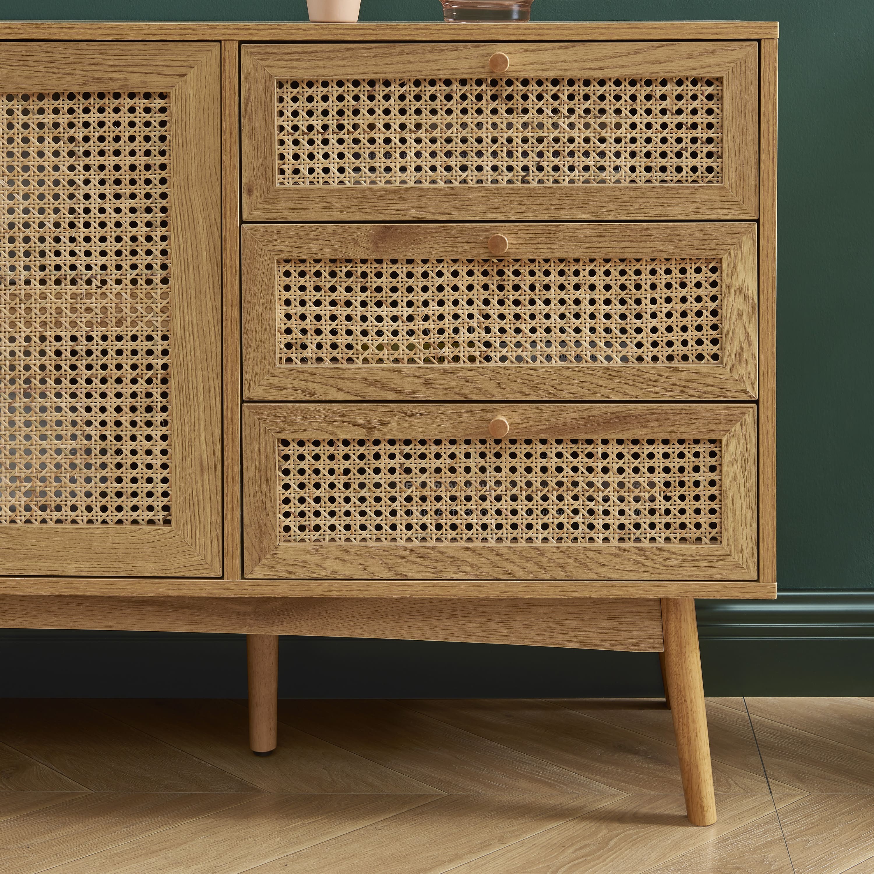 - 2 Türen und 3 Schubladen mit kreisförmigem Rattangeflecht verkleidet