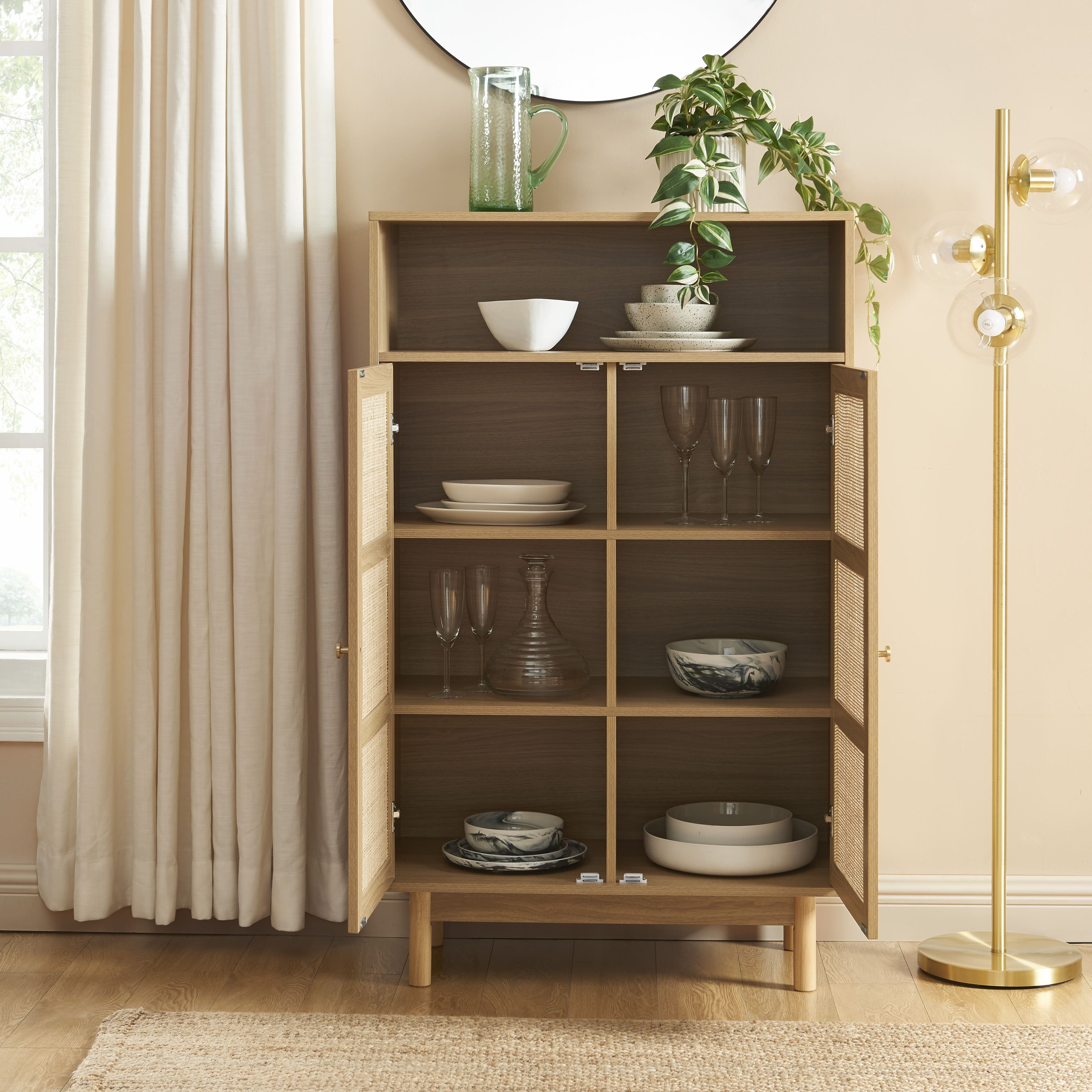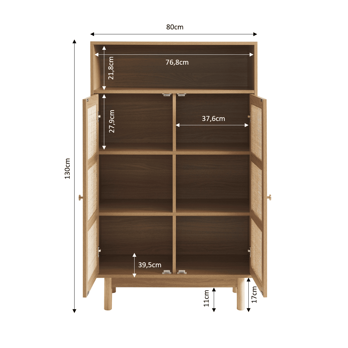 Neben seinem Design bietet Ihnen das HELENA Sideboard aus Rohrgeflecht auch viel Stauraum. Die obere Nische bietet einen organisierten Platz für Bücher oder Dekorationsgegenstände. Die Türen bieten Platz für vier Einlegeböden, auf denen Sie Ihr Geschirr oder Ihre Wäsche aufbewahren können.