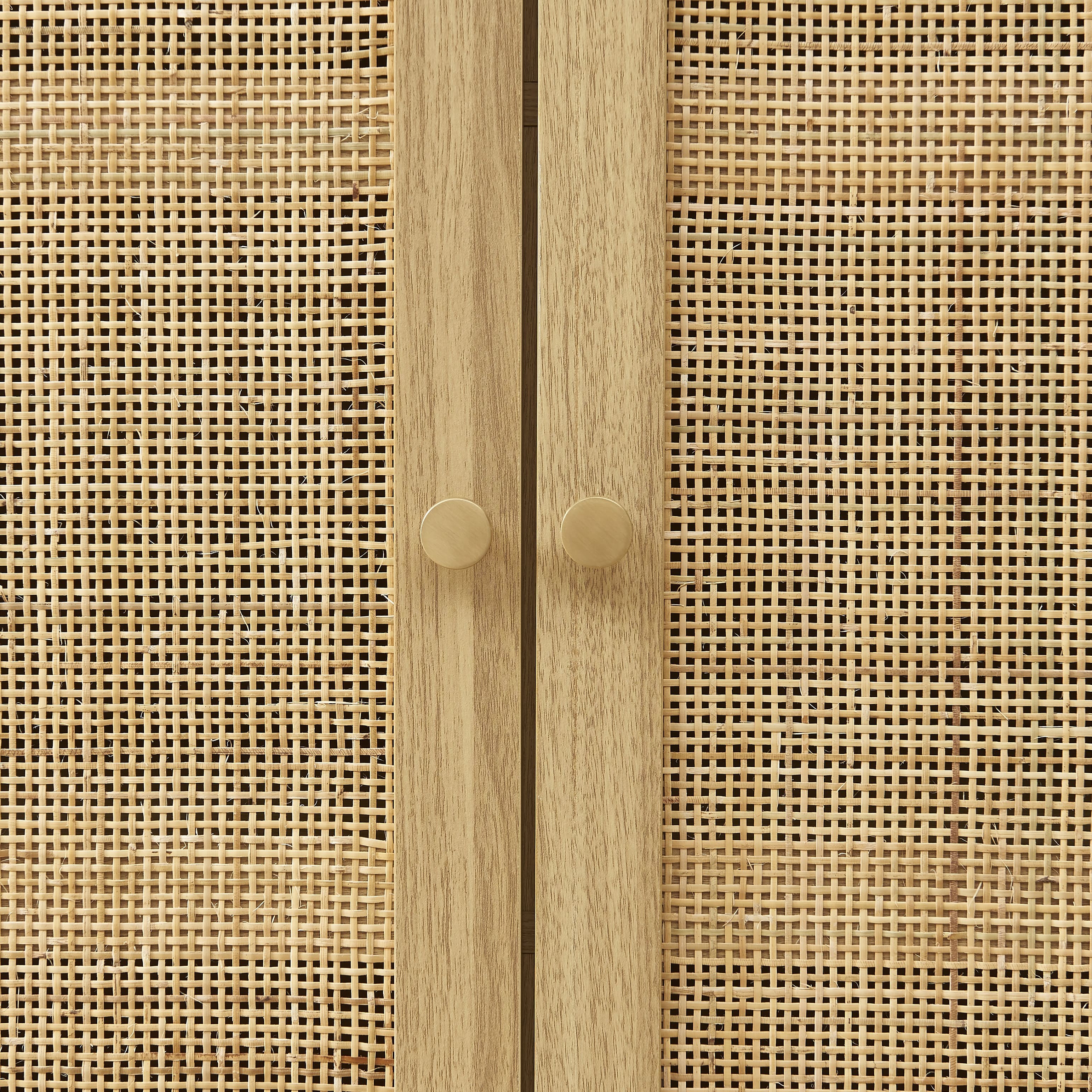 Das natürliche Design erinnert an böhmische Handwerkskunst, während es gleichzeitig einen subtilen Blick auf den Inhalt der Aufbewahrungsnischen freigibt. Die Griffe aus Goldmessing verleihen dem Sideboard eine schicke Note. Der Kontrast zwischen Rattan und Goldmessing schafft eine harmonische Ästhetik zwischen Rustikalität und Eleganz.