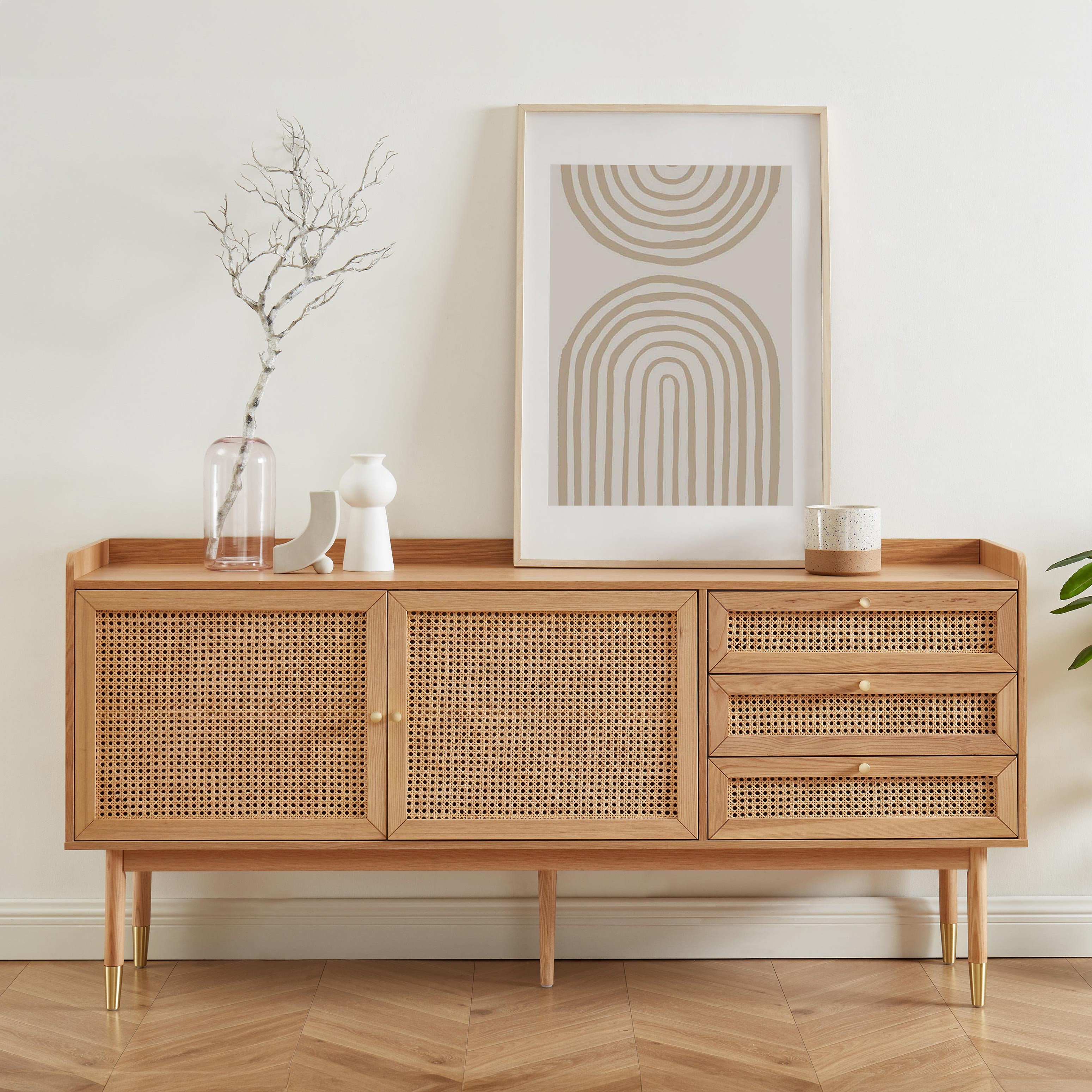 2 Türen und 3 Schubladen im Retro-Stil verschönert Ihr Wohnzimmer und ermöglicht Ihnen dank seines zahlreichen Stauraums eine optimale Raumnutzung.Wir lieben: seine massiven Holzfüße mit Messingfinish und seine 100 % natürliche Flechtung!