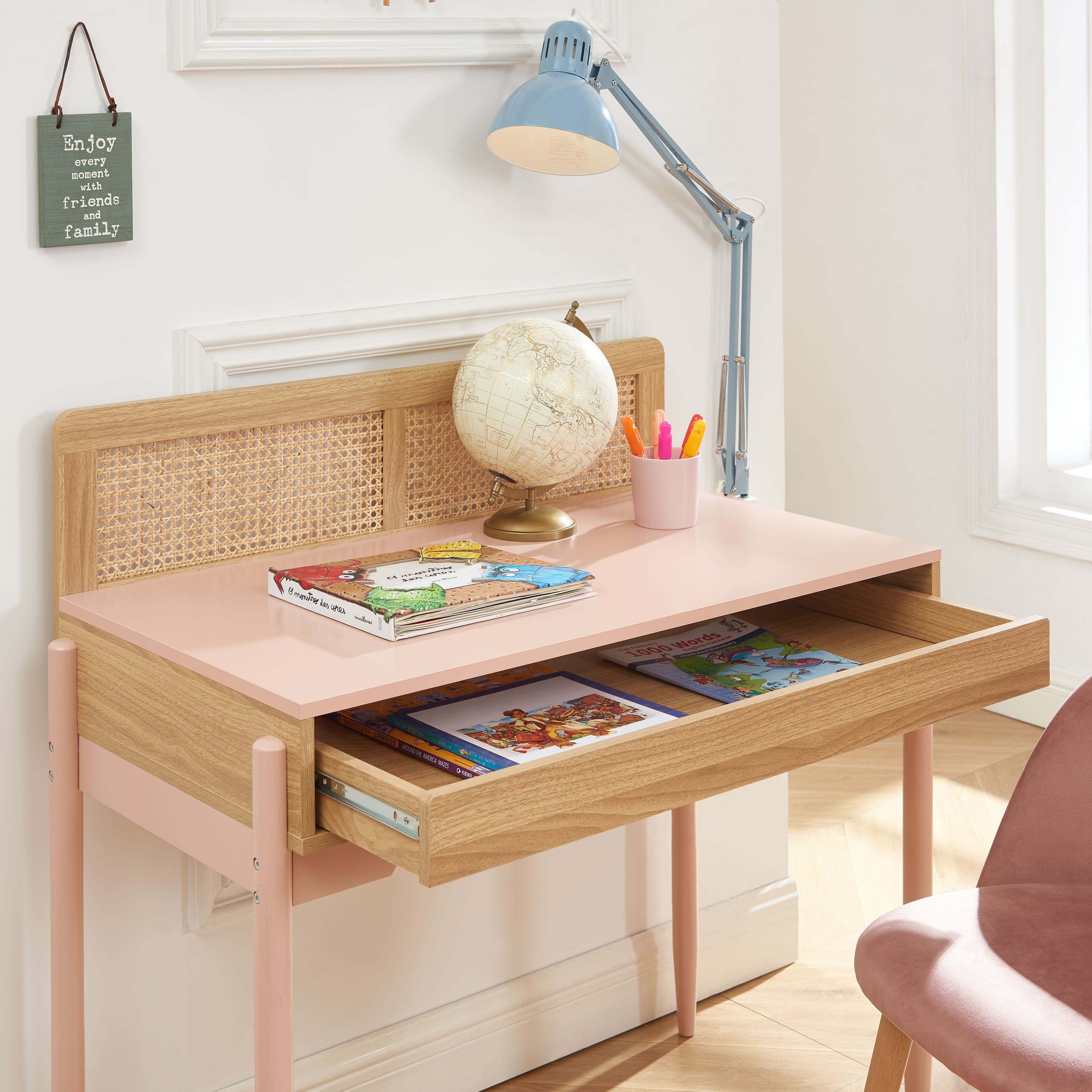 Der Kinderschreibtisch PABLO ist viel mehr als nur ein Schreibtisch. Er wurde entworfen, um einen inspirierenden Arbeits- oder Spielplatz zu schaffen und gleichzeitig dem Zimmer Ihres Kindes einen Hauch von natürlichem Charme zu verleihen. Mit seinem Teil aus kreisförmigem Rattangeflecht zeichnet er sich durch ein retro- und trendiges Design aus. Das kreisförmige Rattangeflecht, das einen Teil des Schreibtischs PABLO schmückt, ist das Detail, das den Unterschied ausmacht. Es verleiht dem Schreibtisch PABLO eine warme Note und wird nicht unbemerkt bleiben.