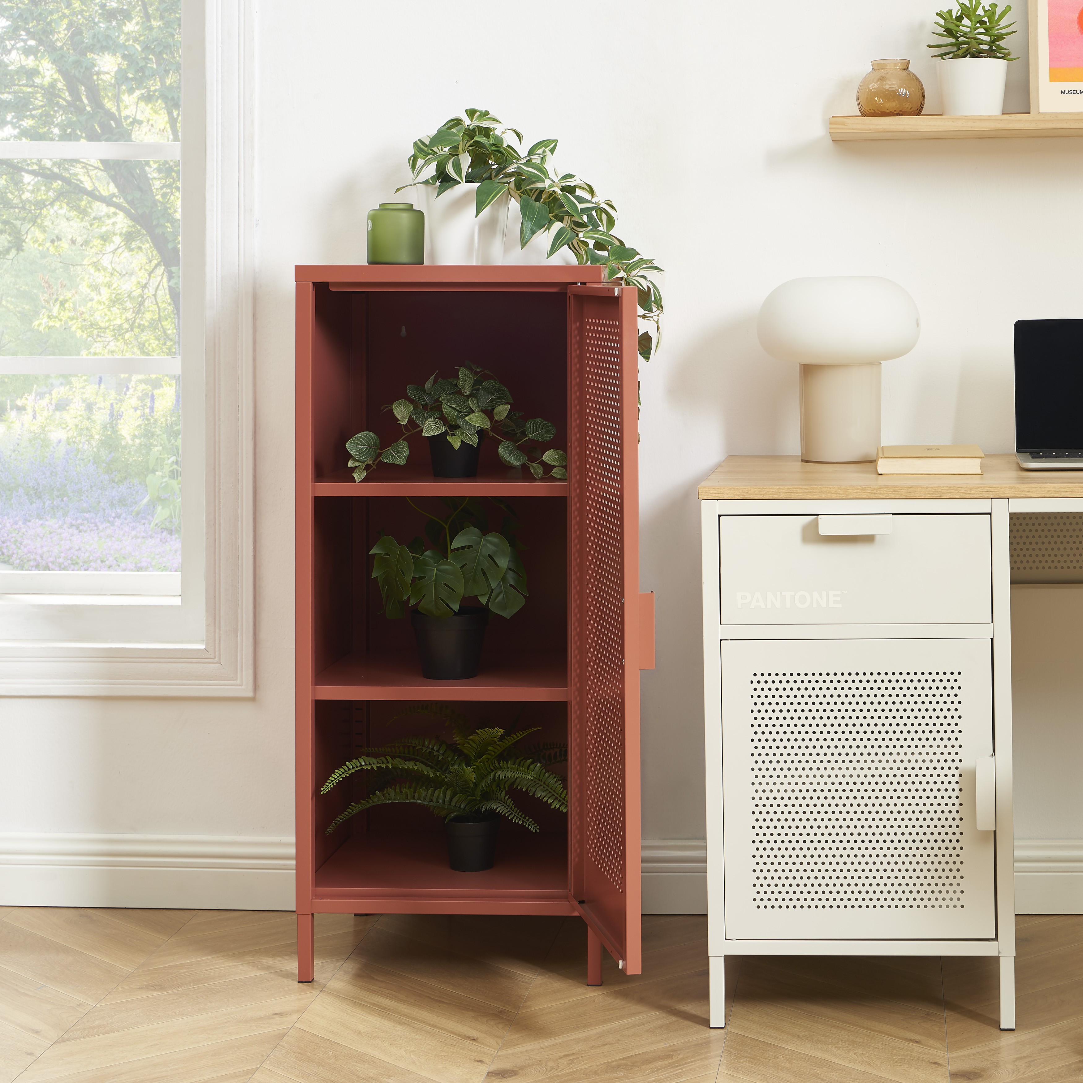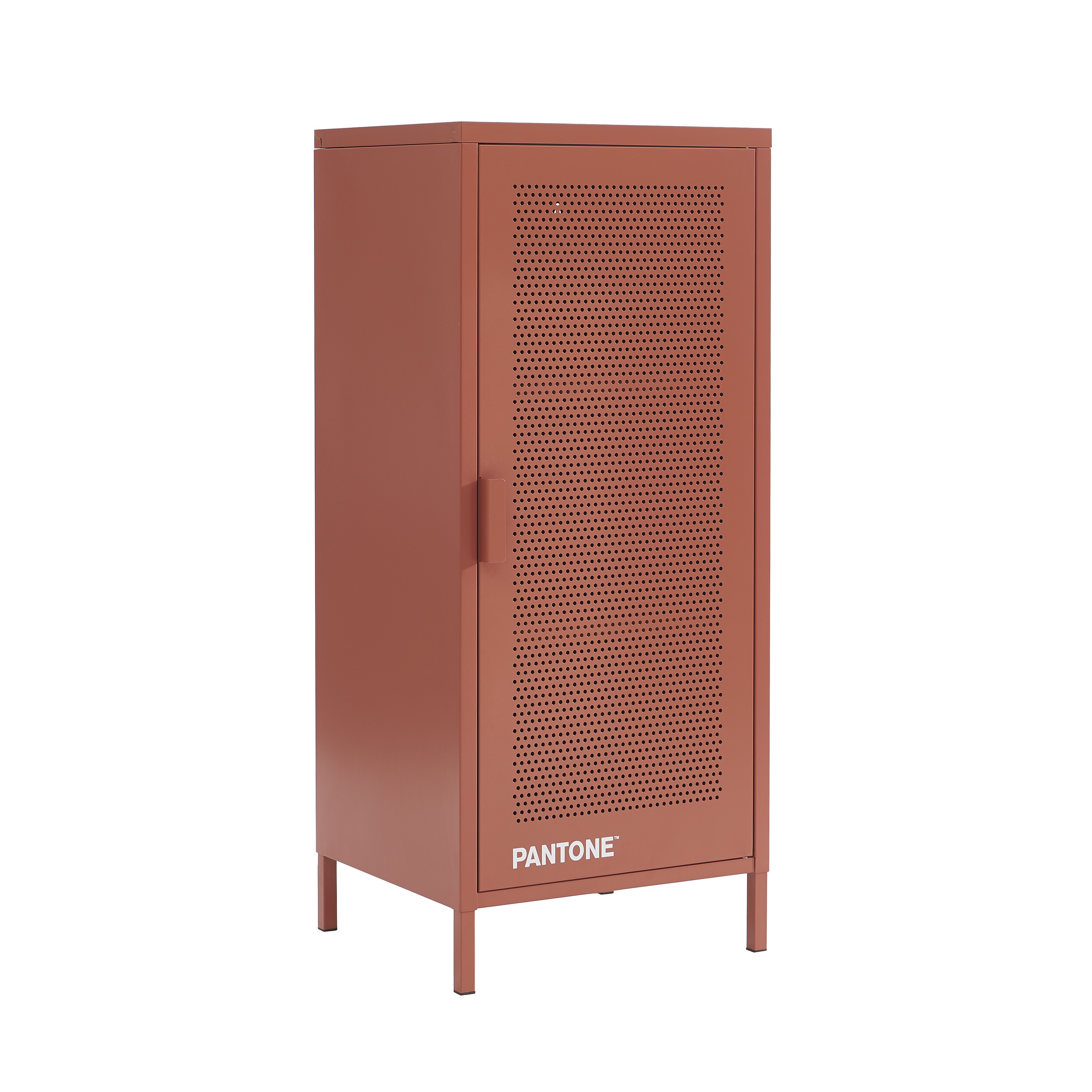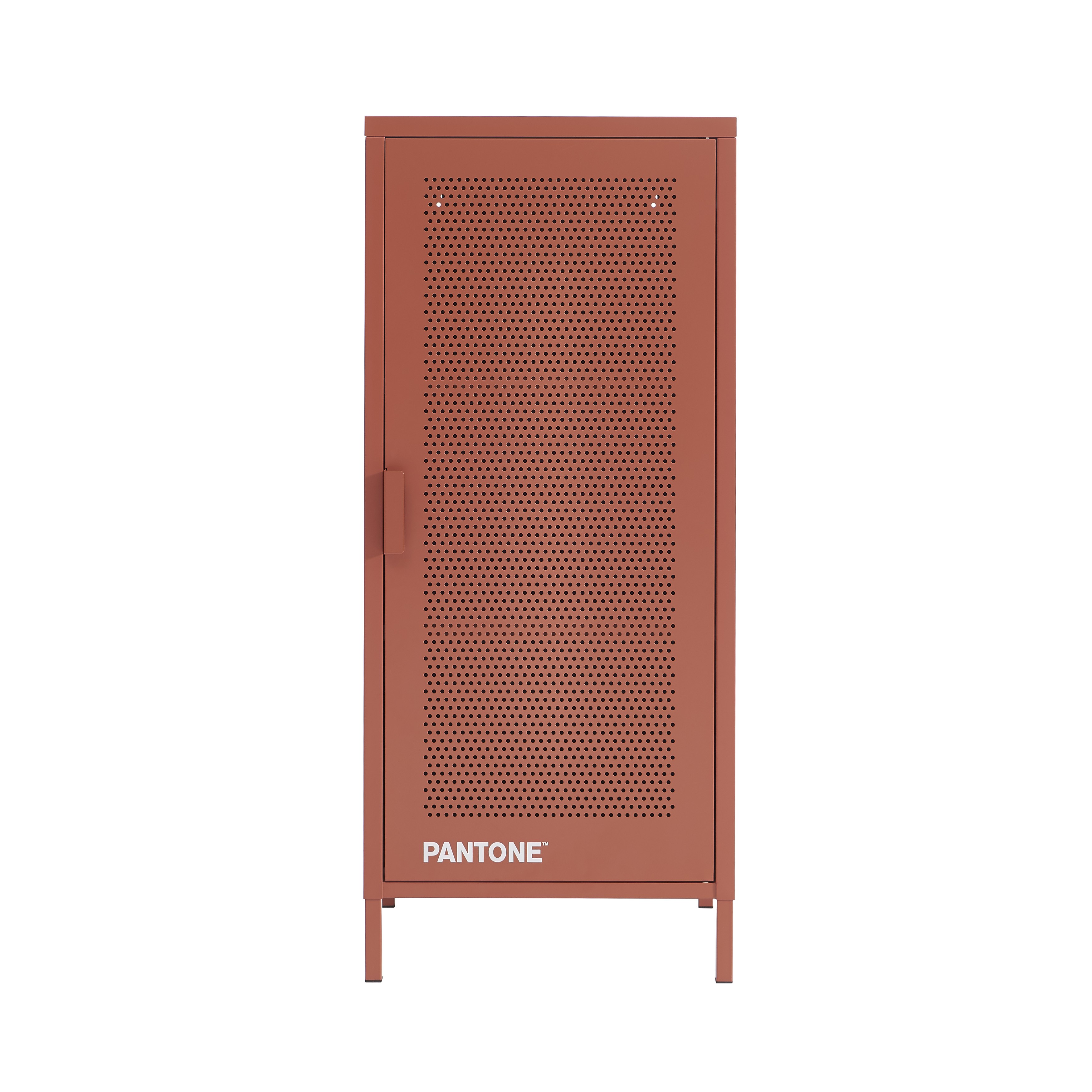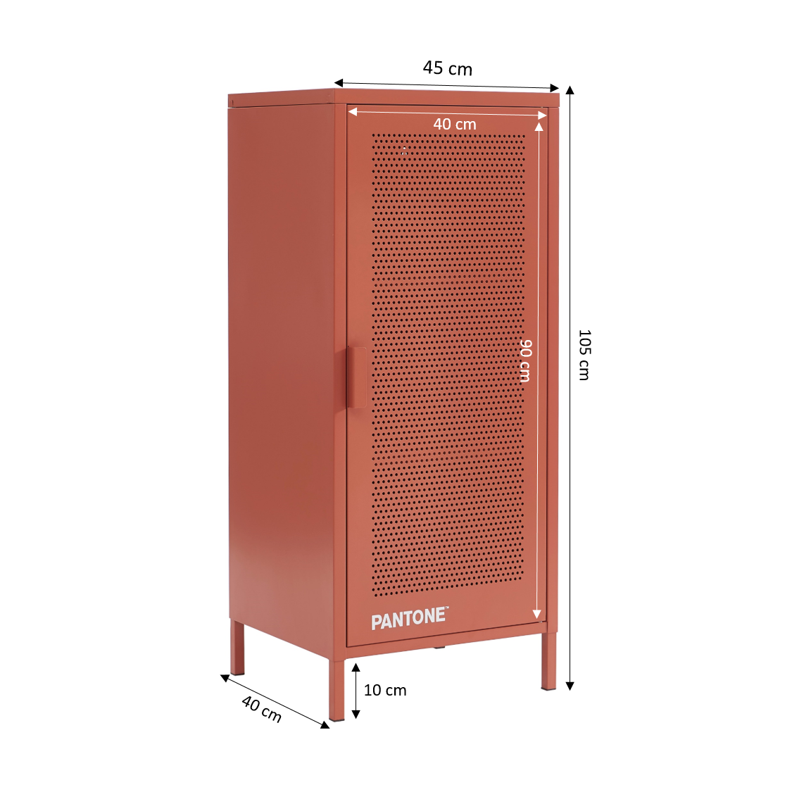 Die perforierte Stahltür des PANTONE-Schranks verstärkt noch den industriellen Stil, während die Metallbeine für seine Stabilität sorgen.