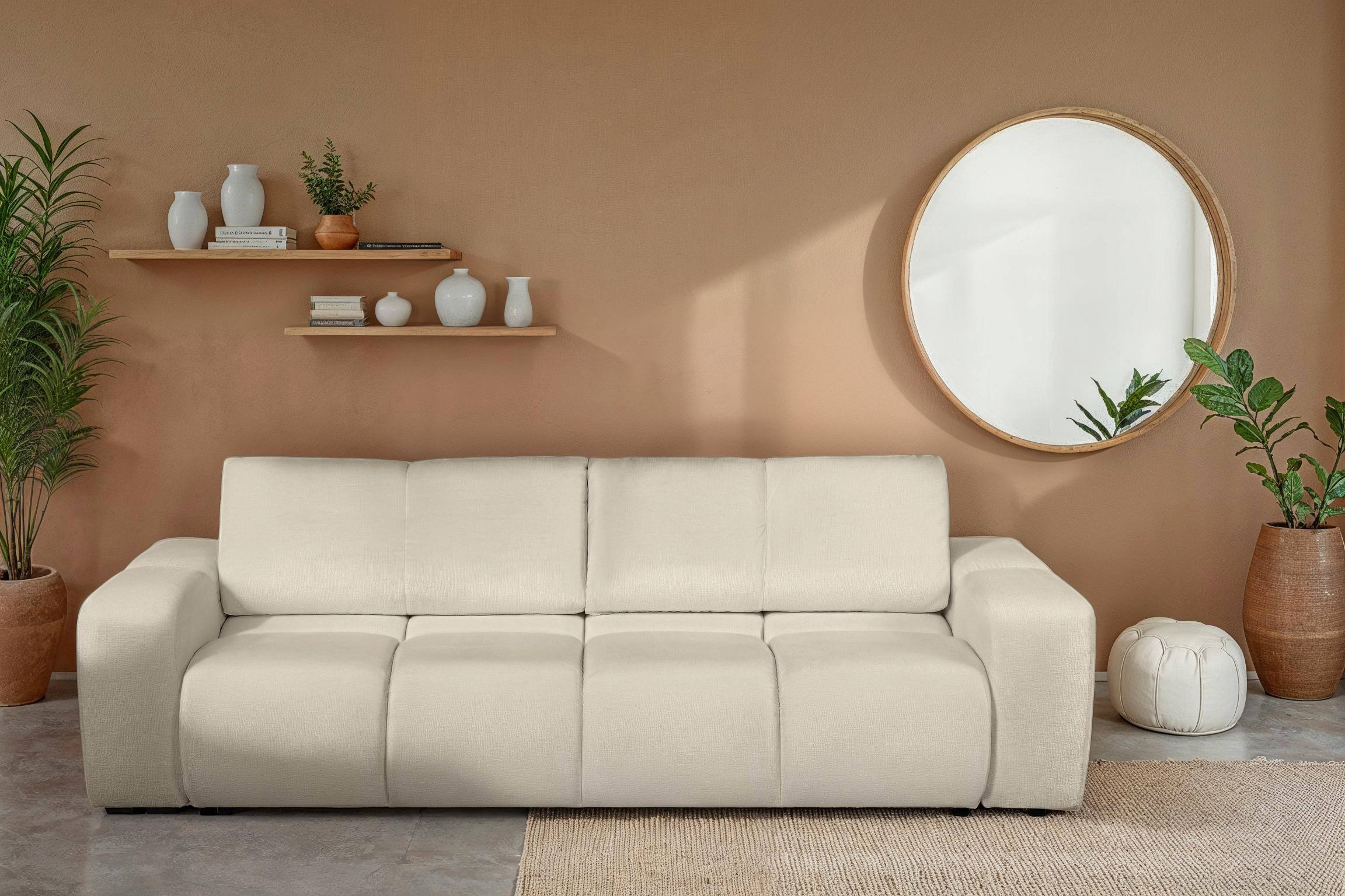 Das schlichte, bequeme und praktische 3-Sitzer-Sofa SORELLA verwandelt Ihr Wohnzimmer in einen gemütlichen Rückzugsort. Es ist ausziehbar und verfügt über einen diskreten Stauraum, wodurch es Ihren Alltag auf elegante Weise vereinfacht.