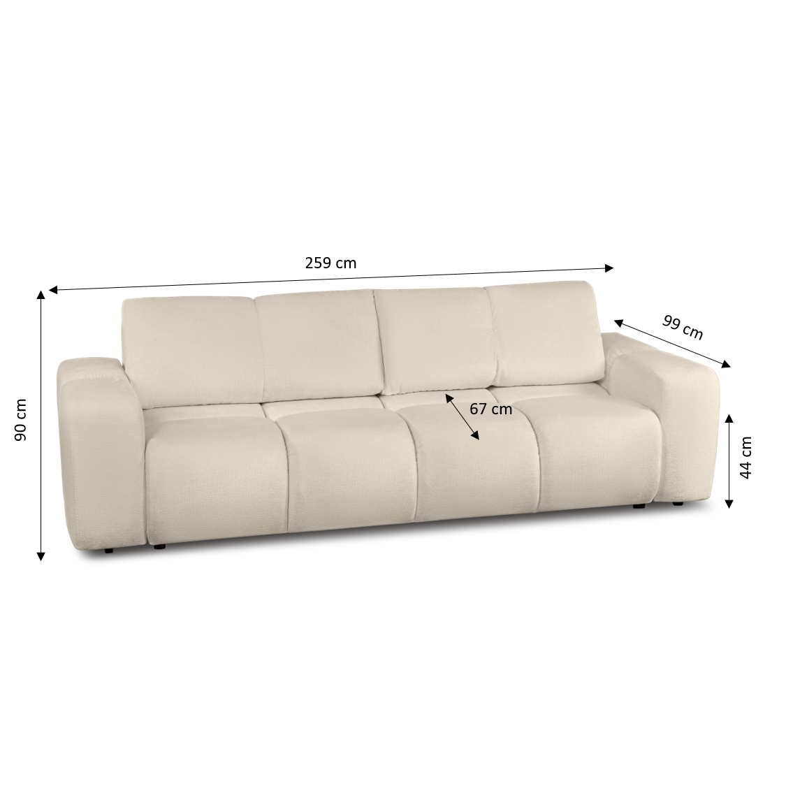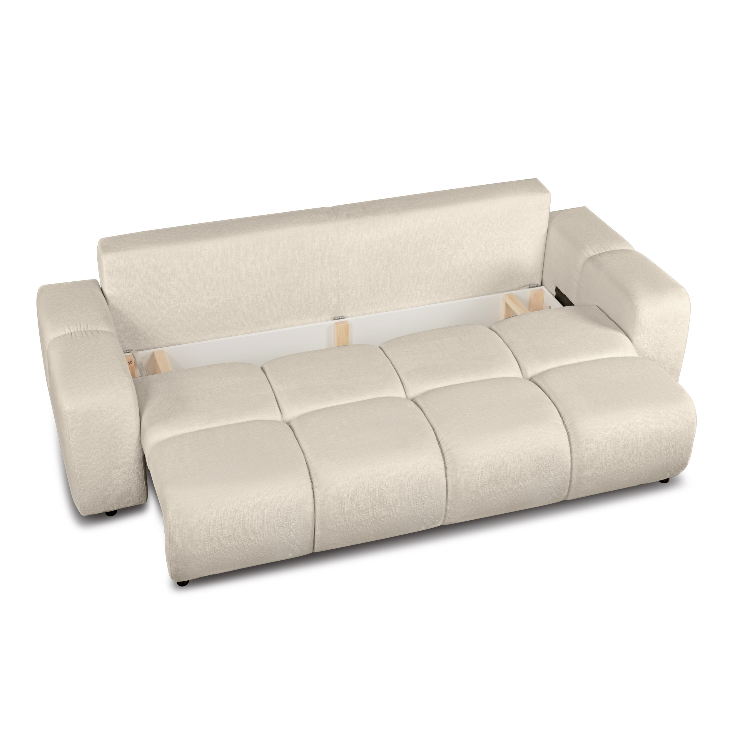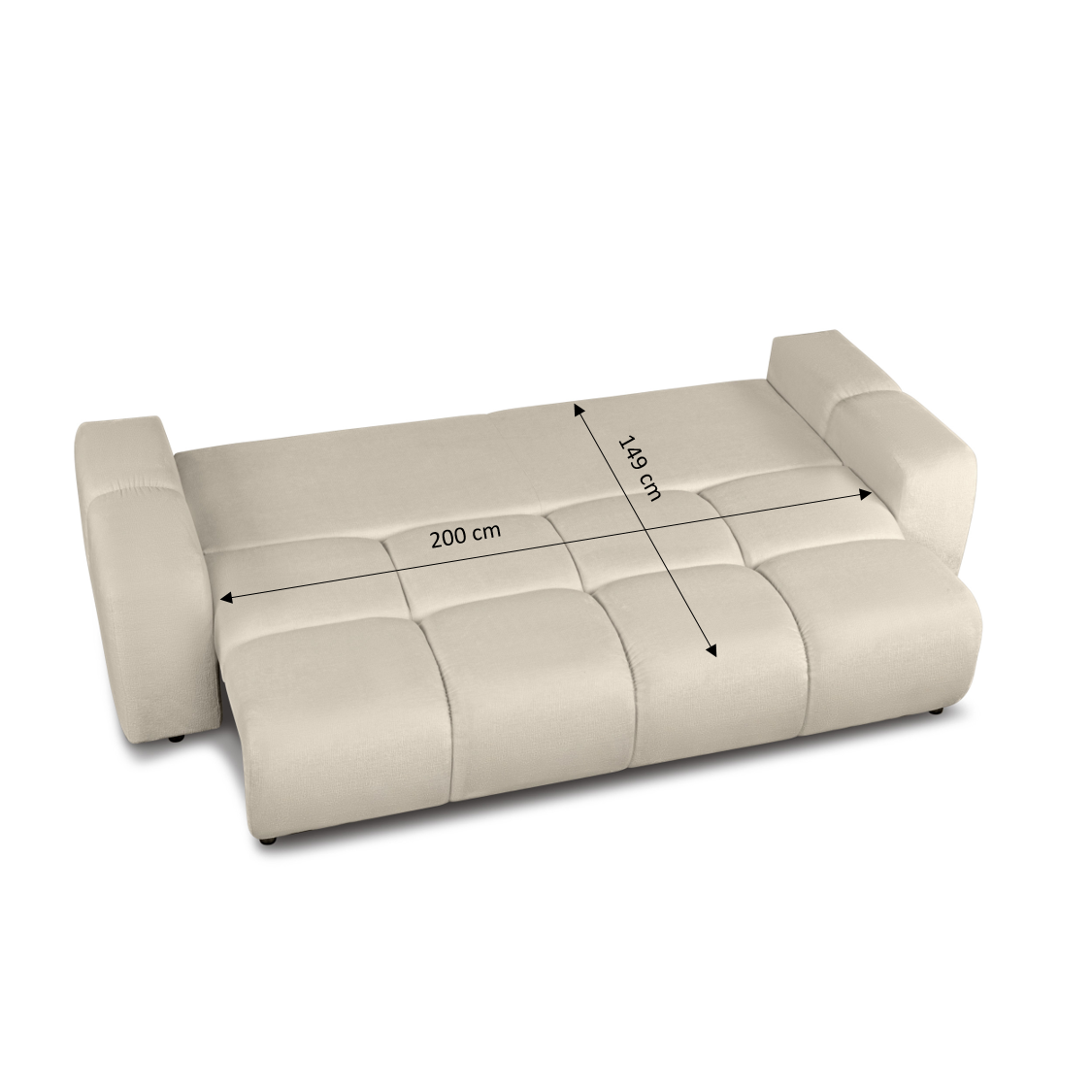 Ein geräumiges Sofa für gemeinsame Momente< Mit seiner Produktabmessung bietet es bequem Platz für 3 Personen, ideal zum Entspannen, Lesen oder für gemütliche Momente mit der Familie. Und wenn sich die Gelegenheit ergibt, lässt es sich leicht in ein 149 x 200 cm großes Doppelbett verwandeln, perfekt für spontane Gäste.