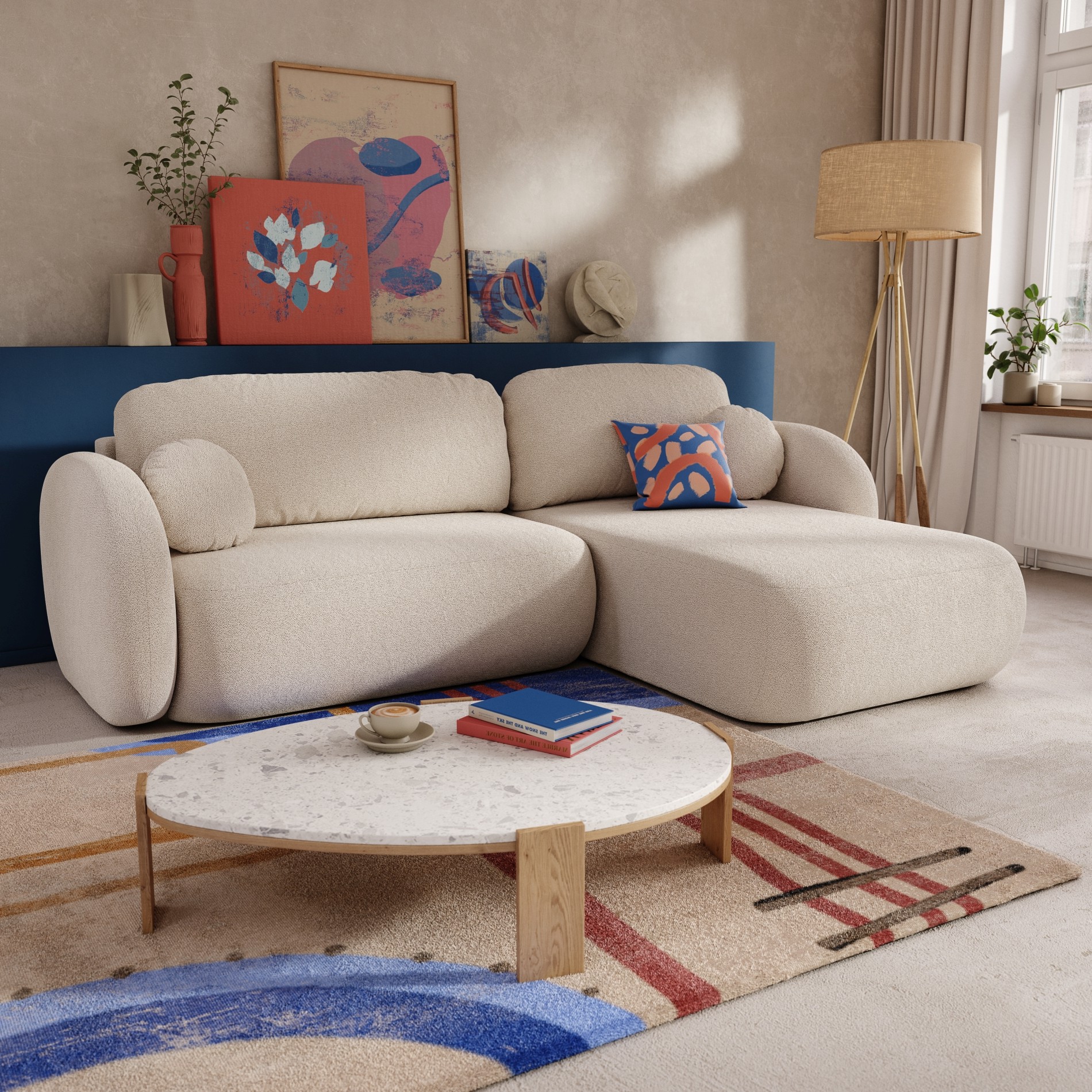 Das Ecksofa CARLOTTA wurde als Mittelpunkt Ihres Wohnzimmers konzipiert und vereint Ästhetik und Komfort. Seine großzügigen Rundungen, die abgerundeten Linien und die niedrige Sitzfläche schaffen eine einladende Atmosphäre, die zum Entspannen einlädt. Es ist ideal, um Familie oder Freunde zu versammeln, bietet 4 geräumige Sitzplätze und eine bequeme rechtwinklige Ecke, um gemütliche Momente zu teilen. Und für spontane Gäste lässt es sich ganz einfach in ein Zusatzbett für zwei Personen verwandeln.