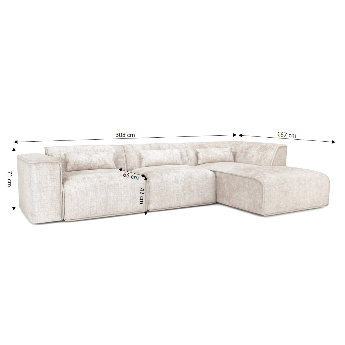 Das 5/6-Sitzer-Sofa NUNA ist ideal, um einen einladenden und funktionalen Raum zu schaffen. Mit seiner Eckform optimiert es den Platz im Wohnzimmer und bietet gleichzeitig eine große Sitzfläche, auf der Familie und Freunde zusammenkommen können. Seine Sitztiefe von 66 cm lädt zum Entspannen ein.