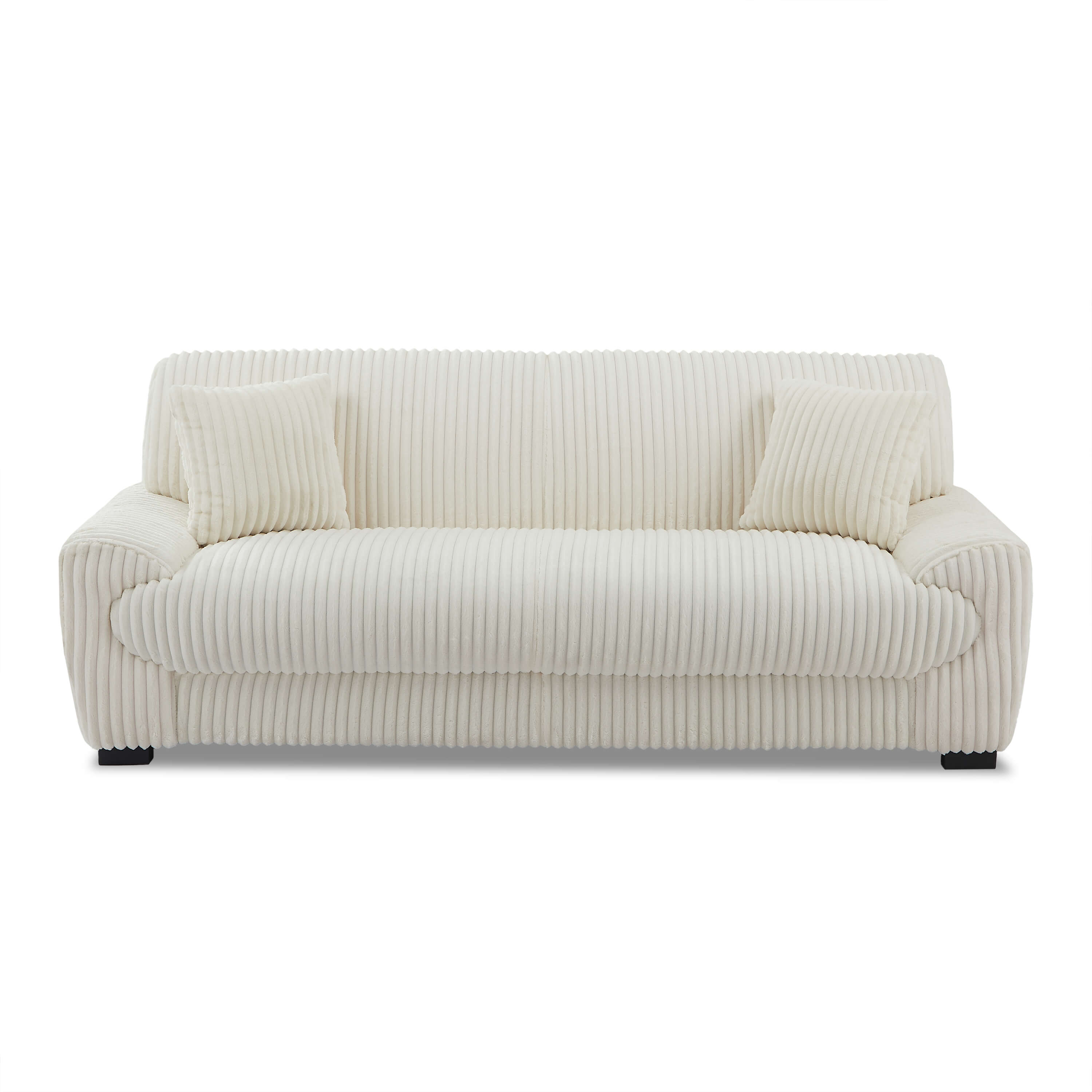 Dieses mit weichem Cord bezogene Sofa vereint Stil und Komfort. Die dezenten schwarzen Füße unterstreichen seinen zeitgemäßen Look, während die beiden mitgelieferten Zierkissen seine gemütliche und trendige Ausstrahlung verstärken. Das Sofa ADEA ist einfach zu montieren und passt sich leicht an verschiedene Einrichtungsstile an, von modern bis gemütlich.