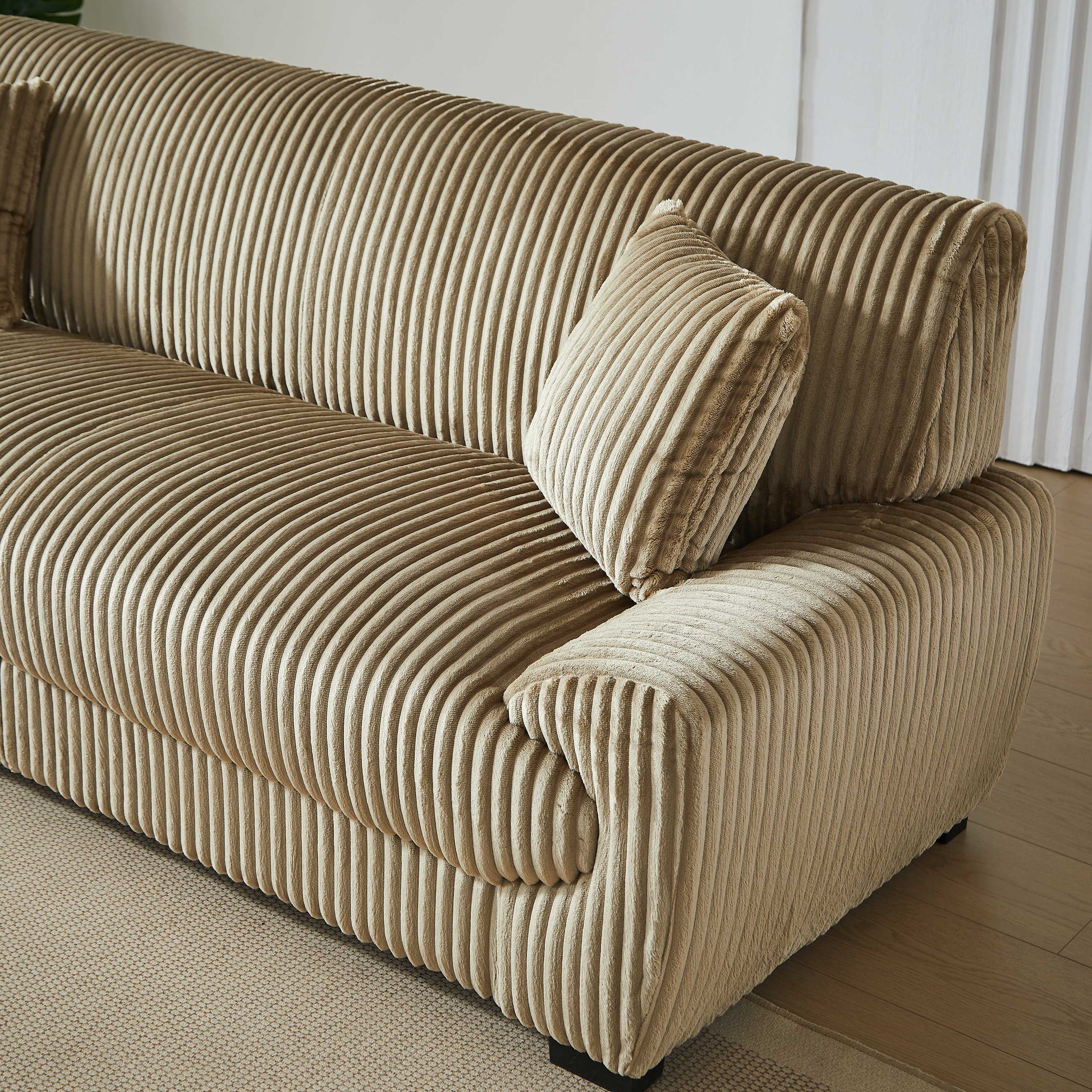 Entscheiden Sie sich für das 3-Sitzer-Sofa ADEA: trendiger, breiter Cord, gemütliche Sitzfläche und zwei mitgelieferte Zierkissen sorgen für eine warme und moderne Atmosphäre in Ihrem Wohnzimmer.