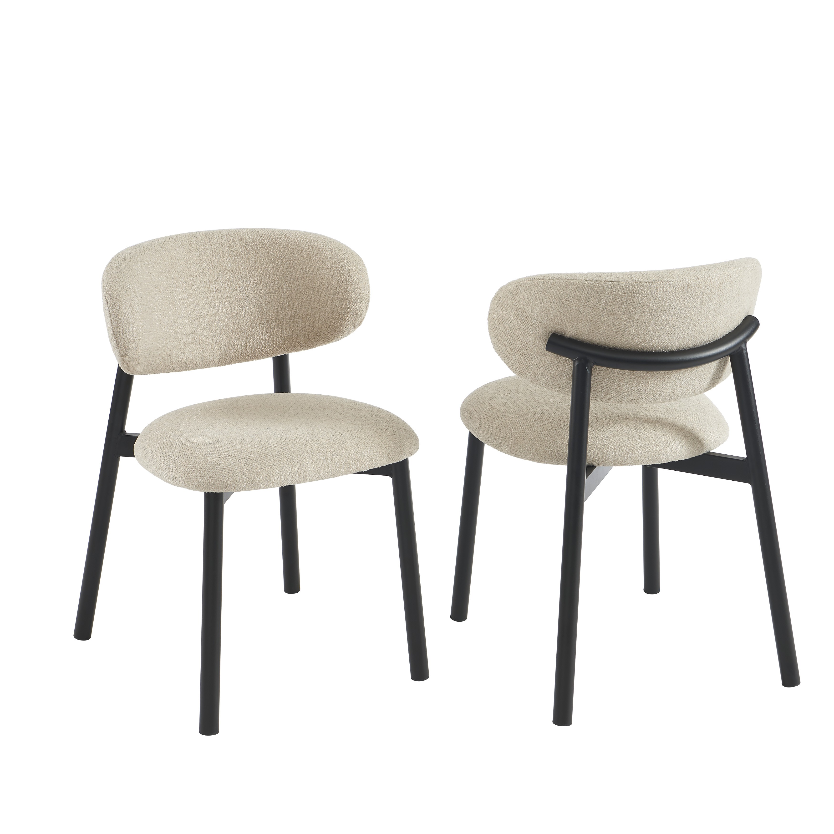 Optieren Sie sich für das 2er-Set CIARA Stühle, eine perfekte Kombination aus Modernität und Komfort. Mit ihrem beigefarbenen Bouclé-Stoffbezug verleihen diese Stühle Ihrem Zuhause einen weichen und warmen Touch. Der trendige Bouclé-Stoff ist schick und zeitlos zugleich und fügt sich harmonisch in ein Wohn- oder Esszimmer mit modernem, skandinavischem oder böhmischem Stil ein.