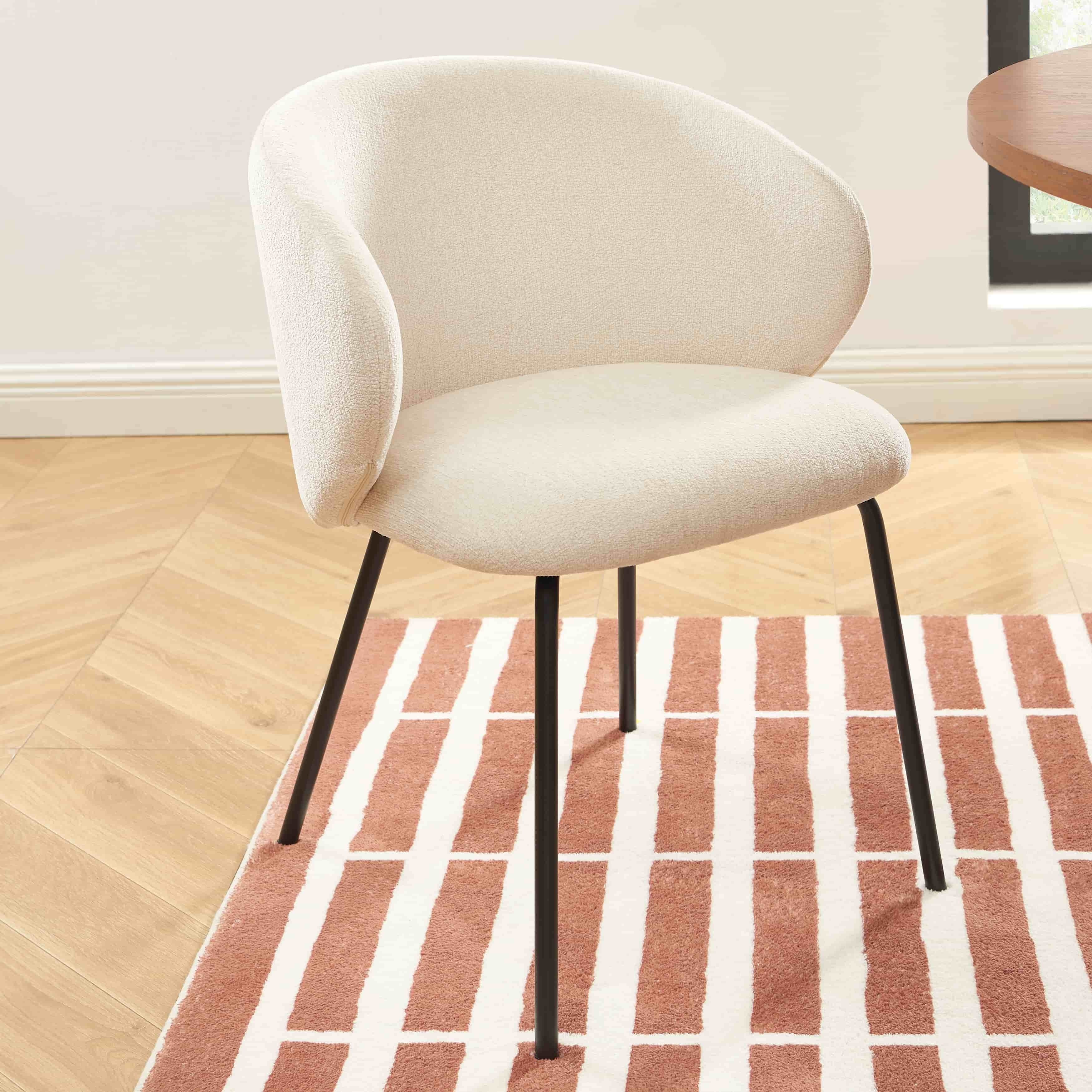 Diese Stühle haben 4 schwarze Metallbeine mit Kunststoffgleitern, um Ihre Böden zu schützen, und vereinen Robustheit und Stabilität. Jeder Stuhl ist bis zu 100 kg belastbar und bietet Ihnen eine zuverlässige und dauerhafte Sitzgelegenheit für den Alltag. Der Kontrast zwischen dem beigen Chenille-Gewebe und den schwarzen Beinen verleiht Ihrer Einrichtung eine elegante und moderne Note.