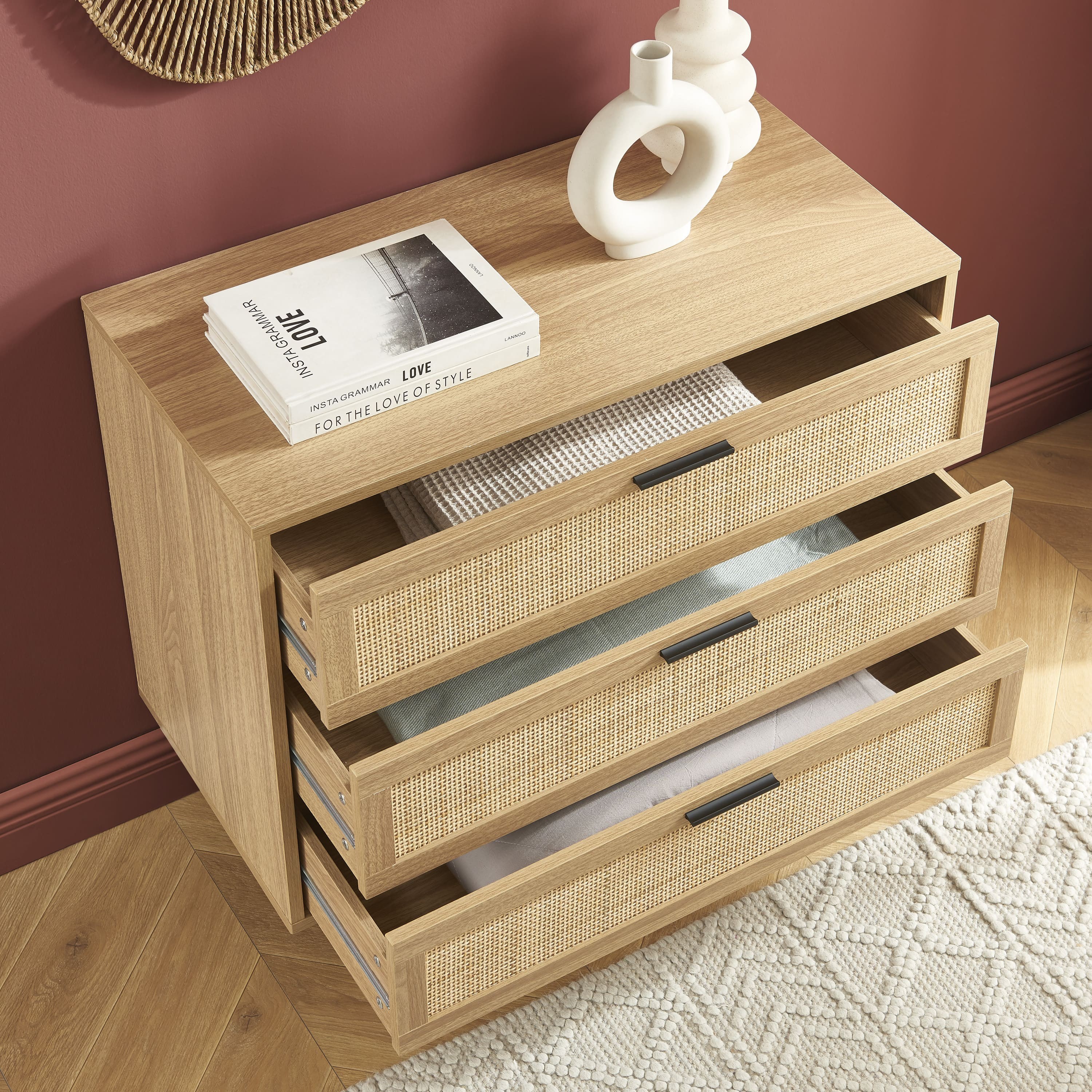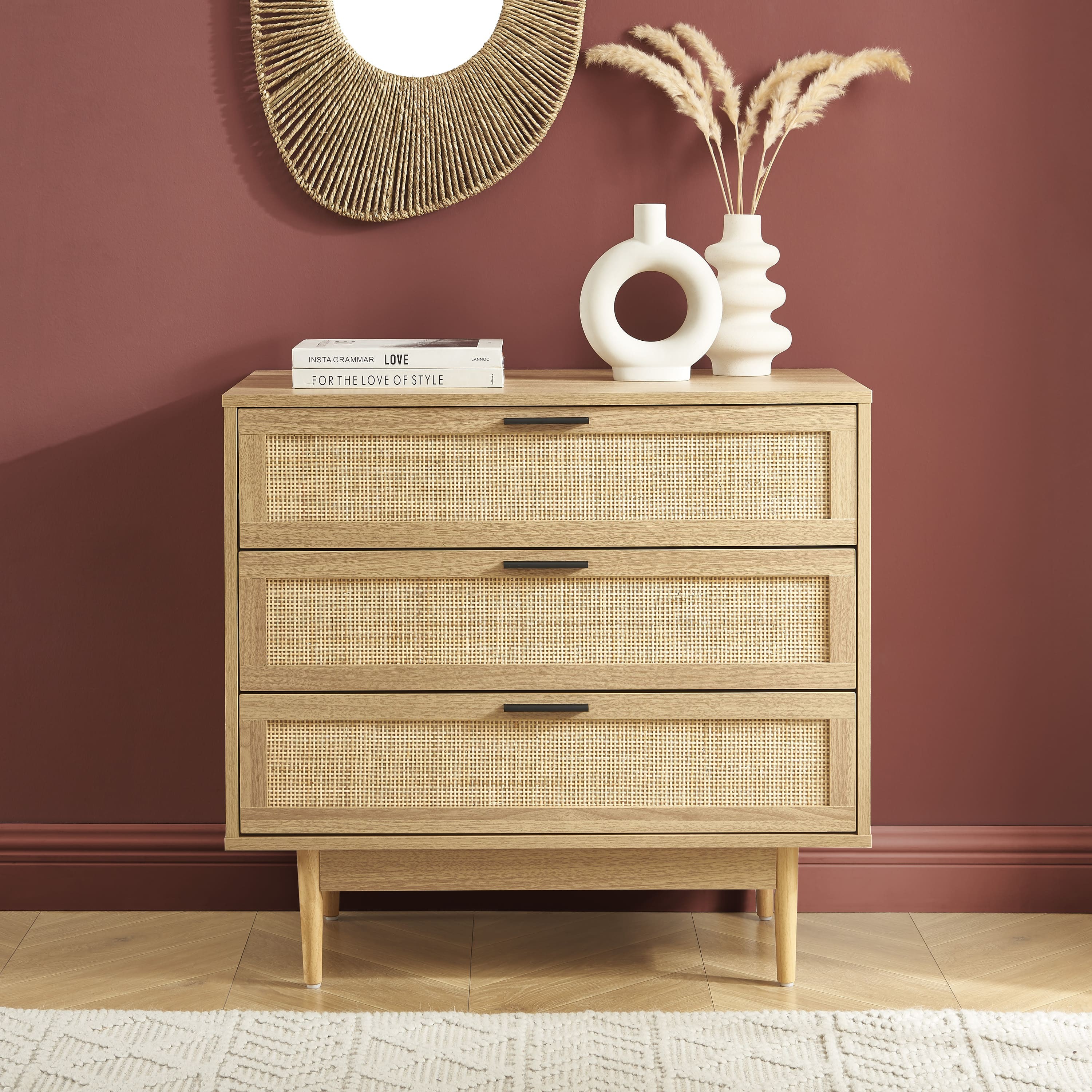 Die Kommode AMANA zeichnet sich durch ihr schickes Bohemian Design aus. Die Verkleidung aus Papierdekor in Holzoptik und die 3 Schubladen mit Rattangeflecht schaffen eine warme und einladende Atmosphäre. Diese Materialkombination verleiht dem Raum einen Hauch von Raffinesse und fügt sich harmonisch in verschiedene Einrichtungsstile ein.