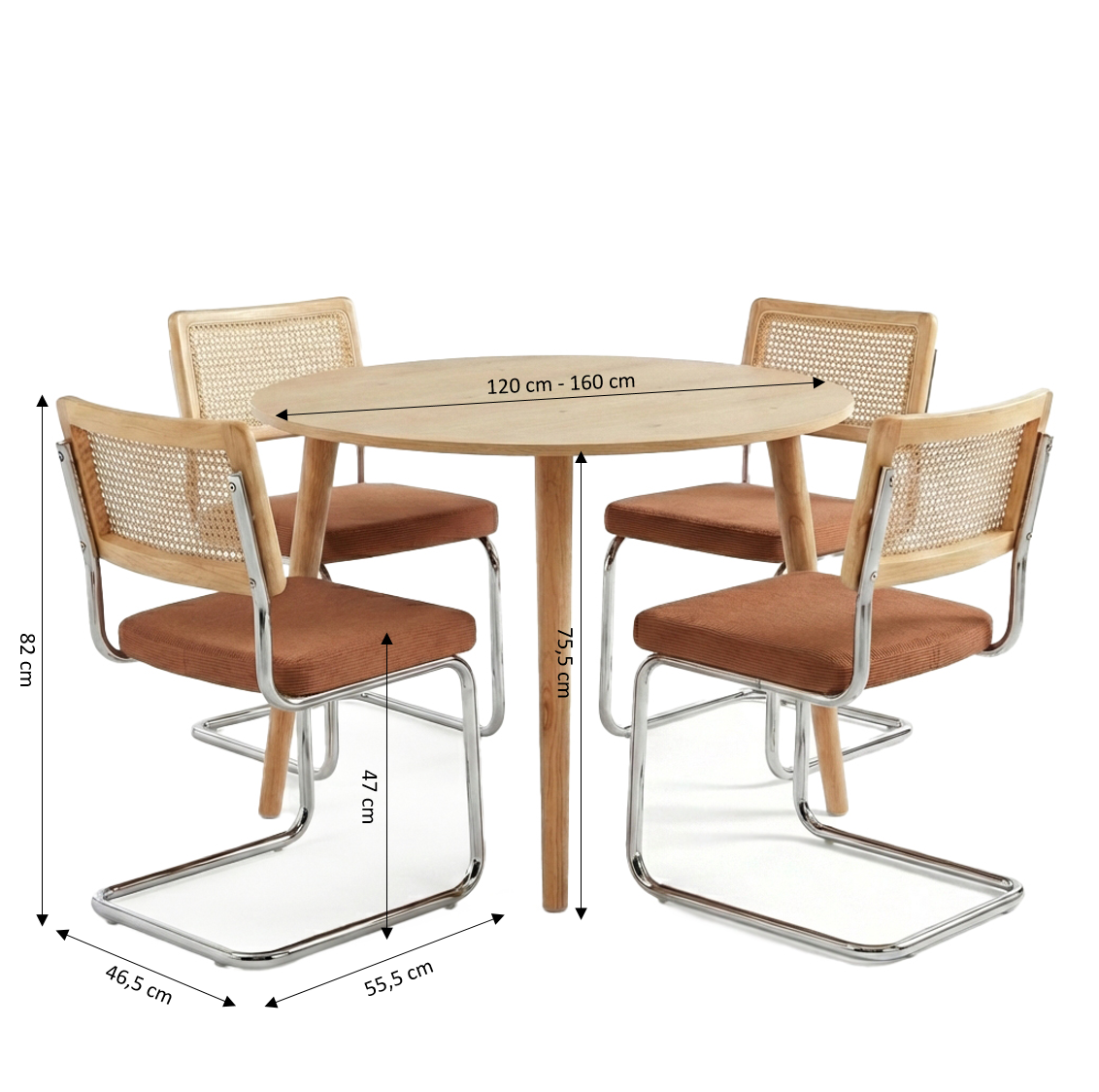Dieses Esszimmer-Set kombiniert einen ausziehbaren Tisch aus Eichenfurnier mit 4 Stühlen aus Cord mit Rückenlehne aus Rohrgeflecht und ist ideal, um einen gemütlichen Essbereich zu schaffen.