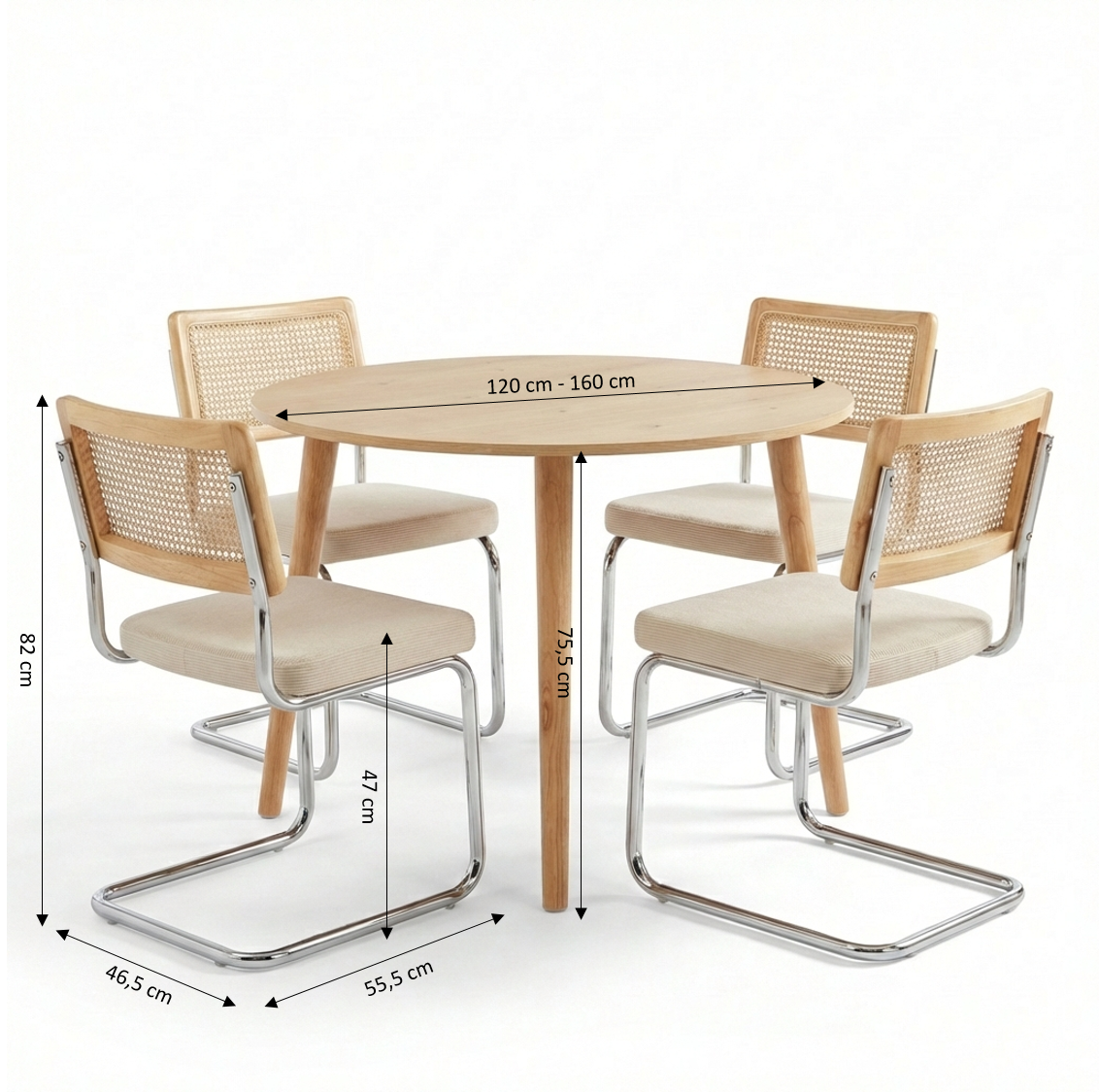 Dieses Esszimmer-Set kombiniert einen ausziehbaren Tisch aus Eichenfurnier mit 4 Stühlen aus Cord mit Rückenlehne aus Rohrgeflecht und ist ideal, um einen gemütlichen Essbereich zu schaffen.