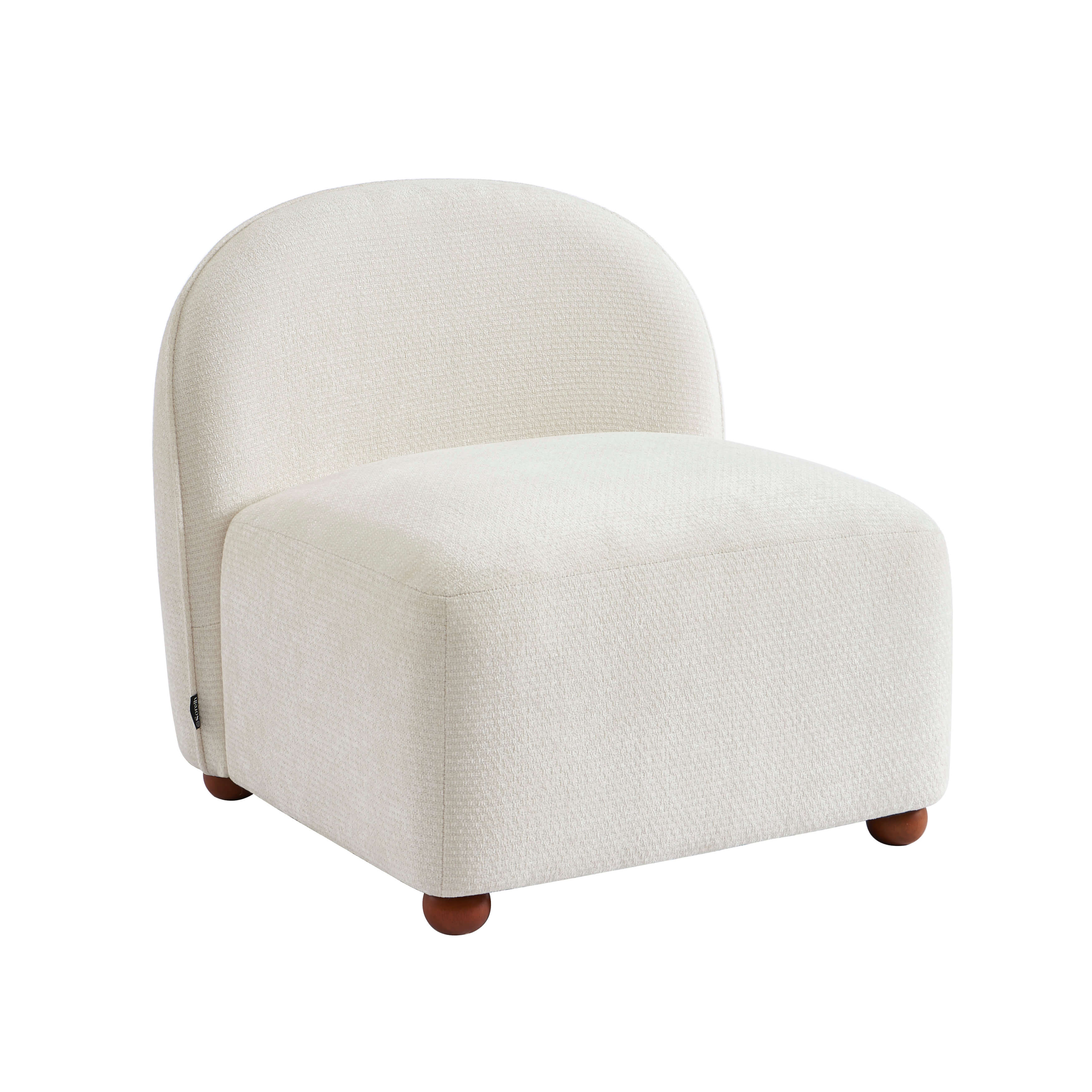 Sessel JUDY aus ecrufarbenem Chenille-Stoff mit nussbaumfarbenen Kugelfüßen
