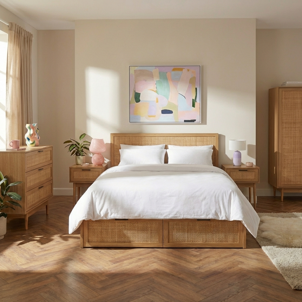 Das Schubladenbett AMANA verfügt über ein zeitloses Bohemian Design, das warme Eichenoptik mit natürlichem Rattangeflecht verbindet. Diese Materialkombination schafft eine weiche und einladende Atmosphäre in Ihrem Schlafzimmer.