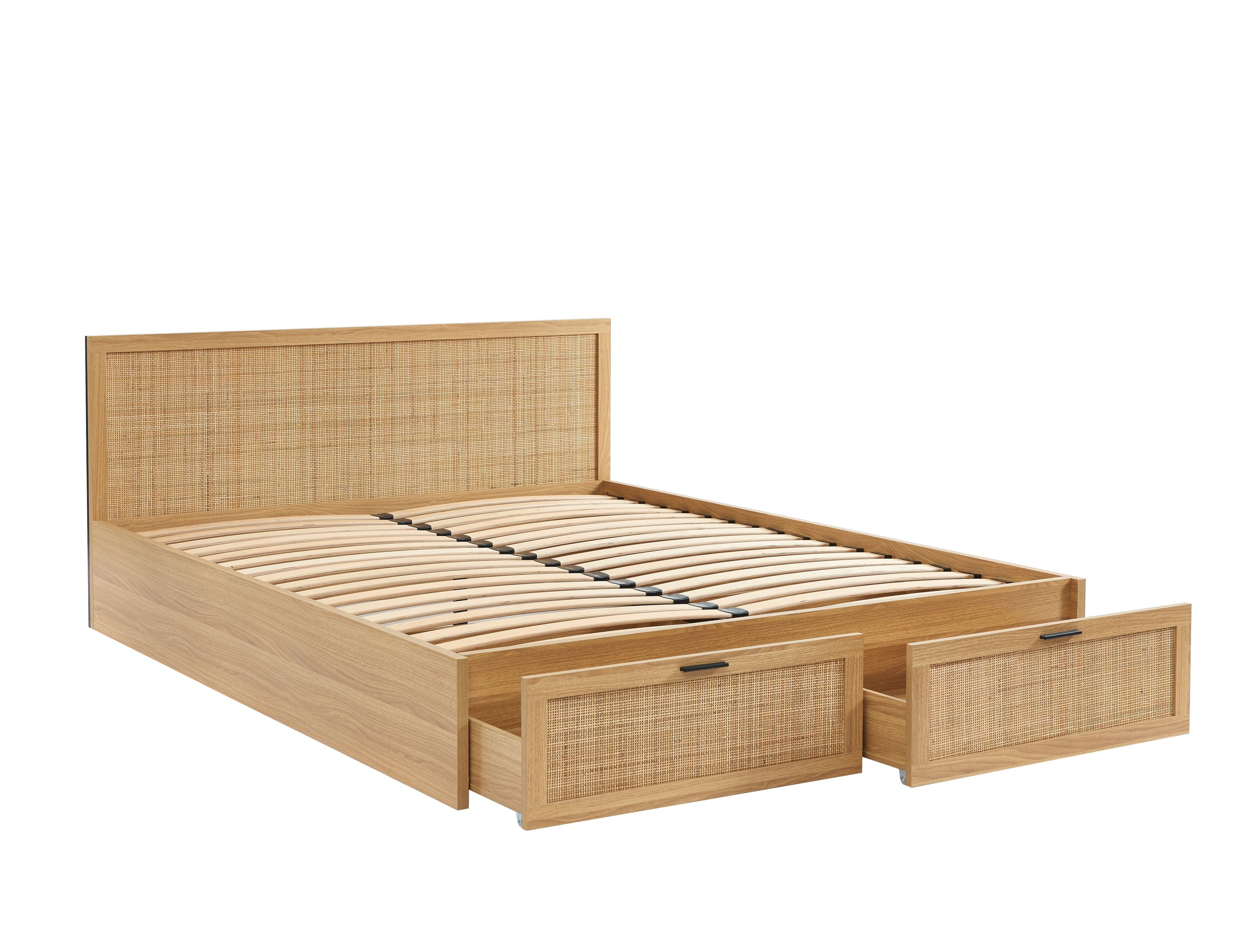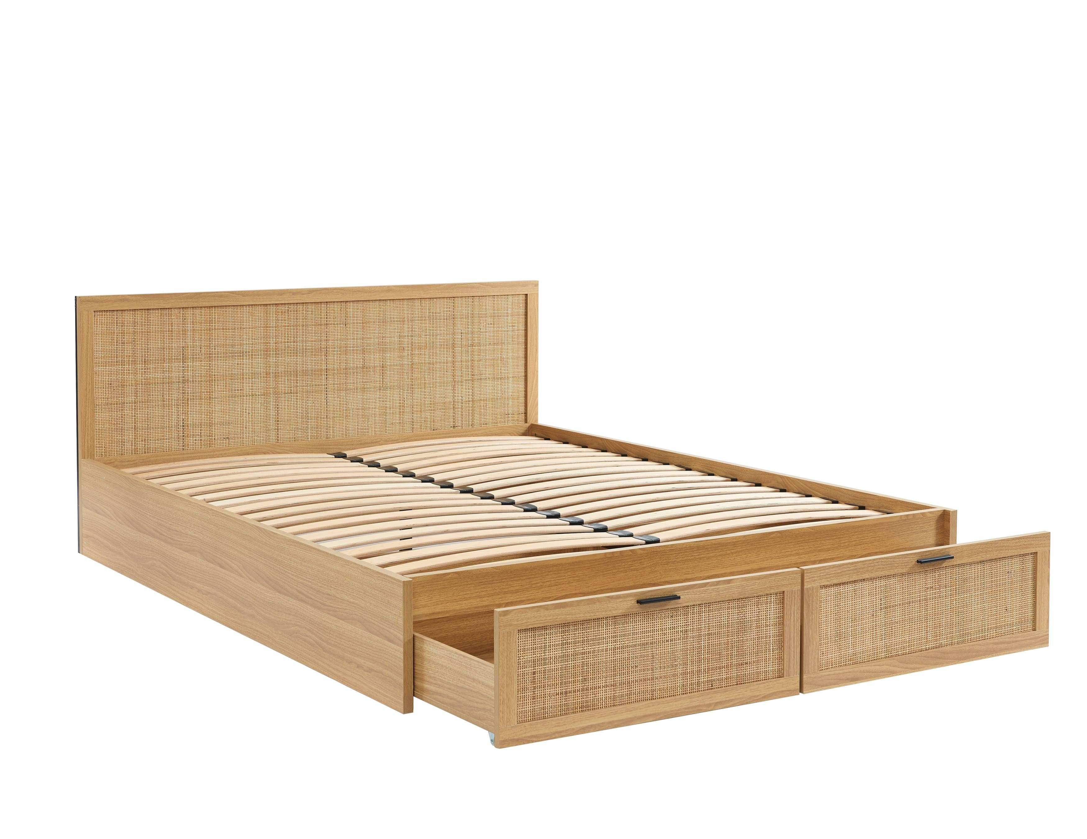 Das Schubladenbett AMANA verfügt über ein zeitloses Boho-Design, das warmes Eichenholzdekor mit natürlichem Rattanrohrgeflecht verbindet. Diese Materialkombination schafft eine weiche und einladende Atmosphäre in Ihrem Schlafzimmer.