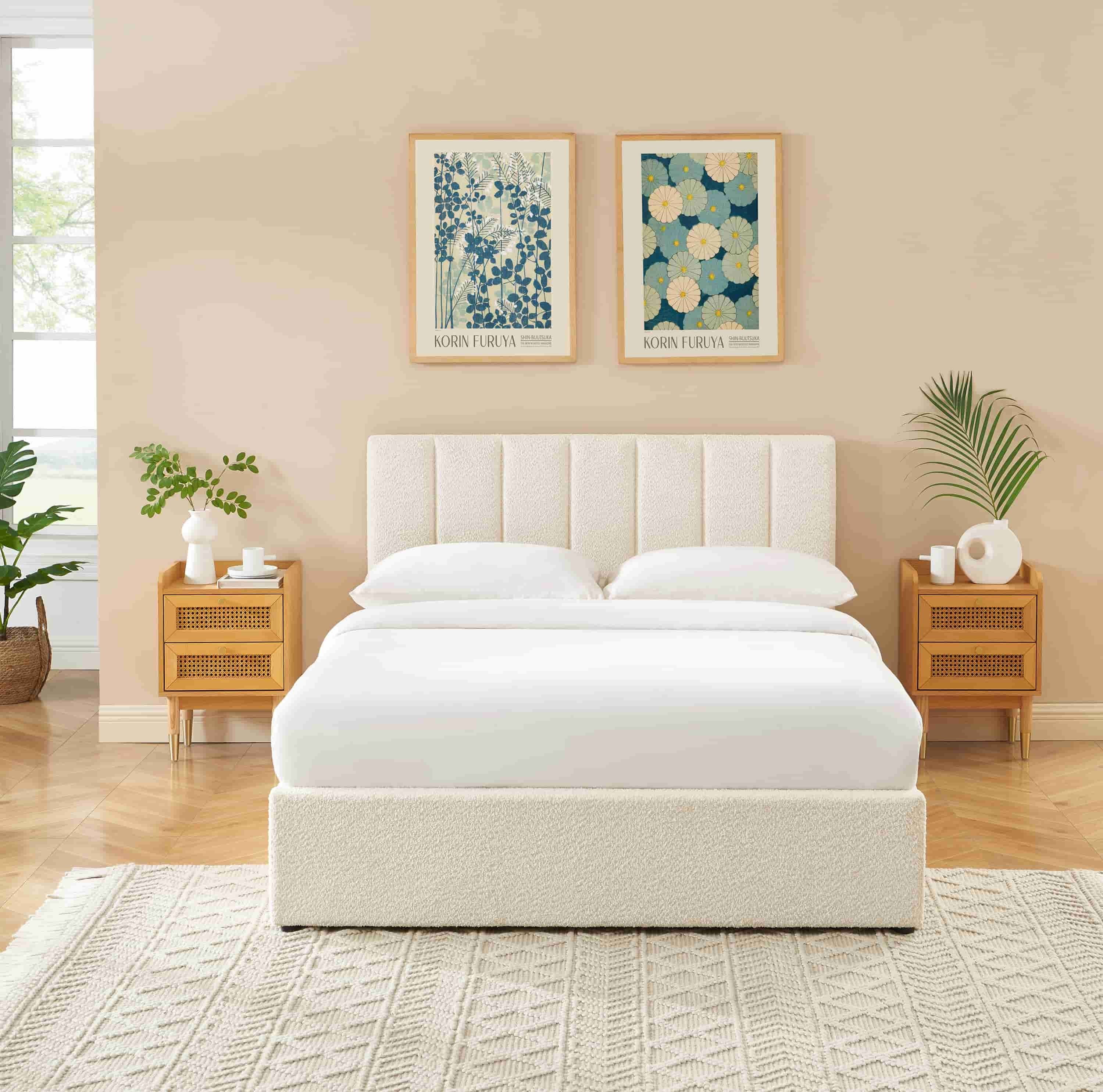 Verbinden Sie Eleganz und Funktionalität mit dem Kastenbett MARIUS. Mit einem Bezug aus ungebleichtem Bouclé-Stoff verleiht dieses Bett Ihrem Schlafzimmer eine warme und moderne Note. Der klare Stil fügt sich leicht in eine moderne, skandinavische oder minimalistische Einrichtung ein und bietet optimalen Komfort für ruhige Nächte.
