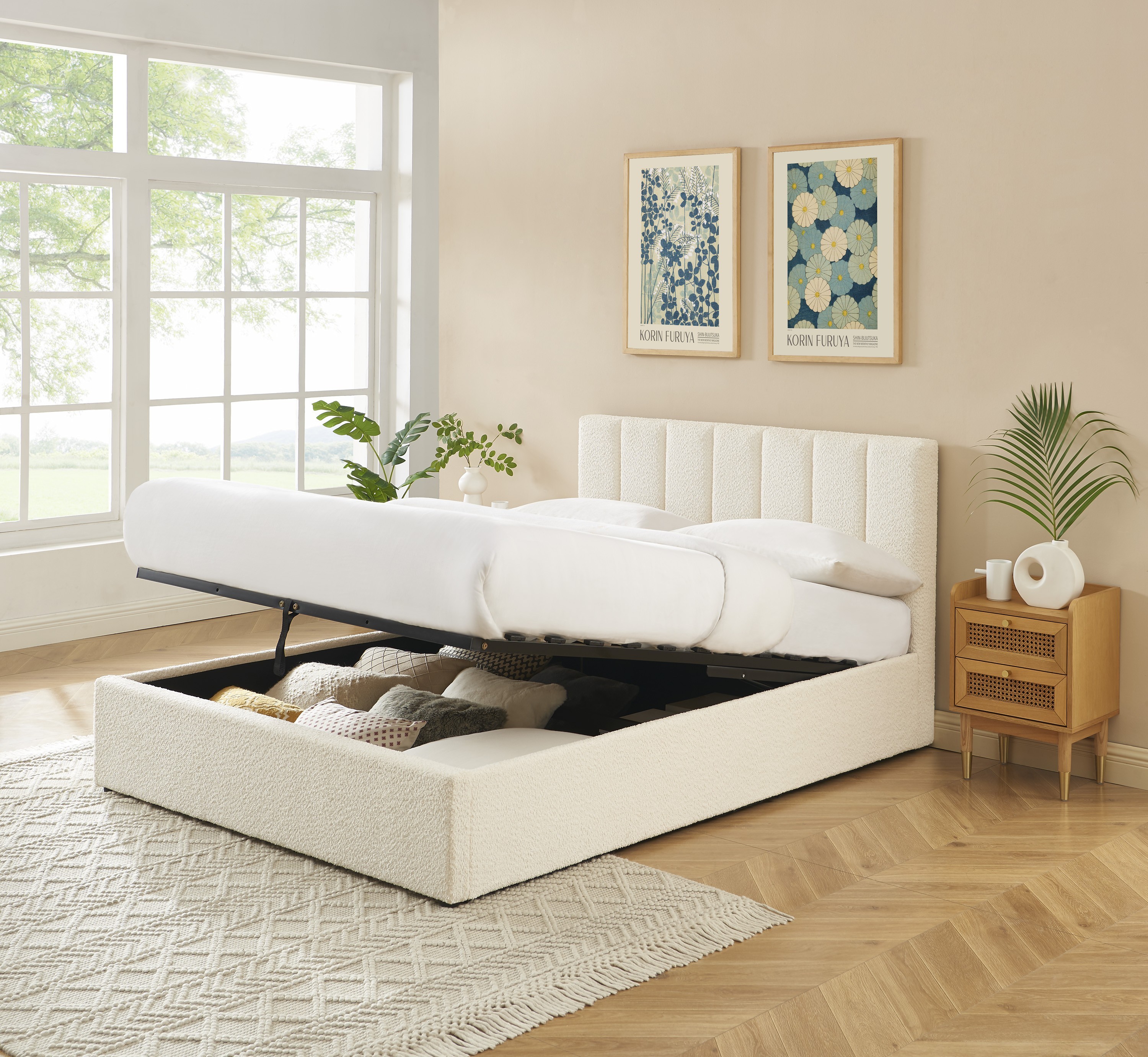 Der ungebleichte Bouclé-Stoff verleiht dem Bett MARIUS eine weiche und trendige Textur, die mit jedem Einrichtungsstil harmoniert. Das leicht geneigte und gepolsterte Kopfteil bietet zusätzlichen Komfort und ist perfekt für entspannende Momente wie Lesen oder Filme schauen.
