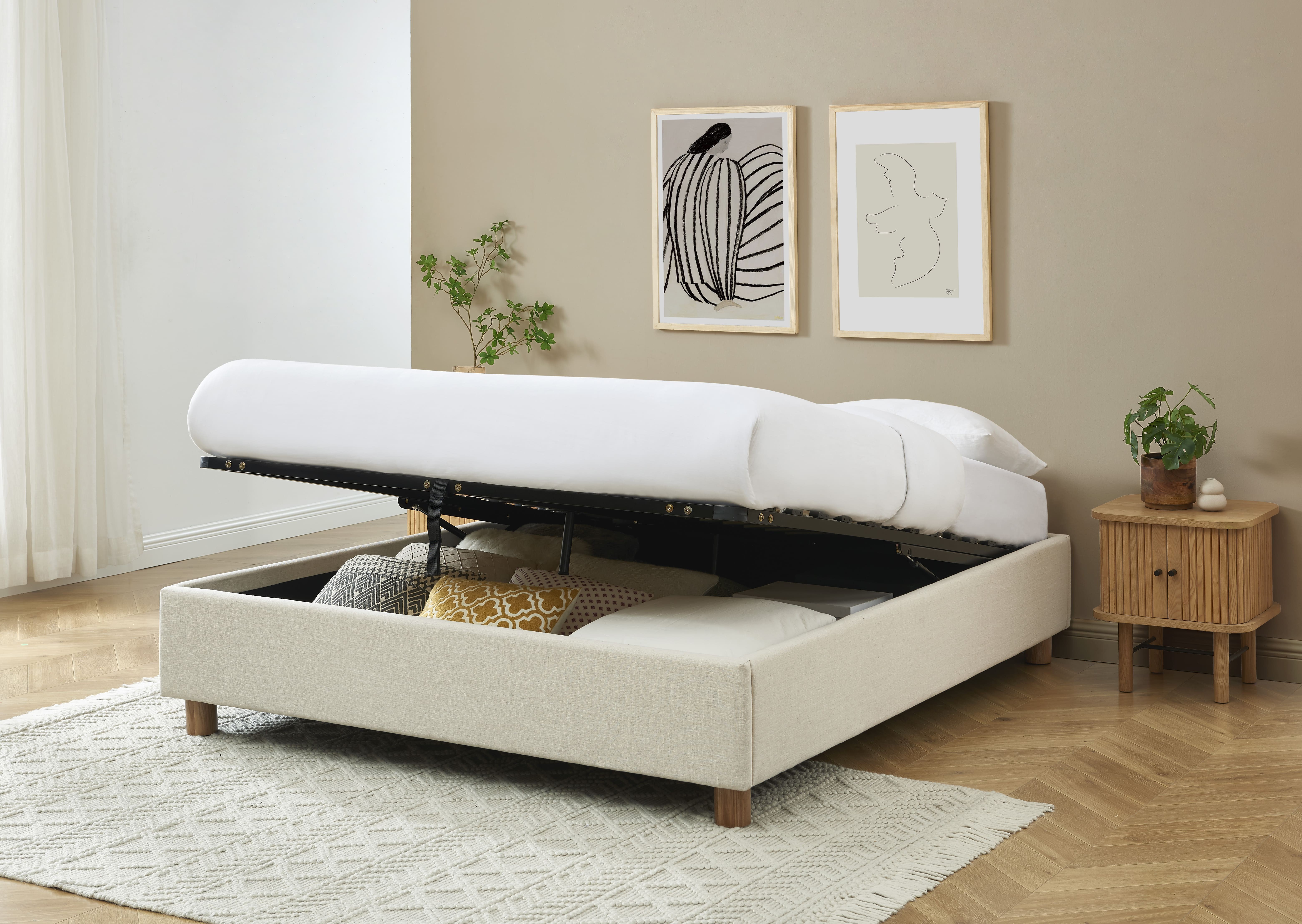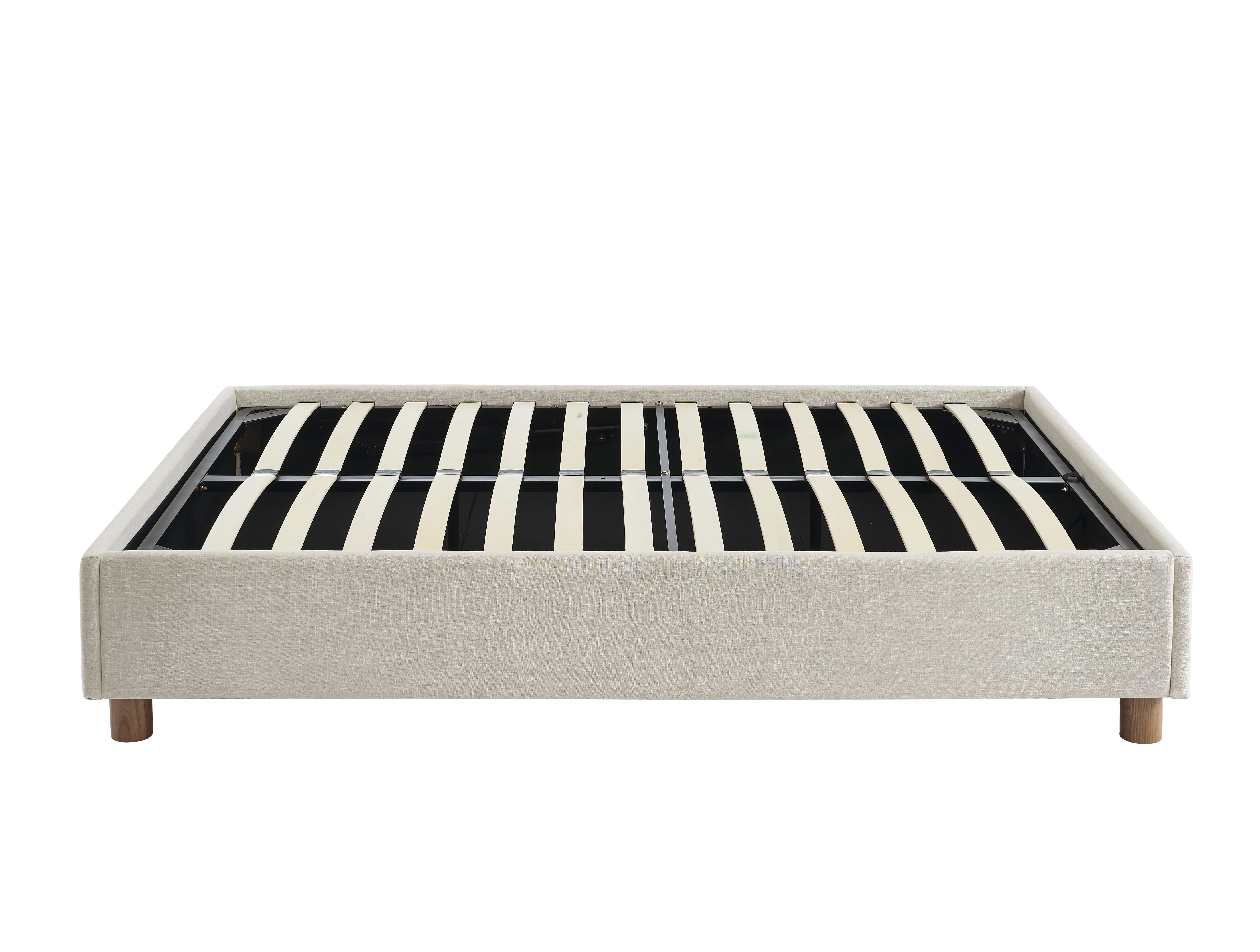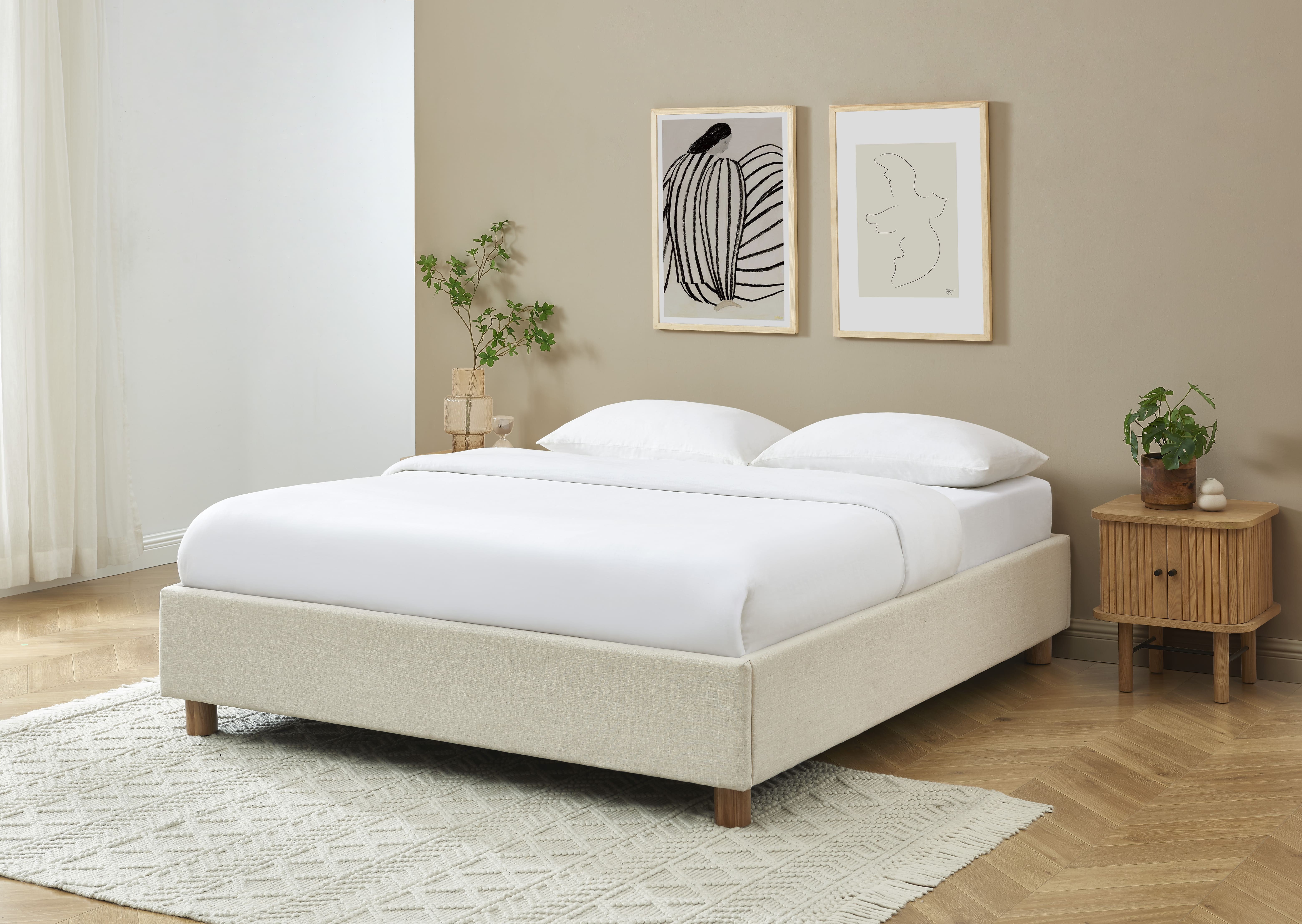 Der beige Leinenstoffbezug ist nicht nur praktisch, sondern auch ein echter Trendsetter! Was ist das Besondere an diesem Kastenbett? Die abgerundeten Füße aus massiver Esche, modern und natürlich.