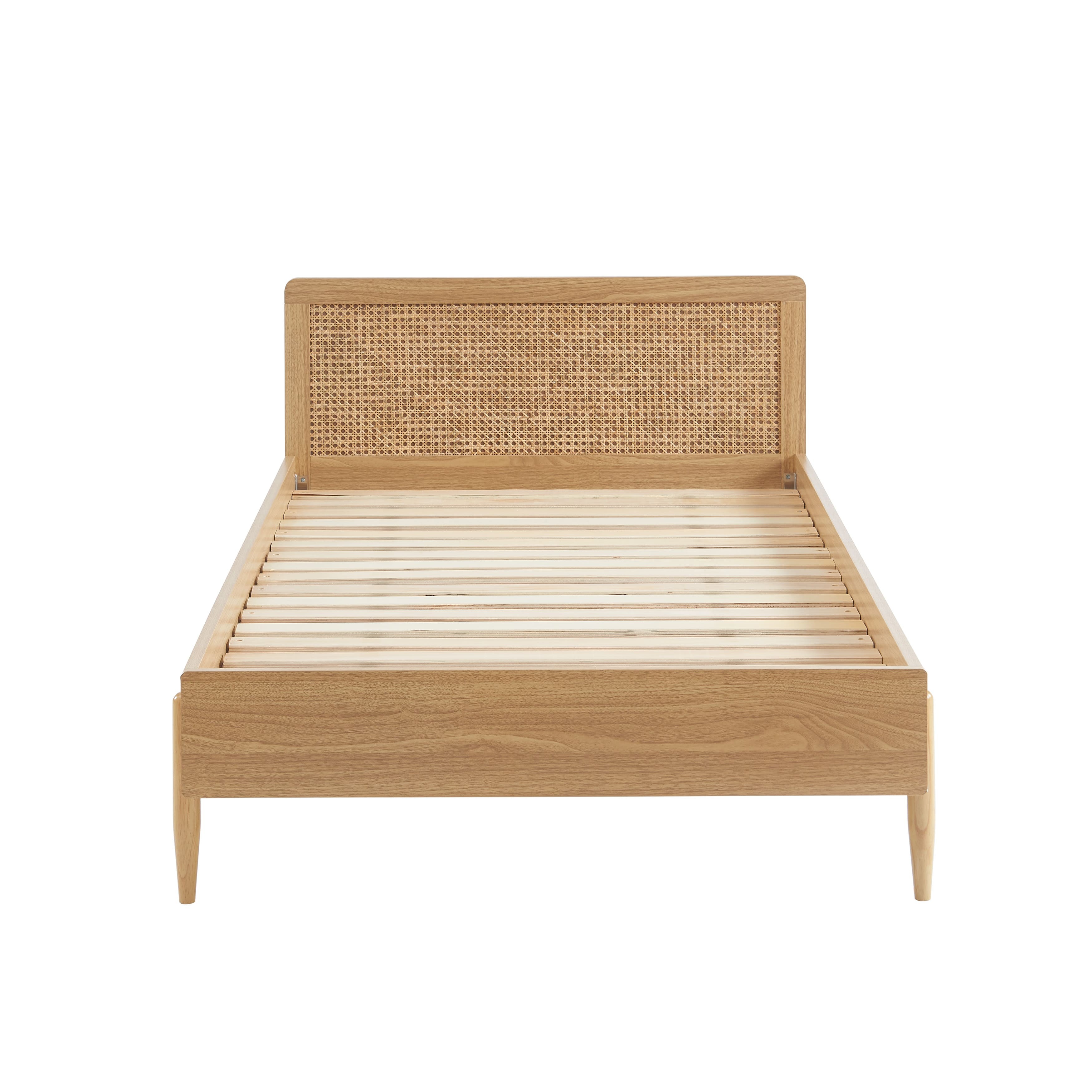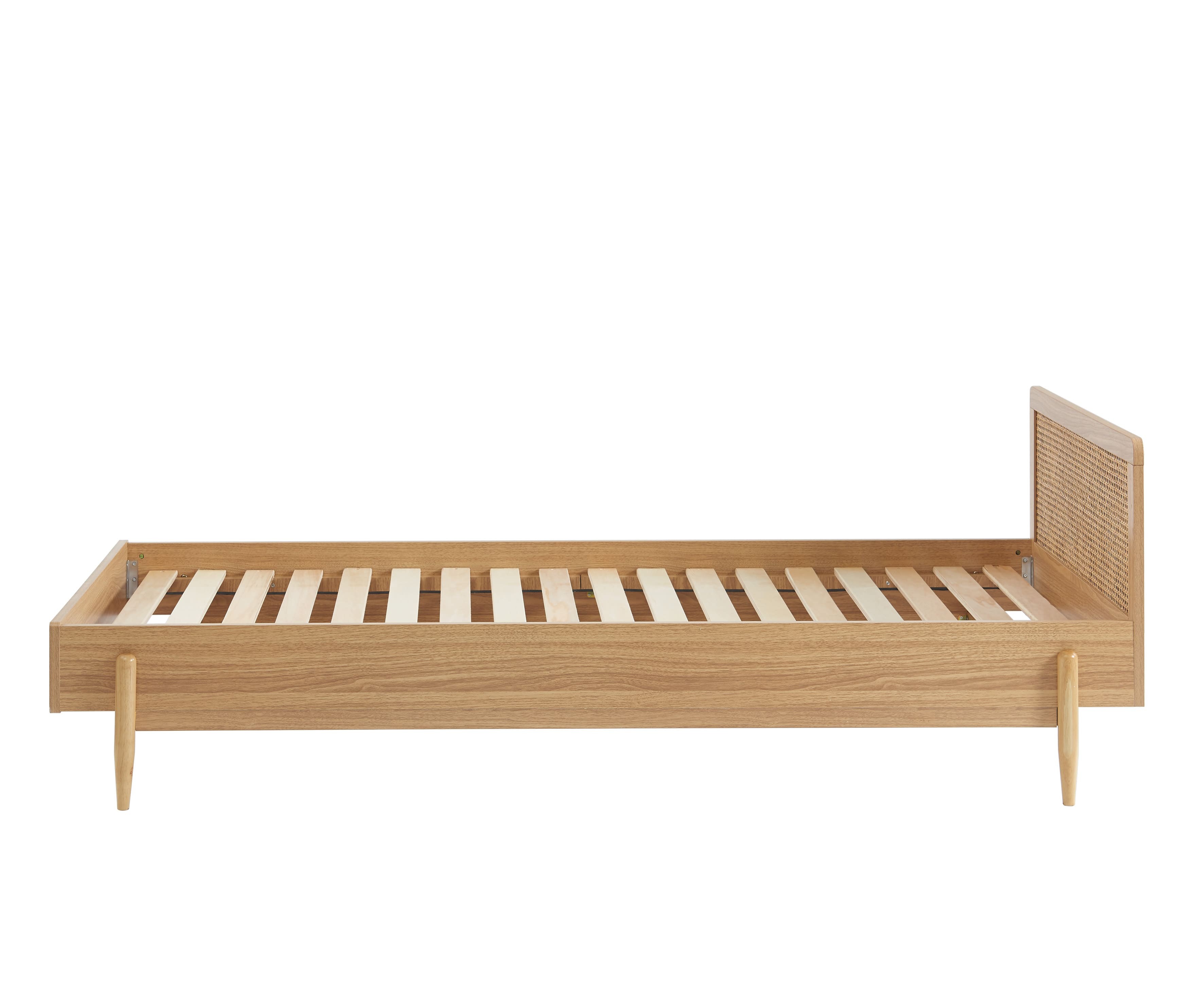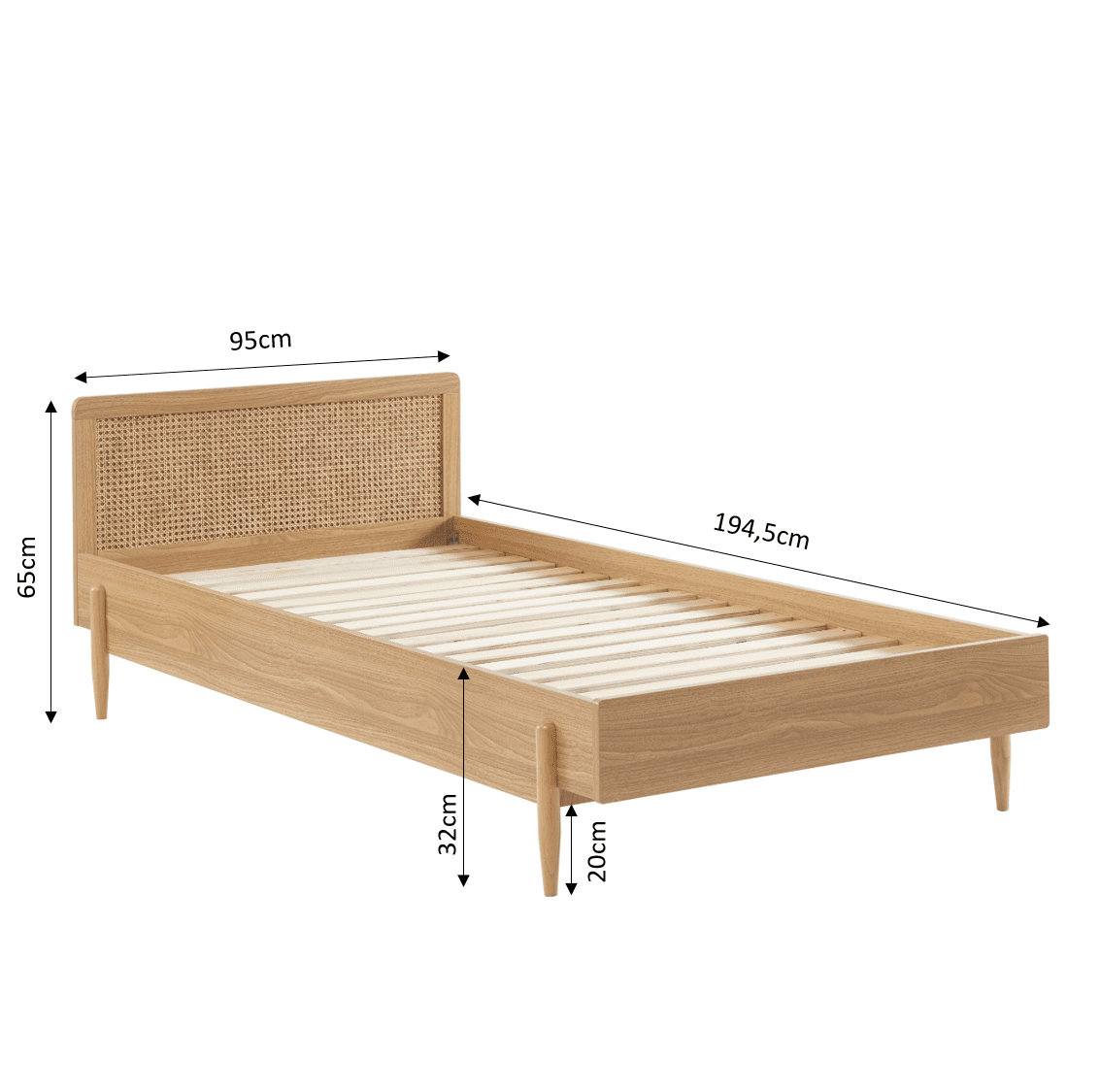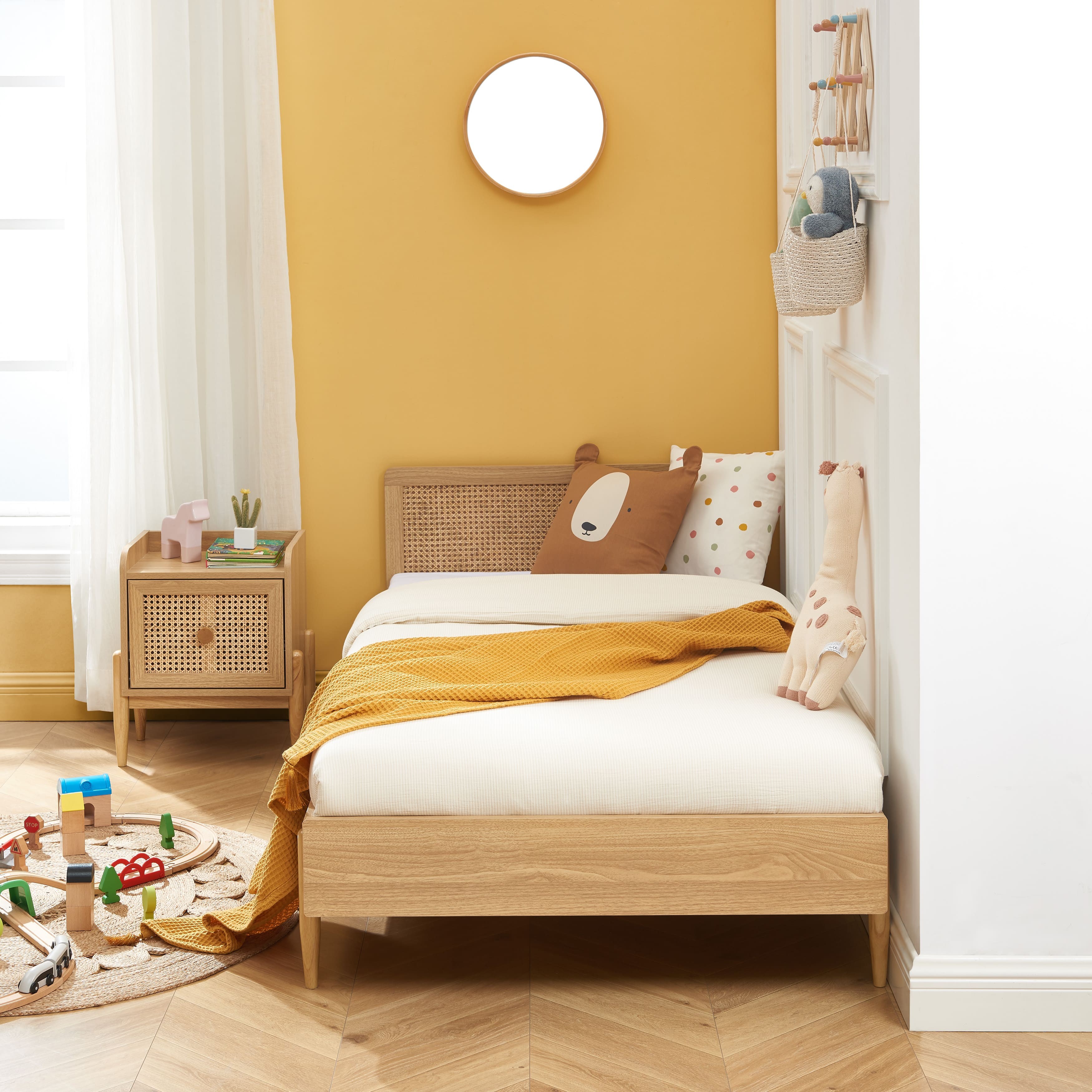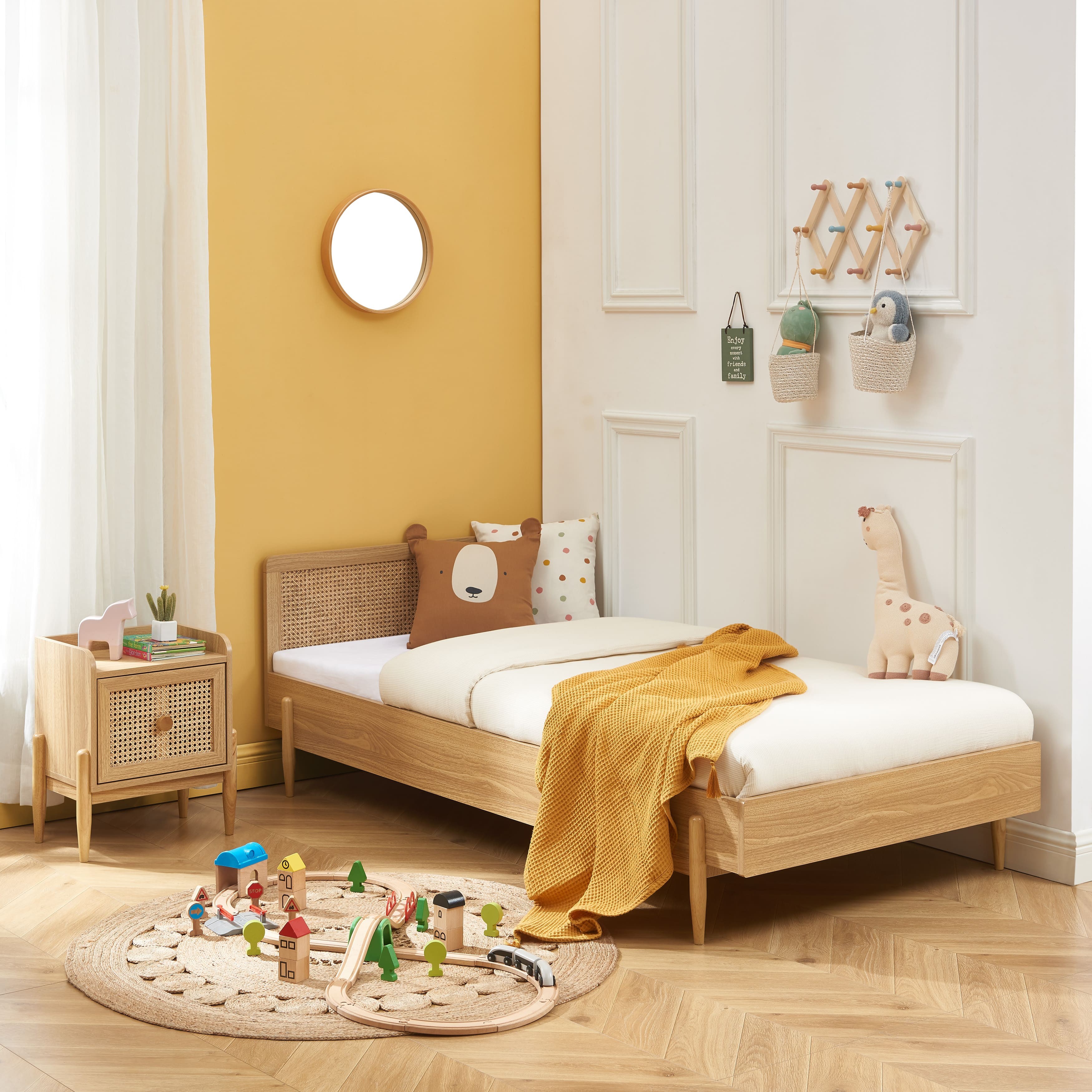 Das Kinderbett PABLO zeichnet sich durch sein warmes und einladendes Boho-Design aus, das den Dekorpapierbezug in Eichenoptik und das kreisförmige Rohrgeflecht am Kopfteil harmonisch miteinander kombiniert. Dieser Boho-Stil verleiht dem Kinderzimmer einen weichen und fantasievollen Touch und passt perfekt zu verschiedenen Einrichtungsstilen.
