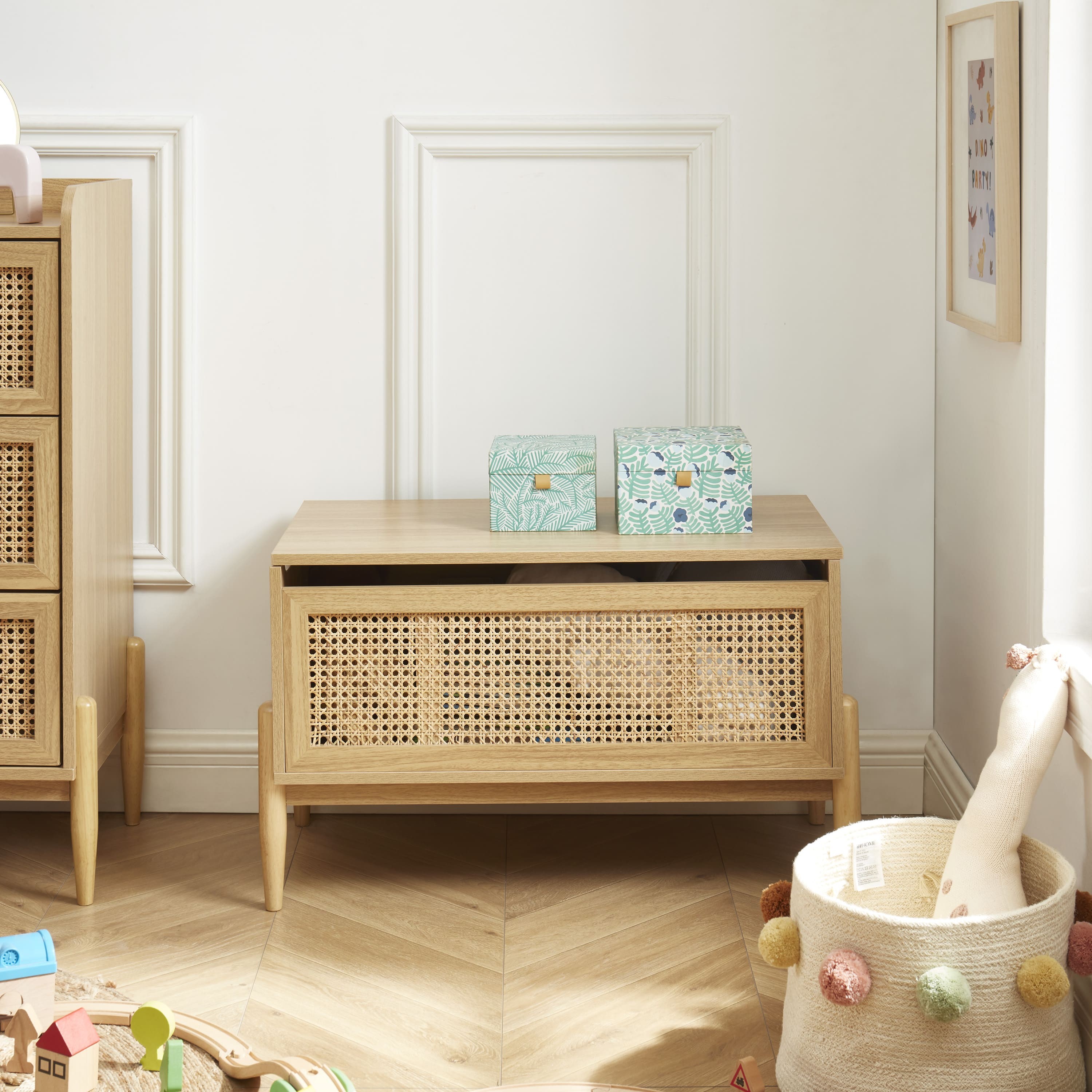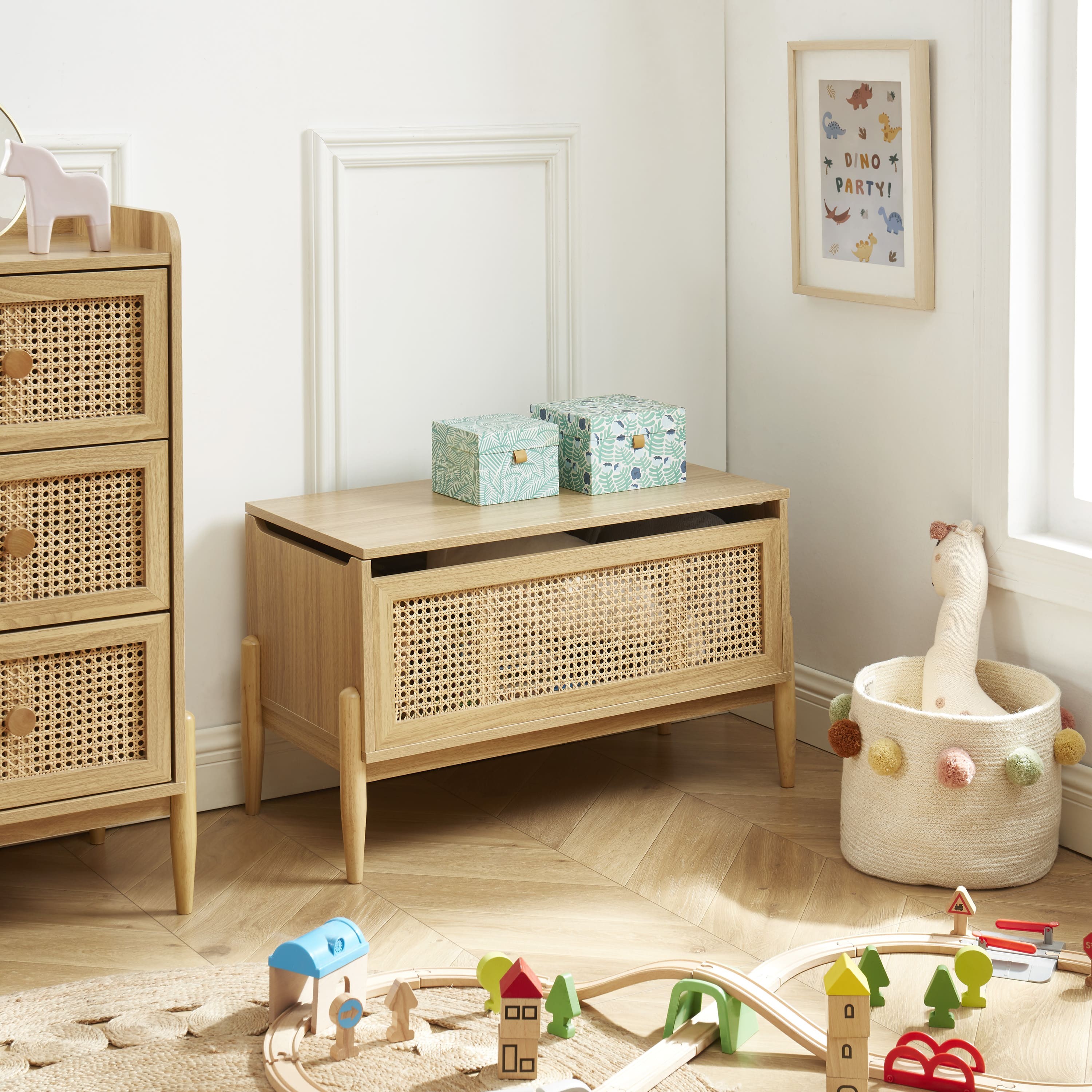 Die Spielzeugtruhe PABLO verfügt über einen großen inneren Stauraum, der über den Deckel zugänglich ist und sich ideal für die Aufbewahrung von Kuscheltieren, Brettspielen und Spielsachen Ihrer Kinder eignet. Darüber hinaus verfügt sie über eine praktische Schublade mit einer Verkleidung aus echtem Rohrgeflecht, die sich perfekt für die Aufbewahrung kleiner Gegenstände oder Accessoires Ihrer Kinder eignet.