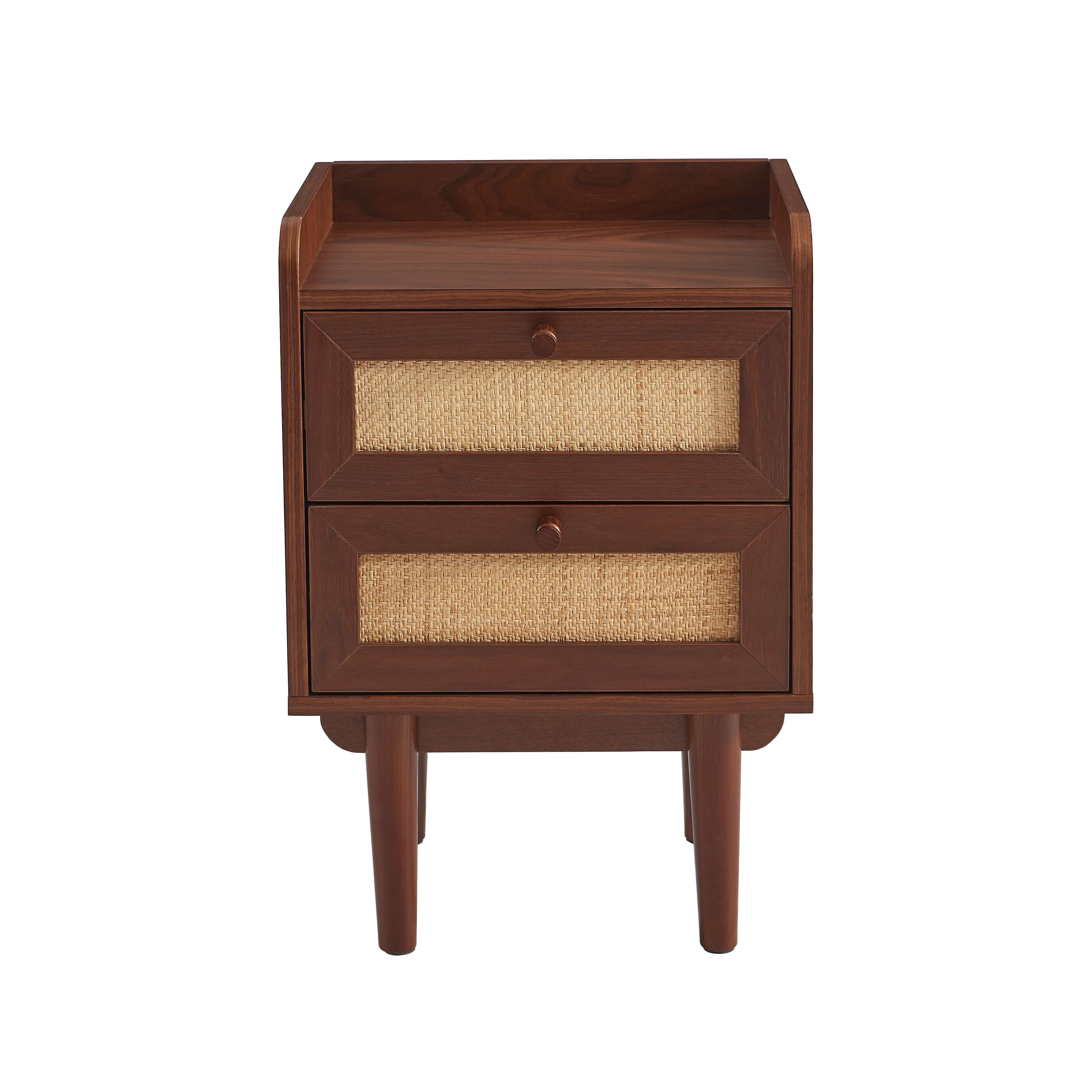 Der Nachttisch LEON aus Walnussfurnier und Rohrgeflecht ist ein kompaktes und raffiniertes Möbelstück, das Stauraum mit einem natürlichen Stil in Ihrem Schlafzimmer verbindet.