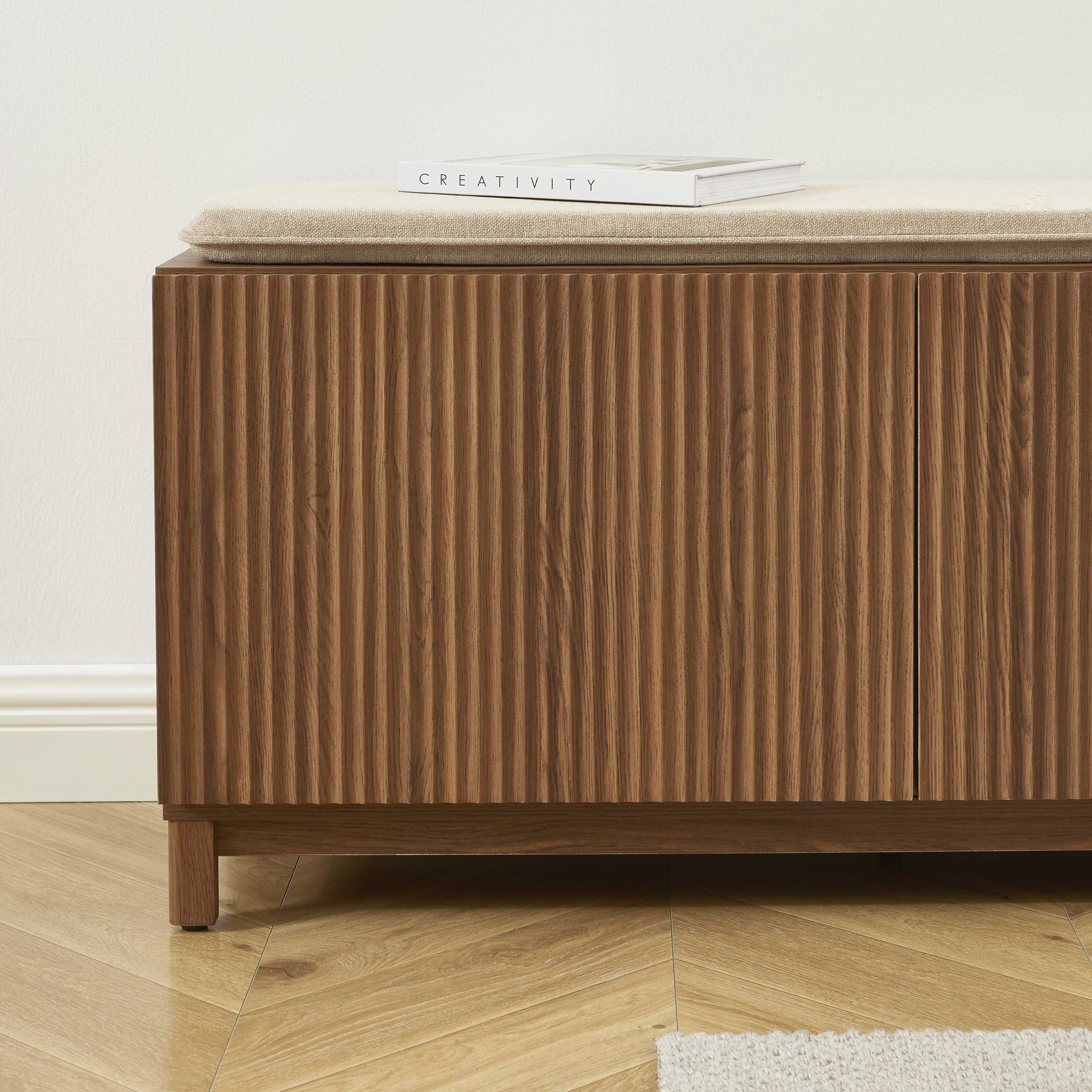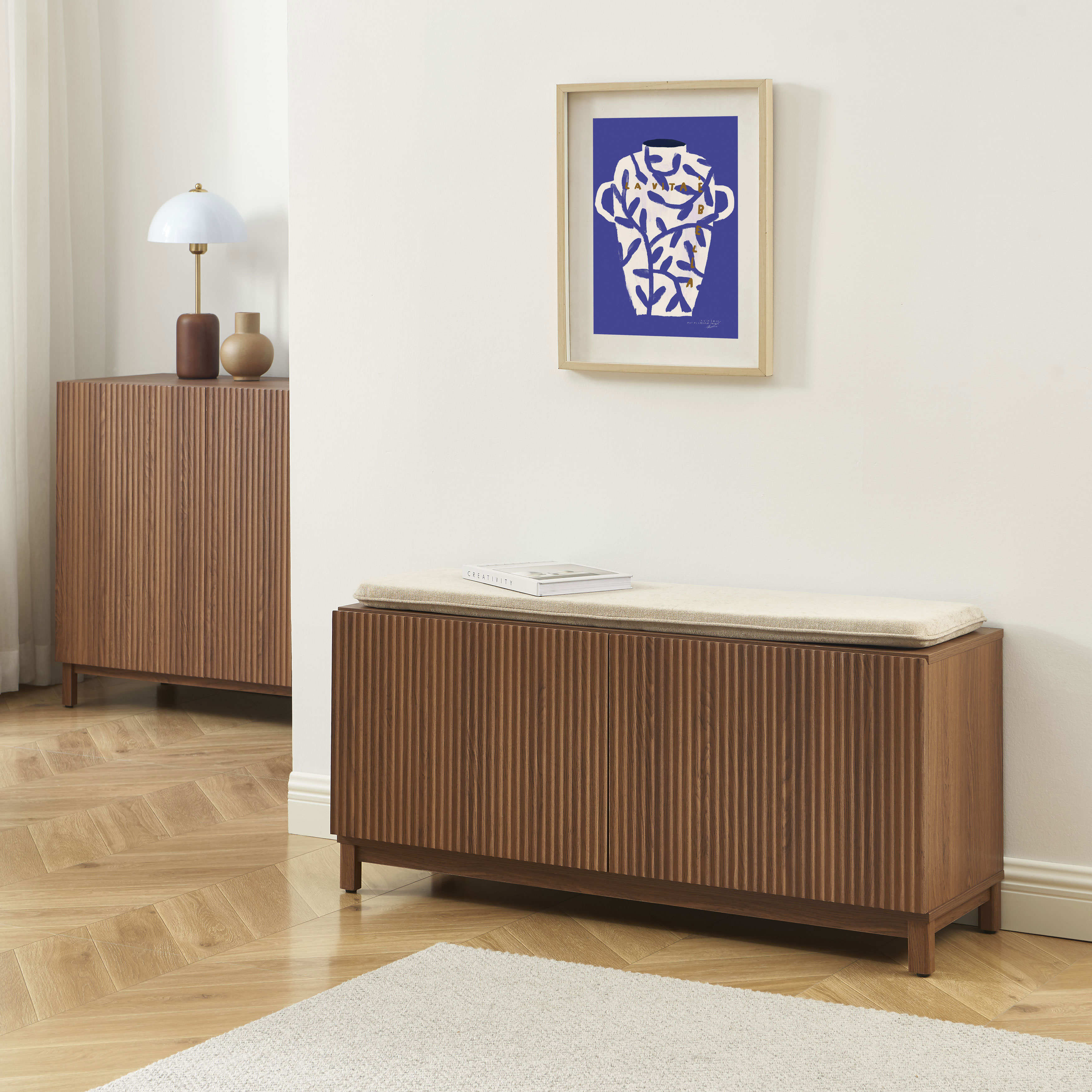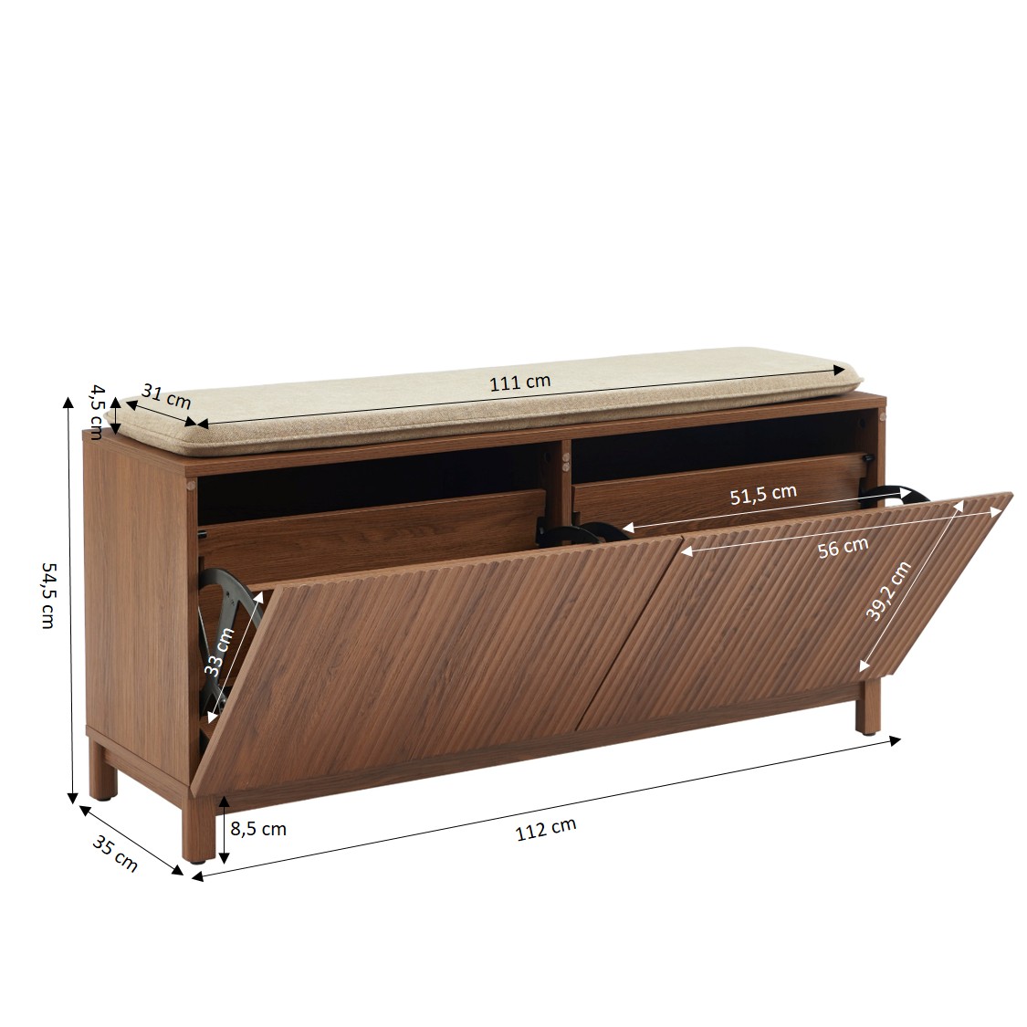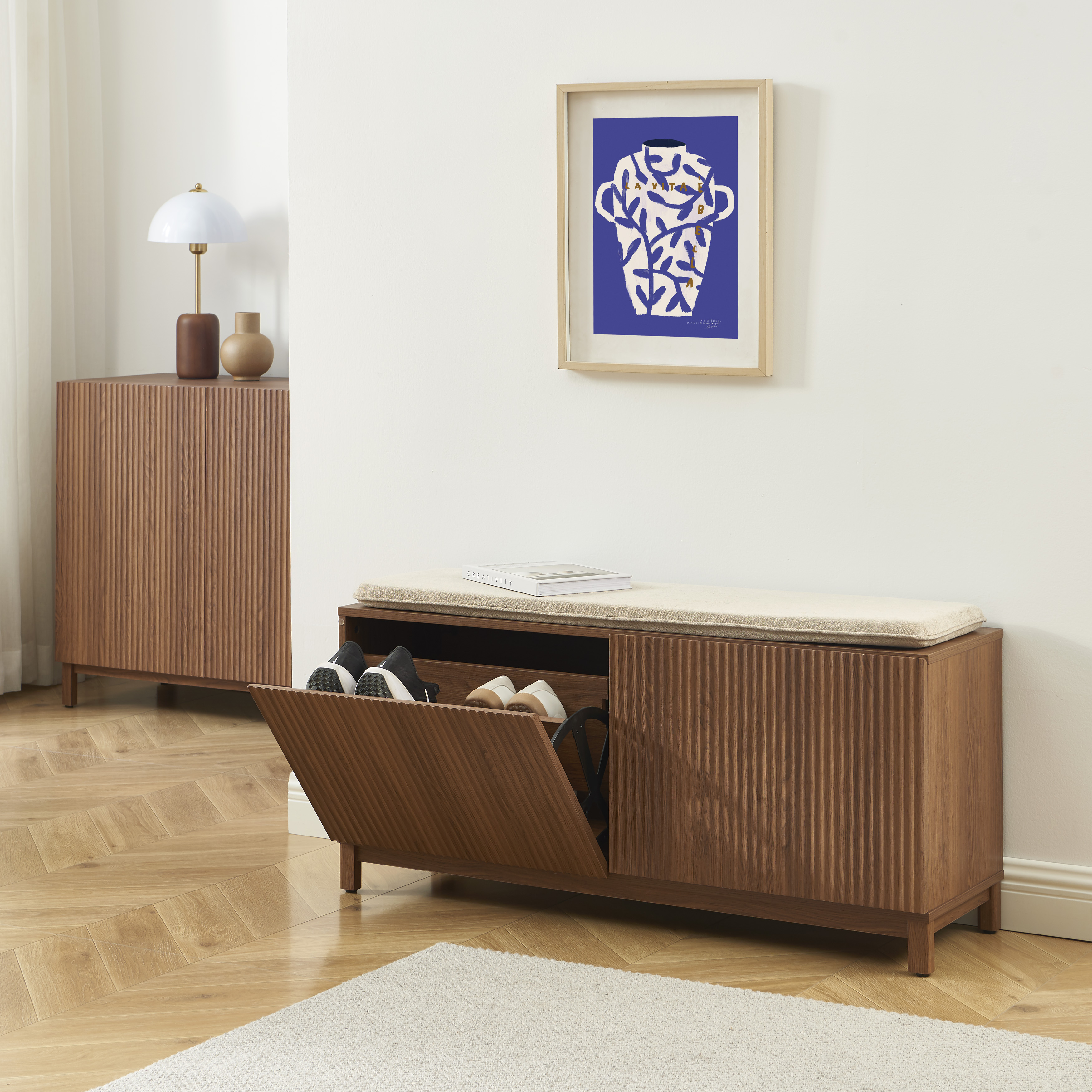 À la fois pratique et esthétique, le banc à chaussures ORCA combine assise confortable et espace de rangement. Son effet bois noyer et son coussin beige en font un meuble d'entrée chaleureux et fonctionnel.