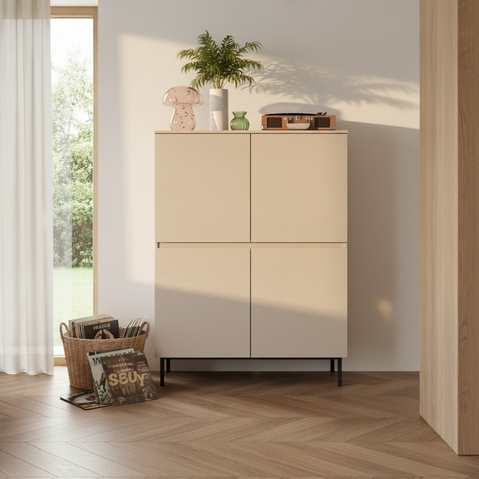 Avec son design moderne et son coloris cachemire élégant, le buffet haut ARNI conjugue style et fonctionnalité. Compact et spacieux à la fois, il offre une belle capacité de rangement.