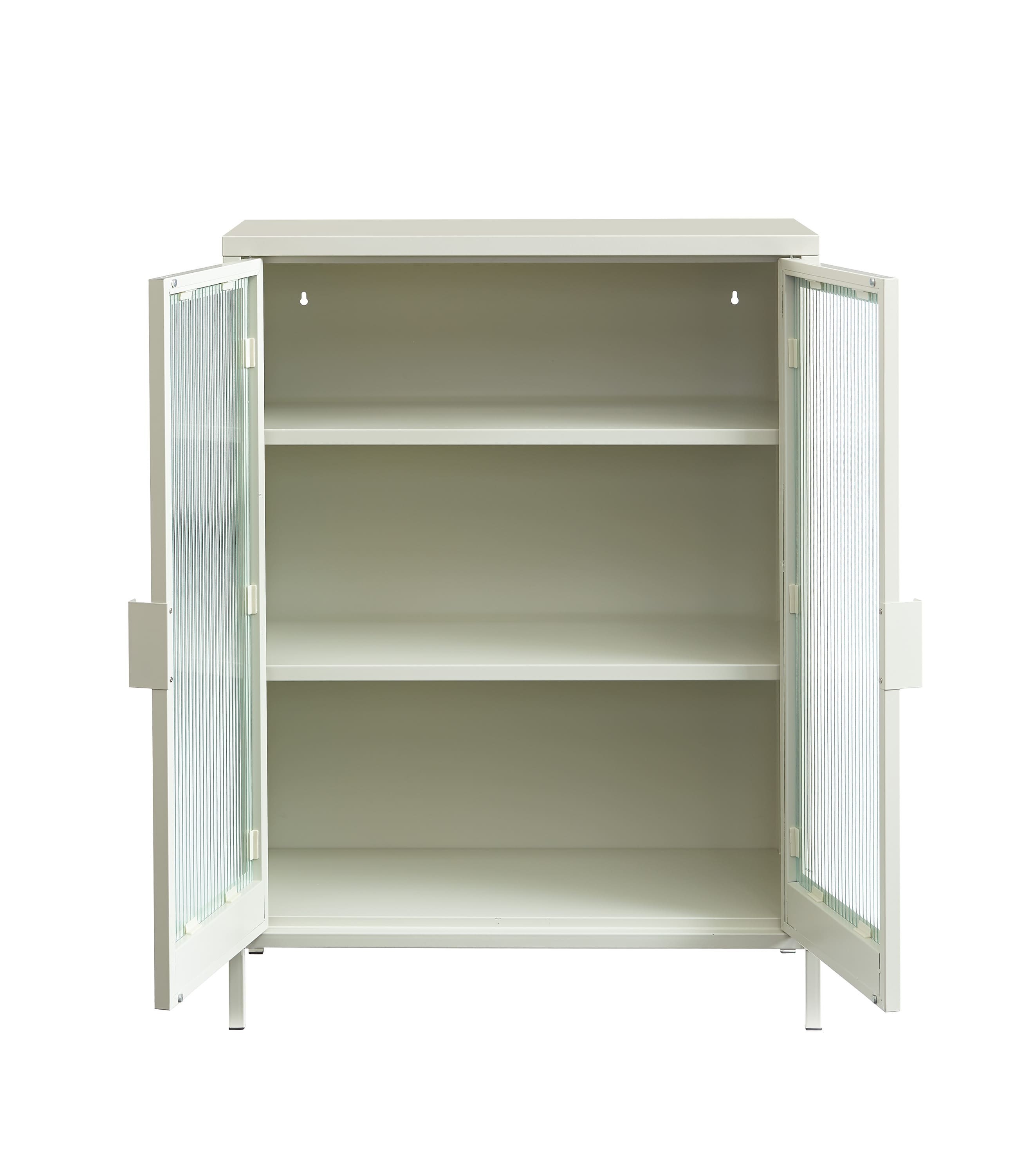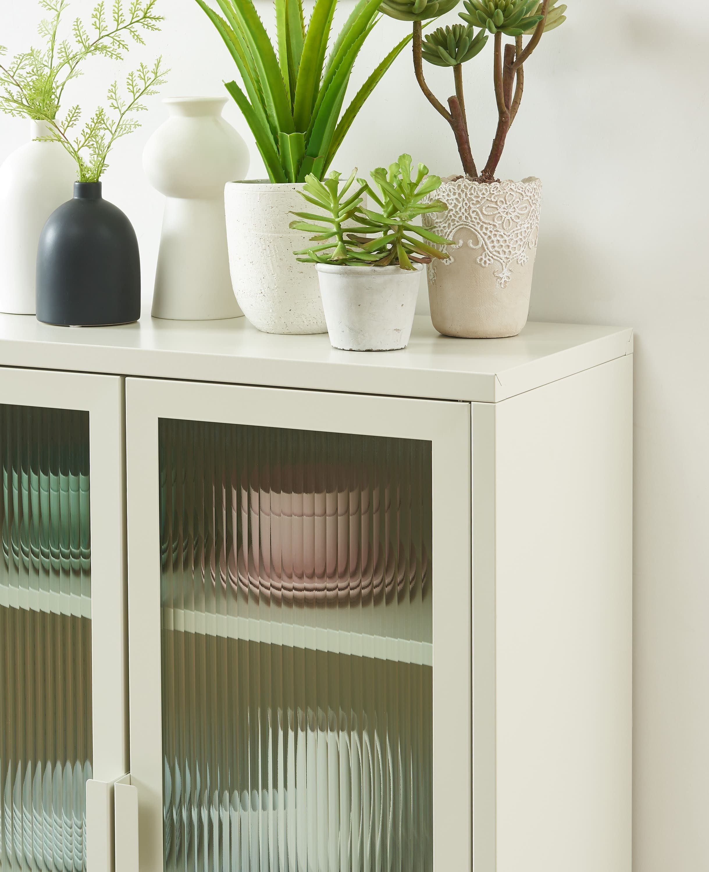 On tombe littéralement sous le charme de son style à la fois industriel et coloré, avec ses portes en verre cannelé, laissant transparaître avec discrétion votre vaisselle. Son coloris beige sable ira à merveille avec le reste de votre décoration, sans en faire trop.
