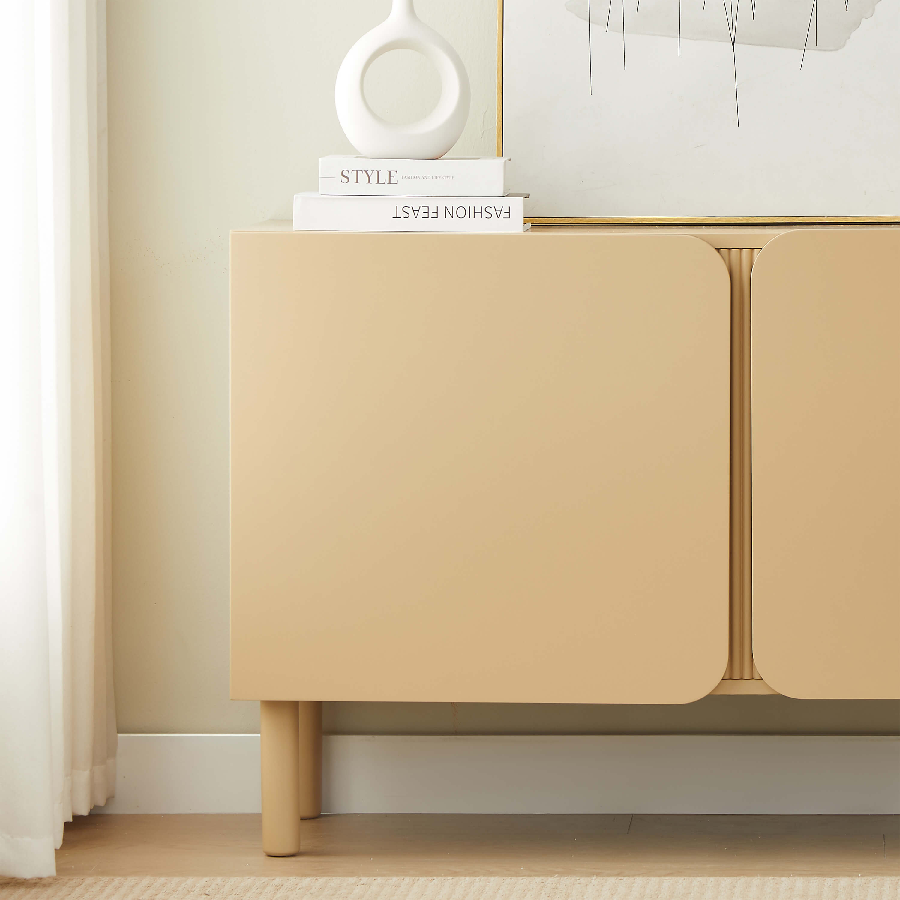 Le buffet BRAGA mise sur la simplicité pour séduire. Ses lignes droites sont adoucies par des angles arrondis sur les portes, offrant une esthétique douce et contemporaine. Son revêtement renforce cette impression d'élégance, facile à assortir avec tous les styles d'intérieur.