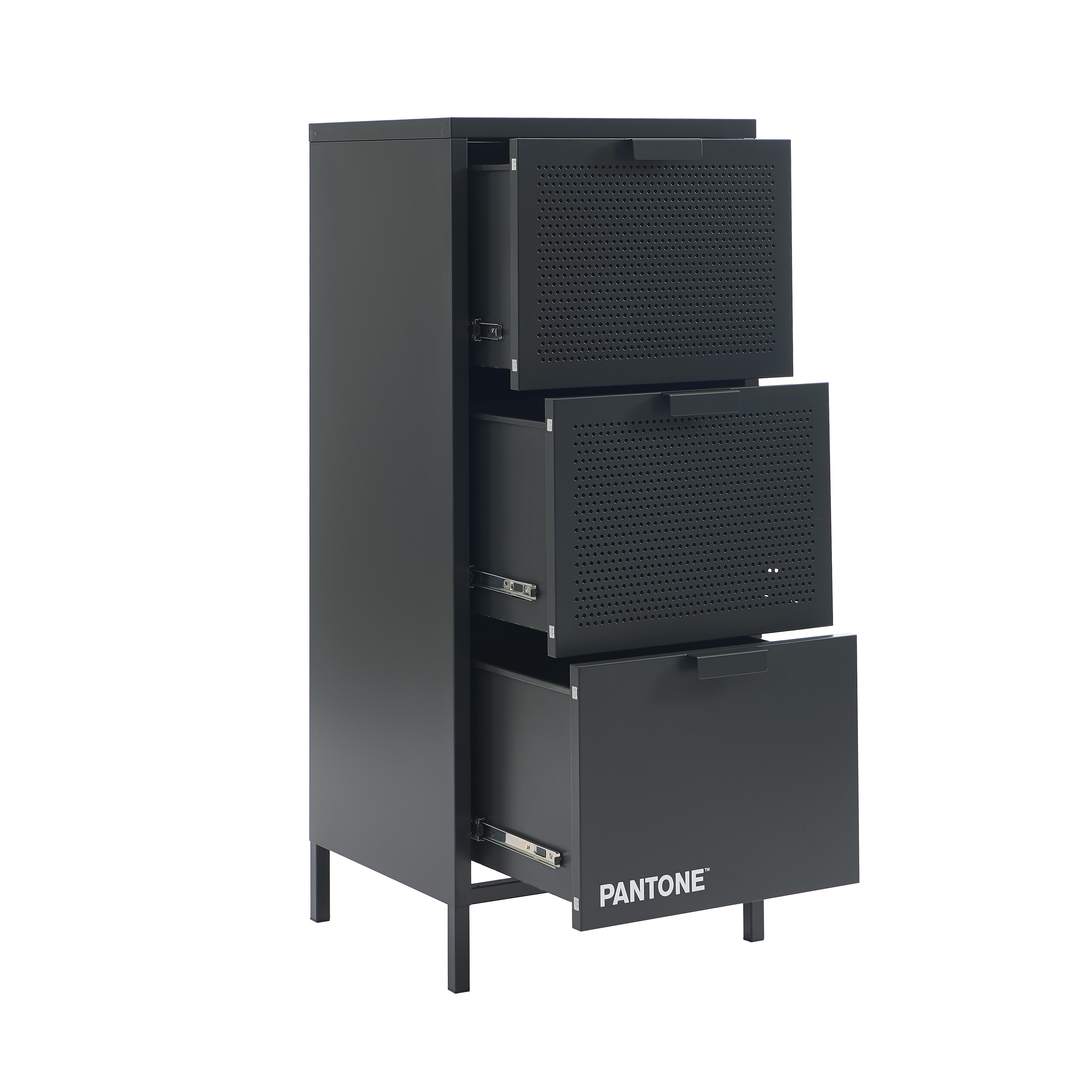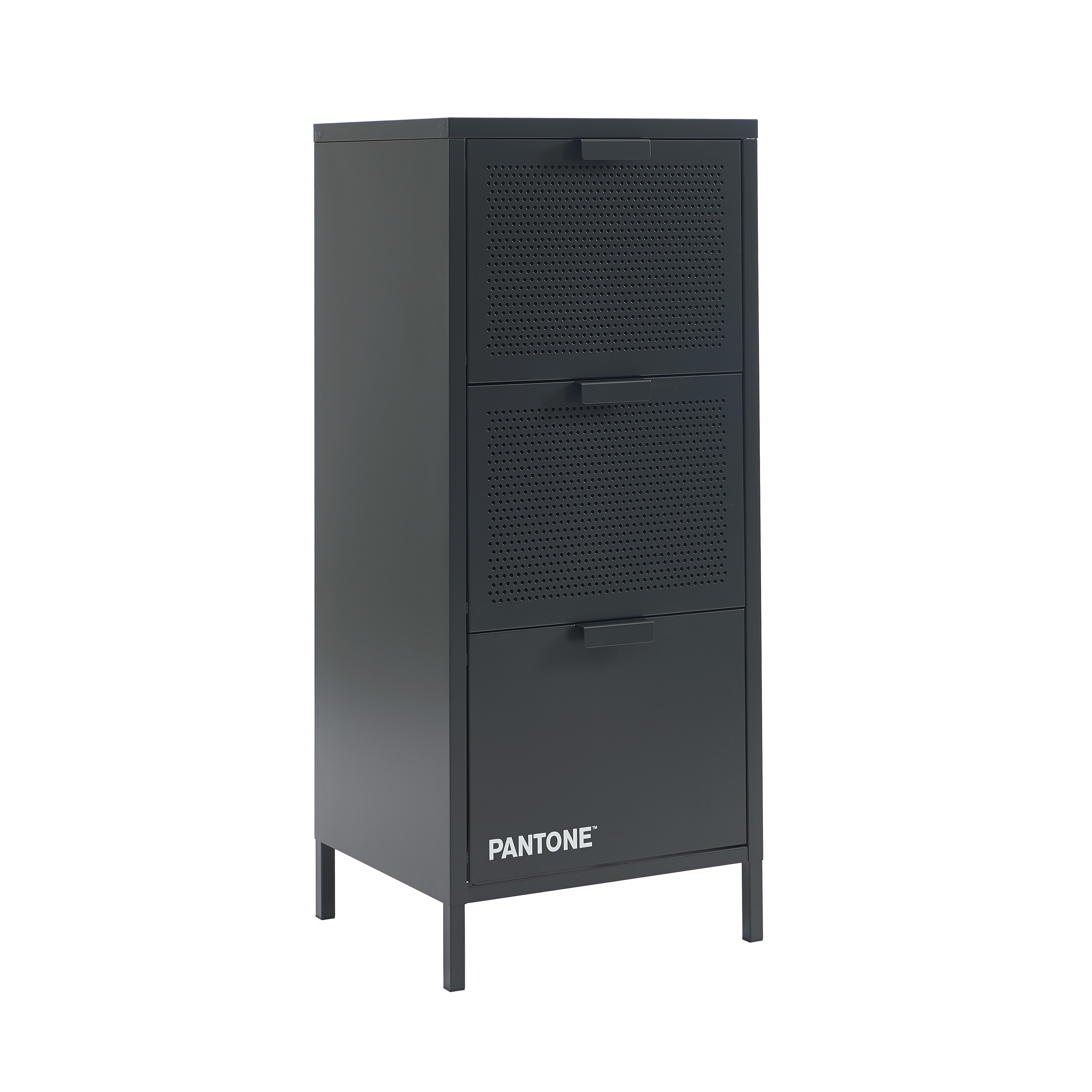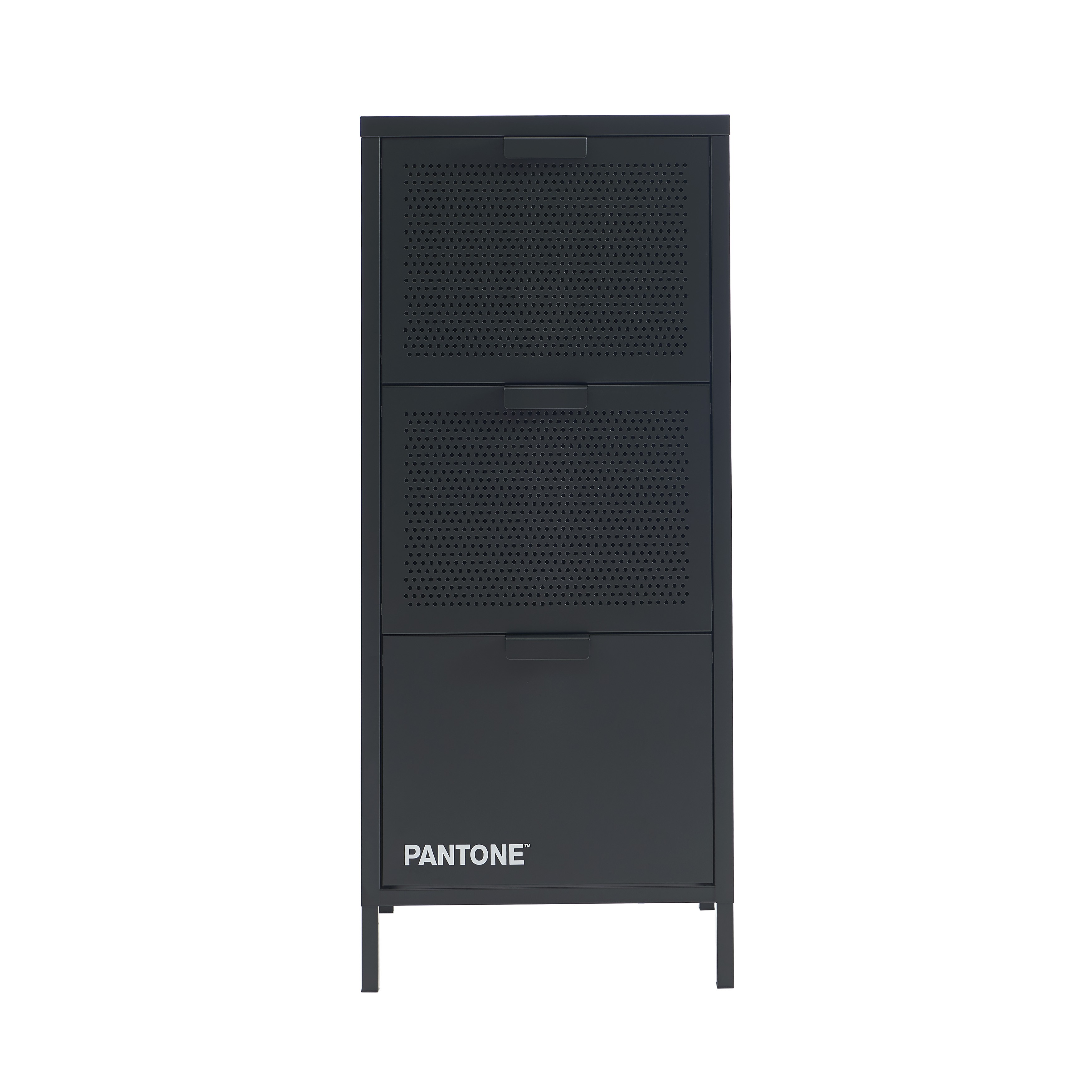 Le meuble de rangement PANTONE est équipé de trois tiroirs, offrant ainsi un espace de stockage pratique et organisé pour vos affaires. Deux des tiroirs ont une façade en métal perforé, ajoutant une touche de texture au design du meuble, tandis que le troisième tiroir a une façade en métal pleine pour un look plus solide et traditionnel.