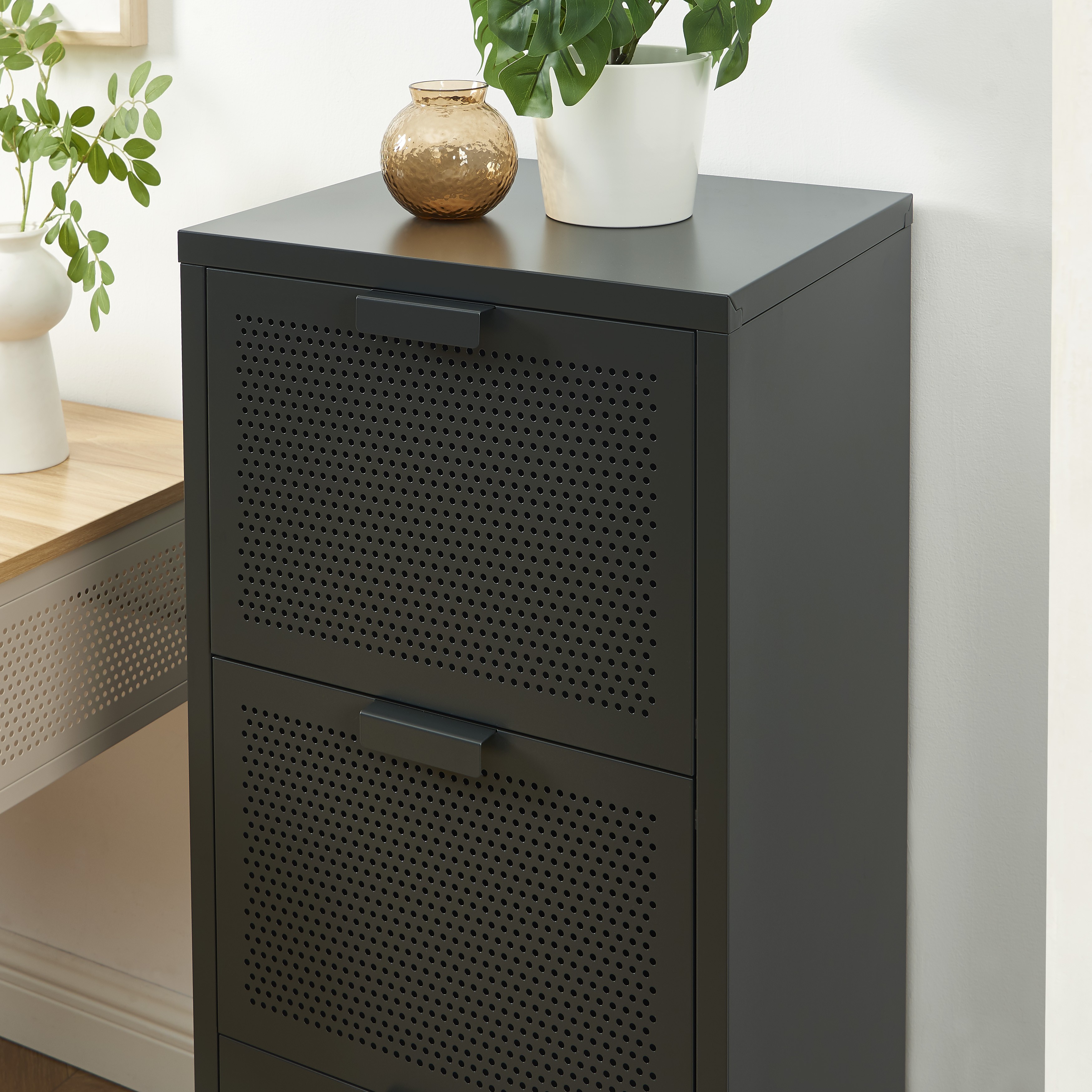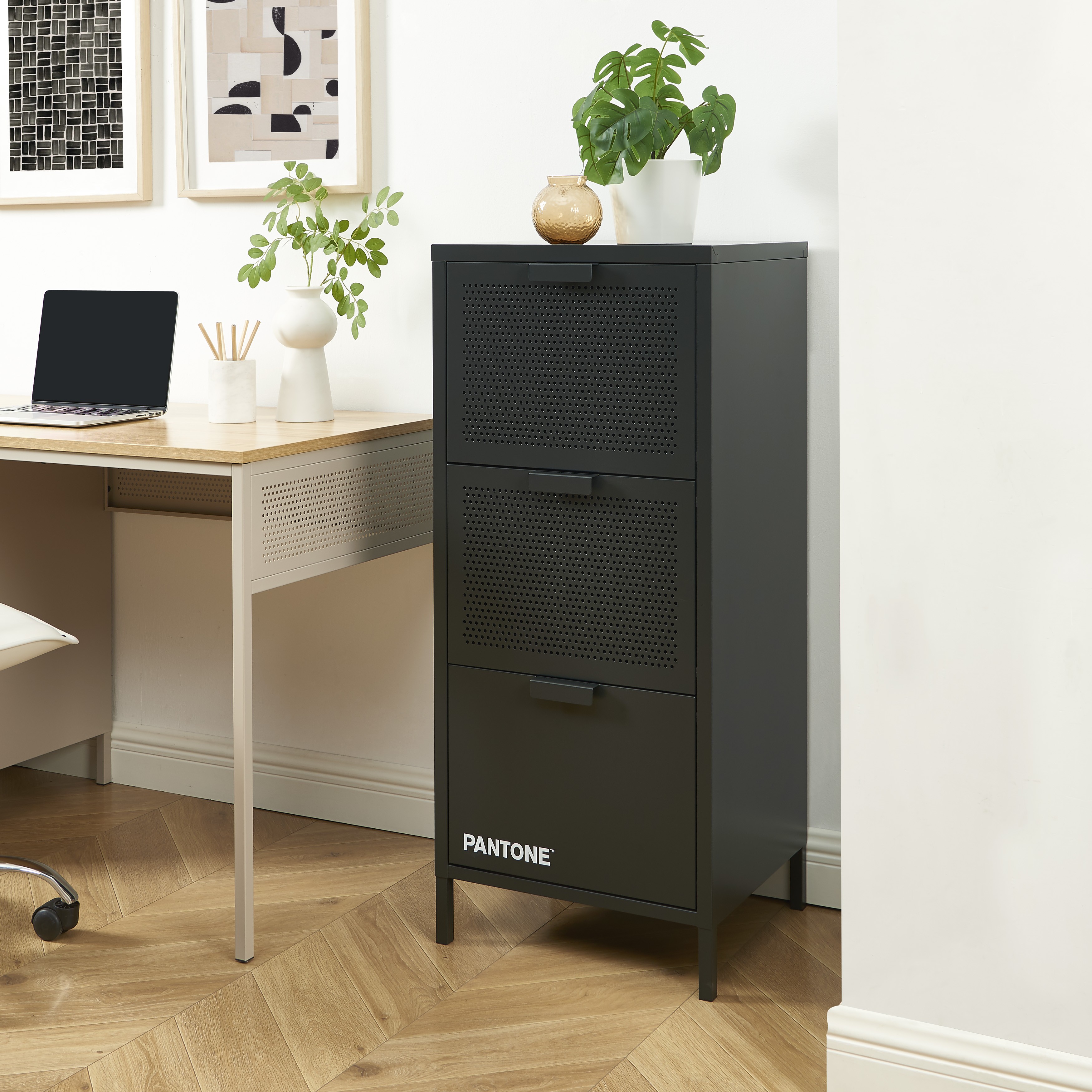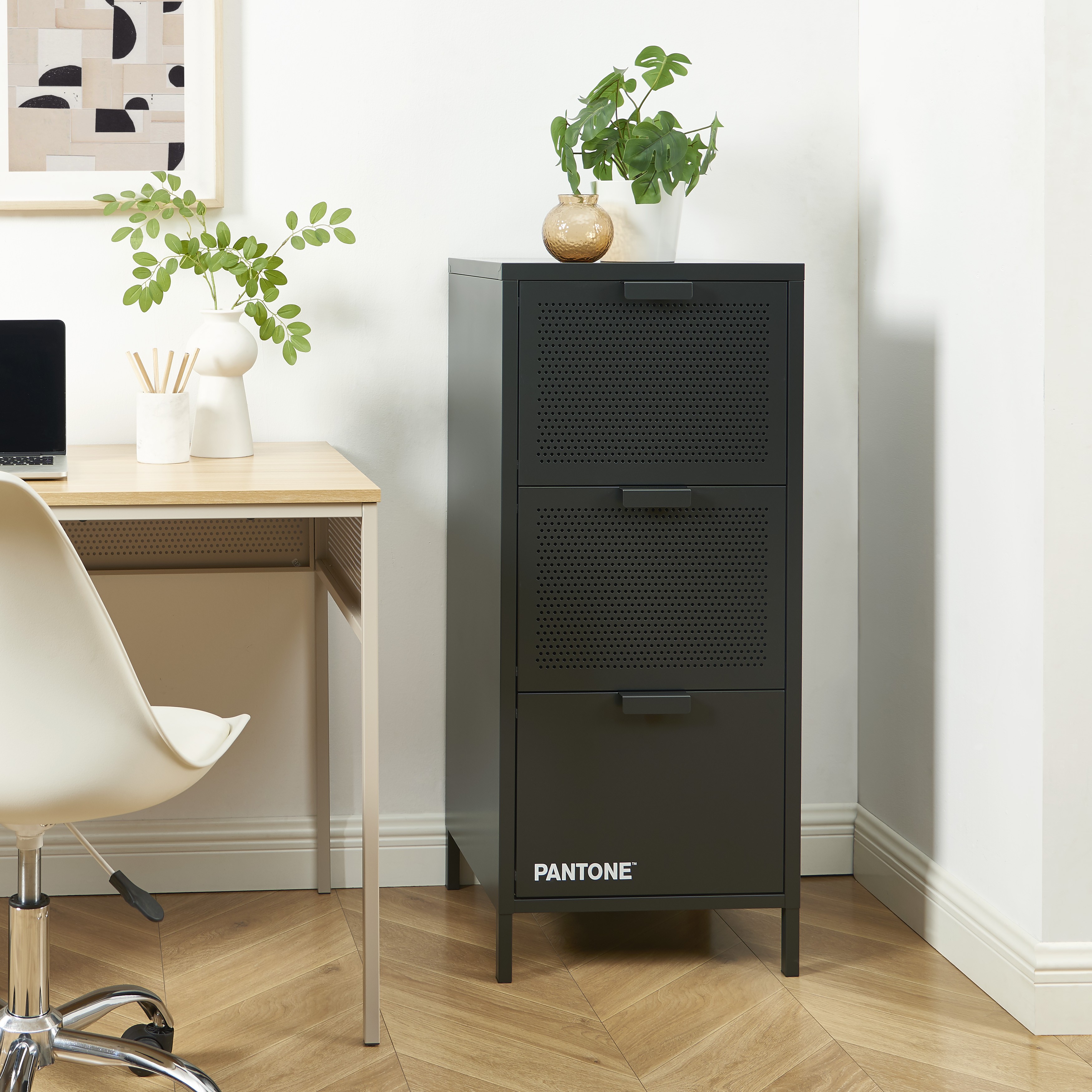 Le meuble de rangement PANTONE est équipé de trois tiroirs, offrant ainsi un espace de stockage pratique et organisé pour vos affaires. Deux des tiroirs ont une façade en métal perforé, ajoutant une touche de texture au design du meuble, tandis que le troisième tiroir a une façade en métal pleine pour un look plus solide et traditionnel.