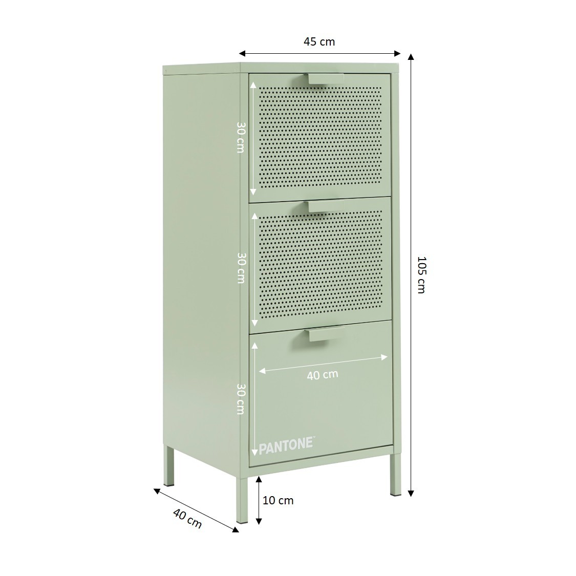 Le meuble de rangement PANTONE est équipé de trois tiroirs, offrant ainsi un espace de stockage pratique et organisé pour vos affaires. Deux des tiroirs ont une façade en métal perforé, ajoutant une touche de texture au design du meuble, tandis que le troisième tiroir a une façade en métal pleine pour un look plus solide et traditionnel.