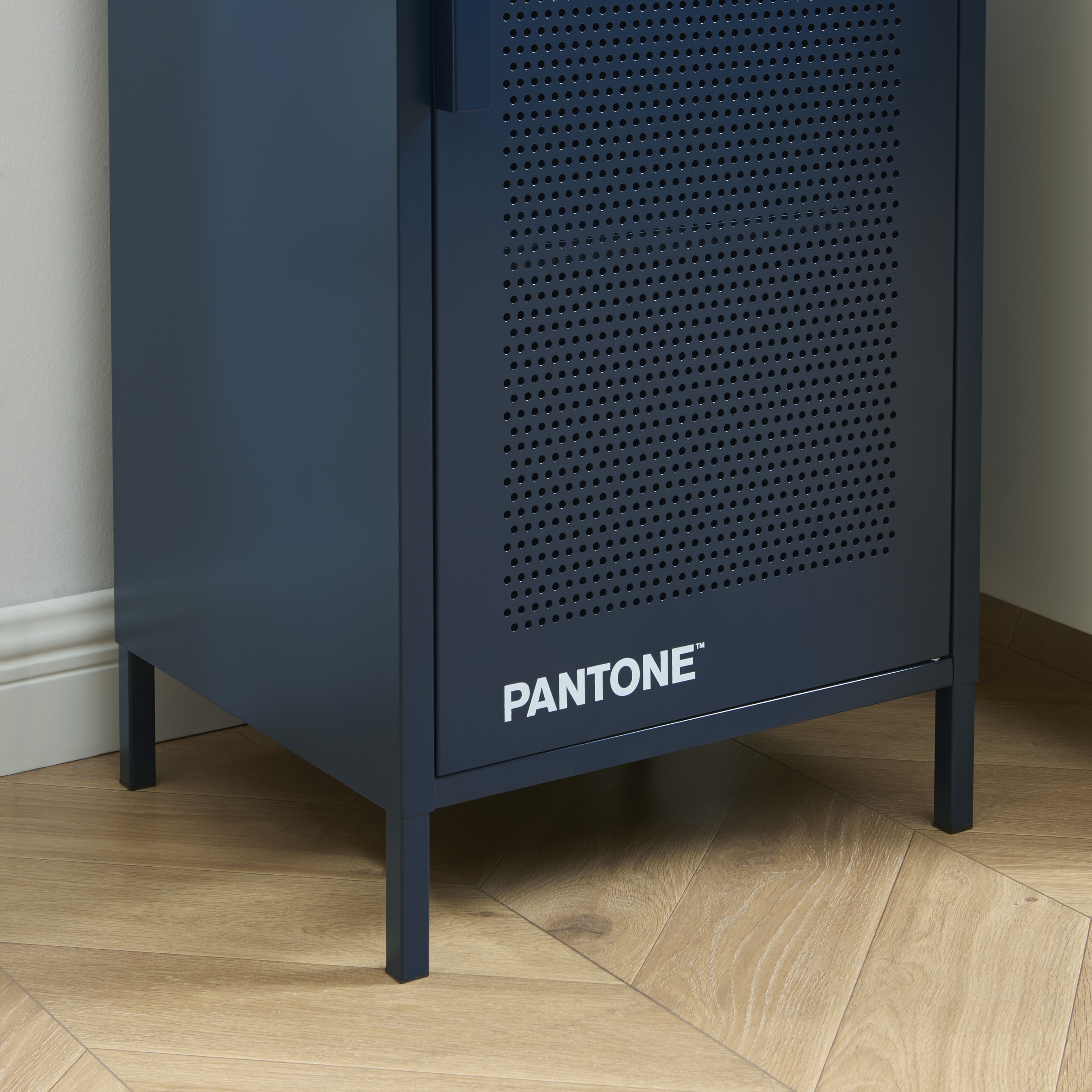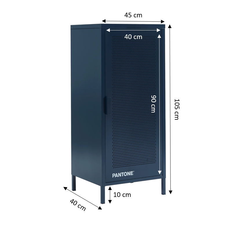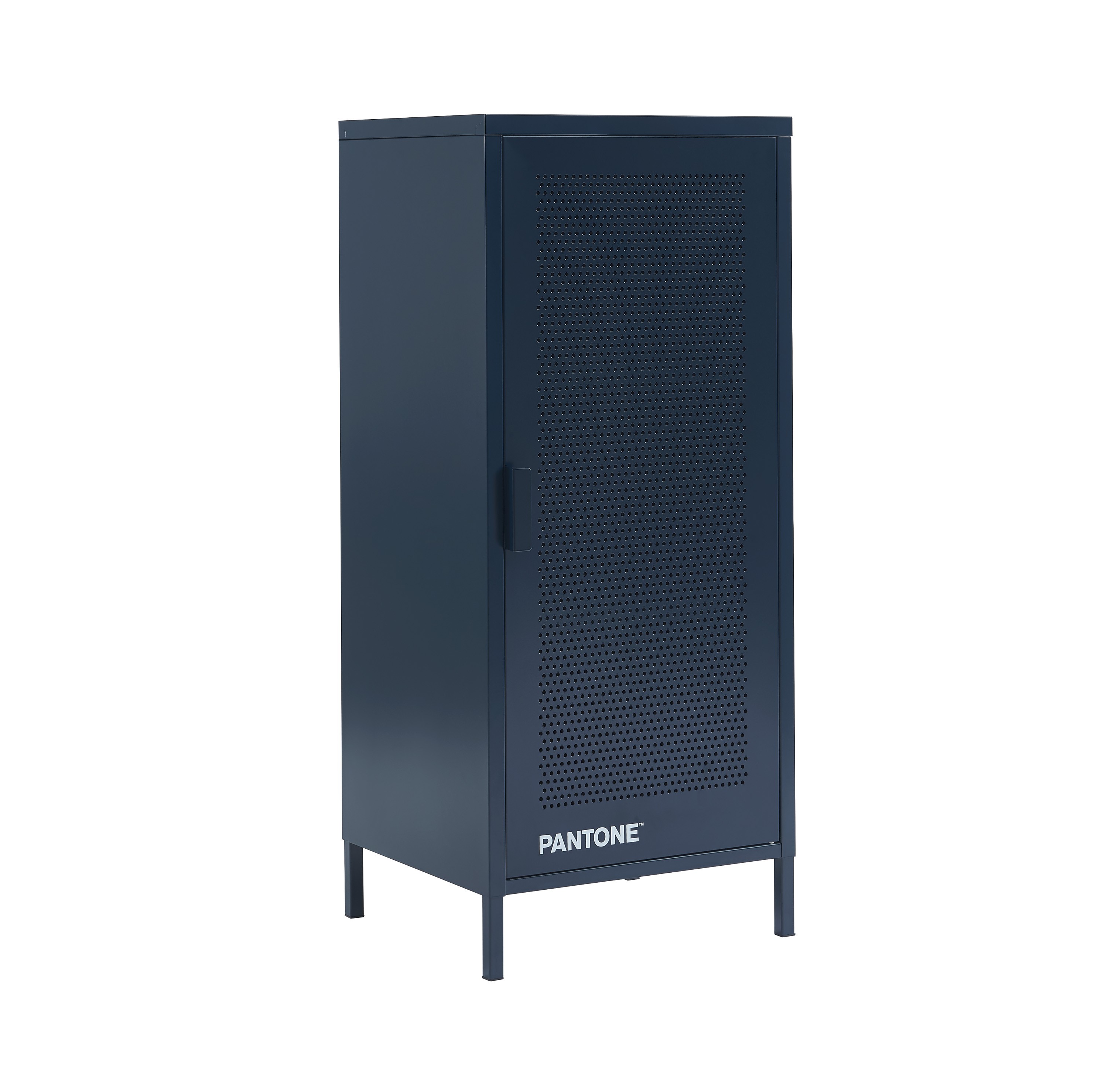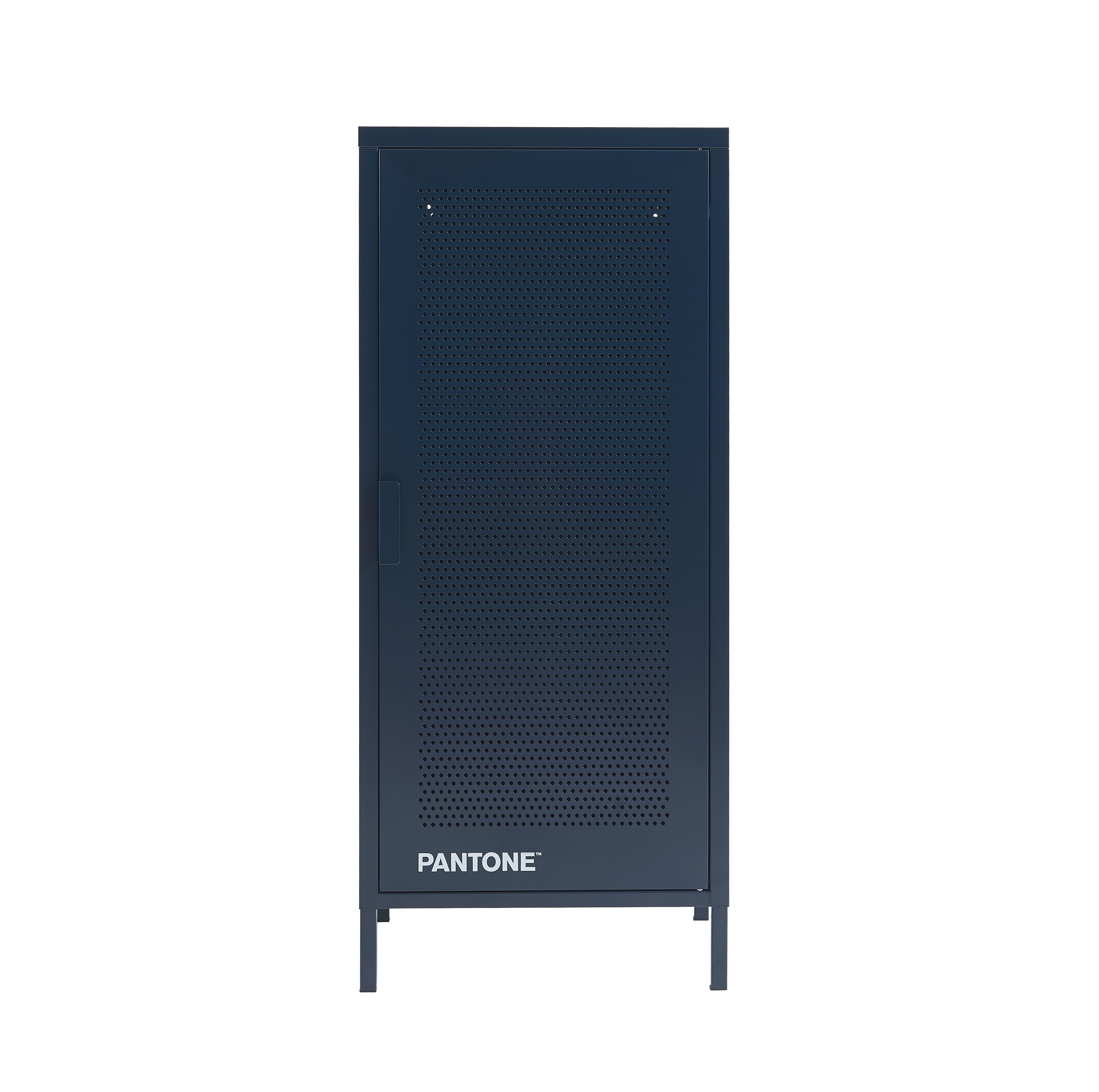 La porte en acier perforé du meuble PANTONE renforce encore le style industriel tandis que les pieds en métal assurent sa stabilité.