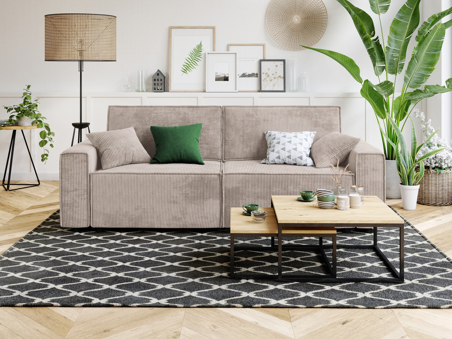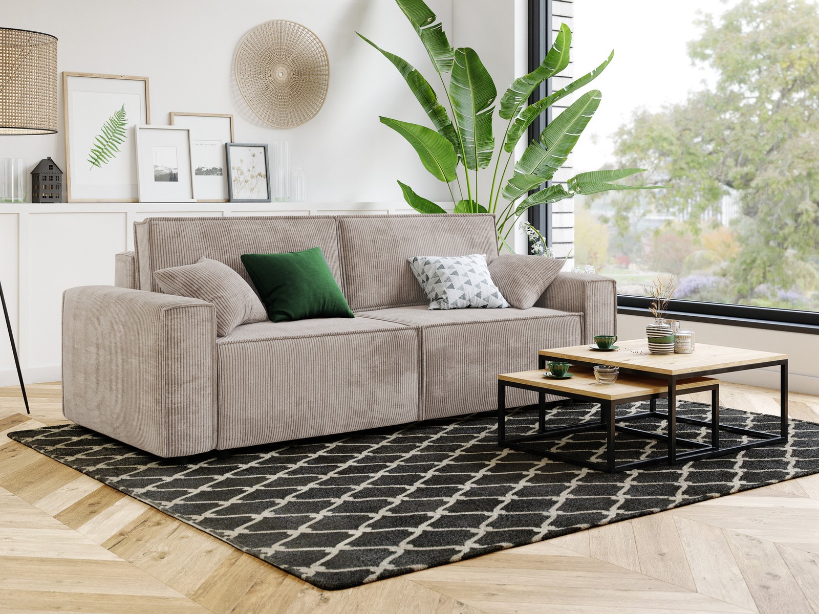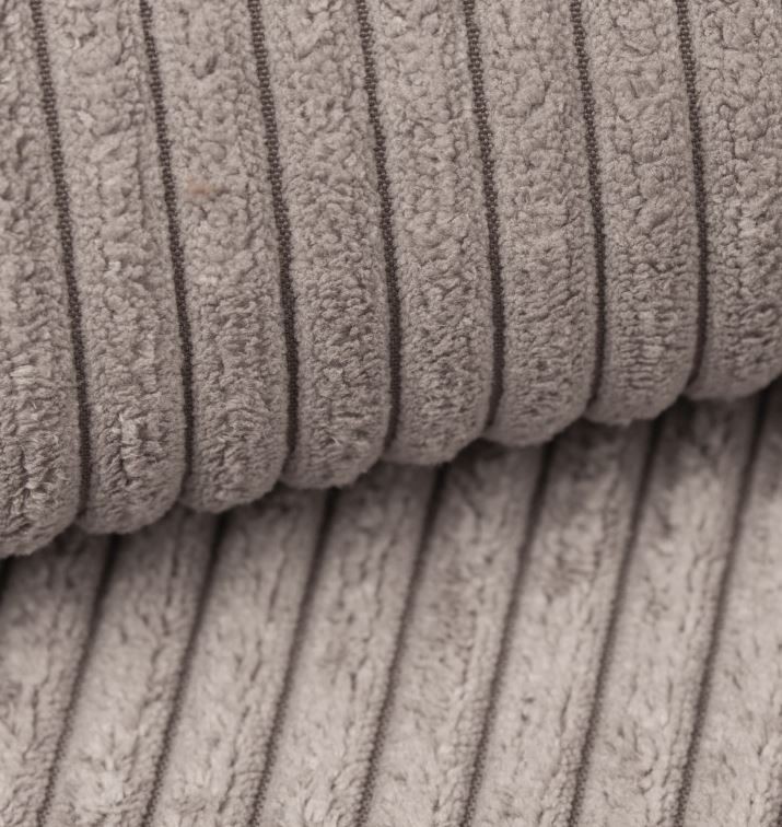 Son revêtement en velours côtelé grège, ses accoudoirs carrés et son format généreux sont ses vrais atouts tendance.