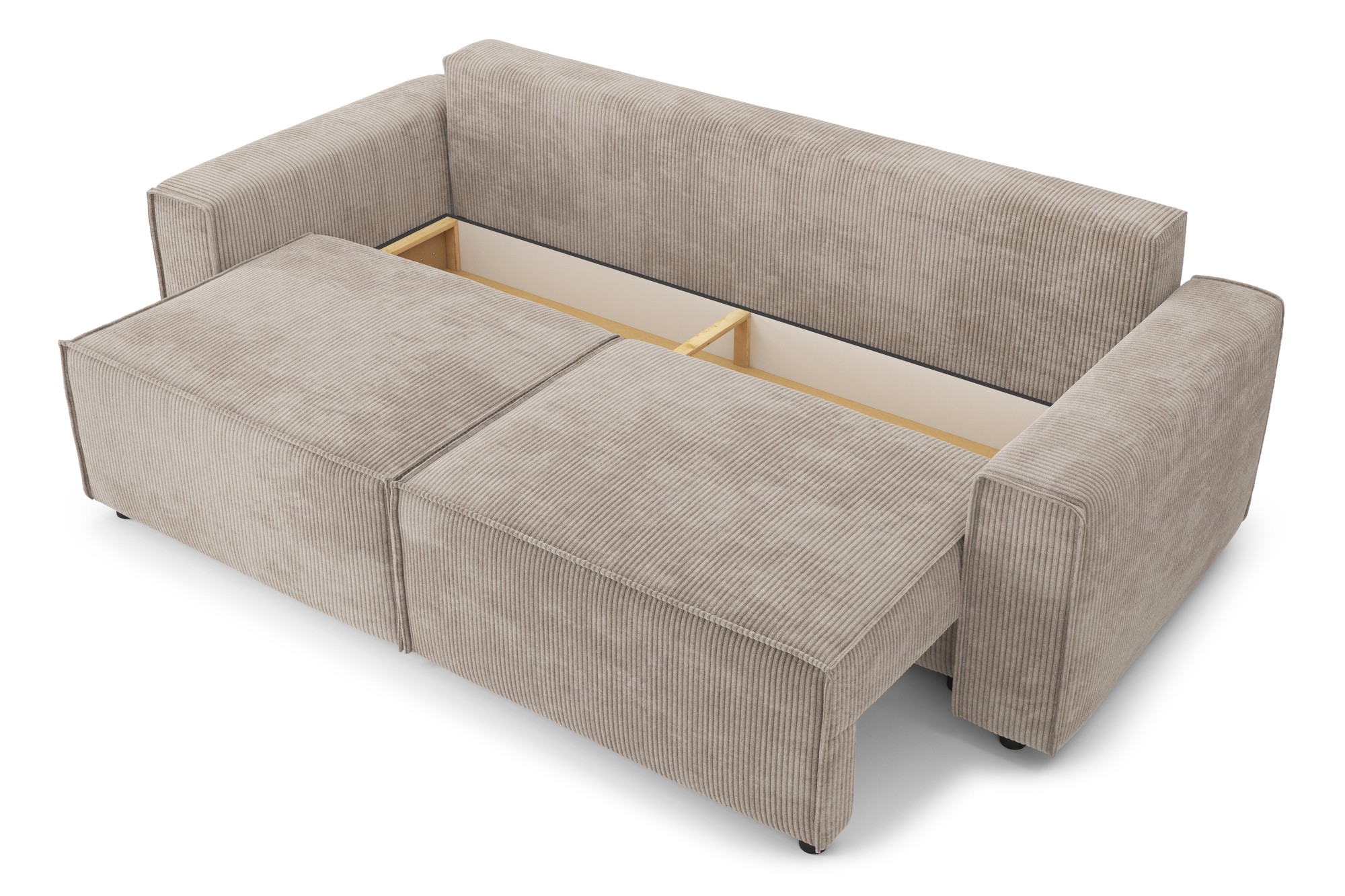 Canapé droit convertible MIRA 3 places, avec coffre de rangement, en velours côtelé grège. Dimensions du canapé : 230 x 95 x 82 cm. Dimensions du couchage : 140 x 190 cm.