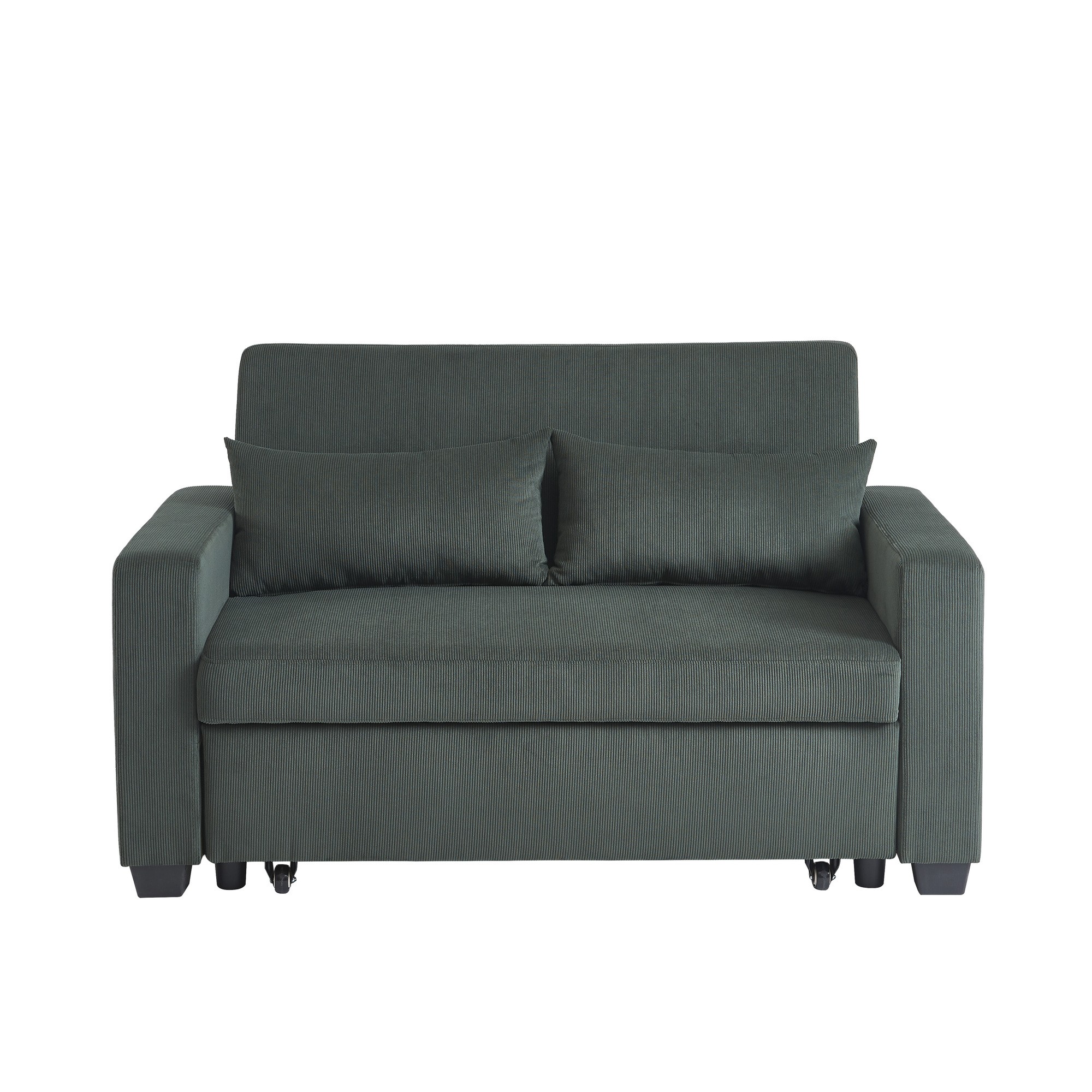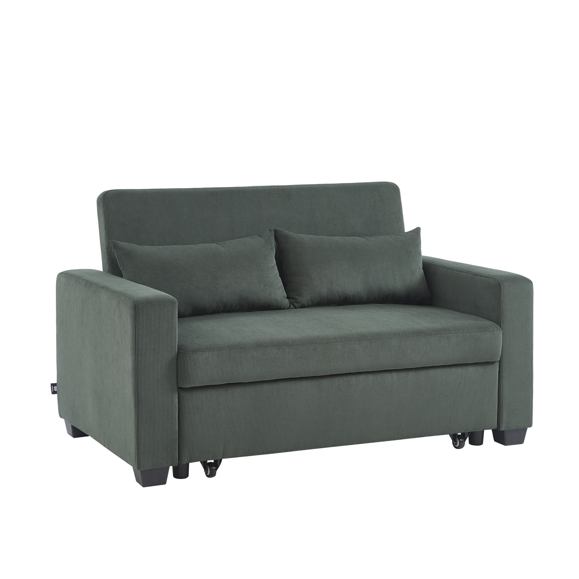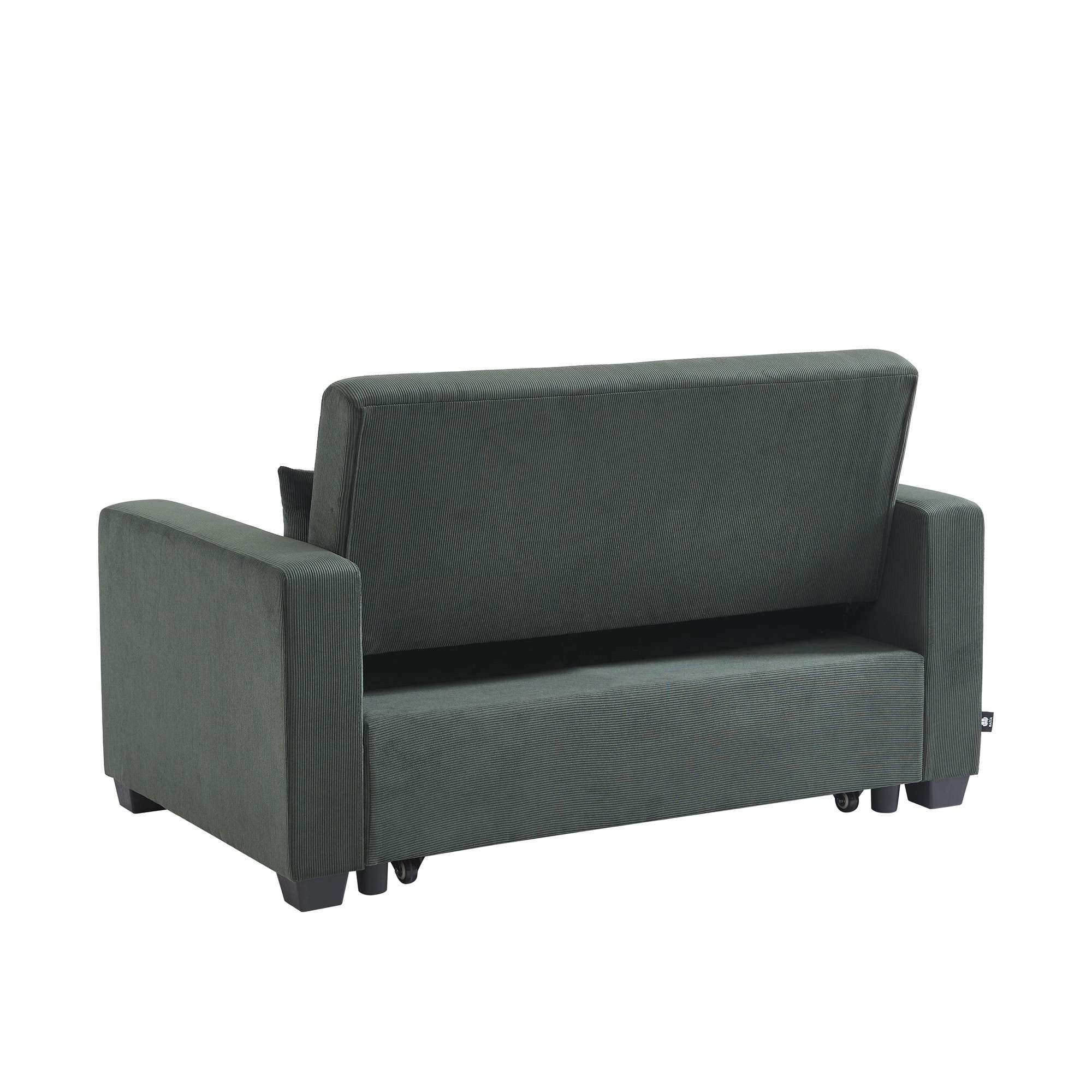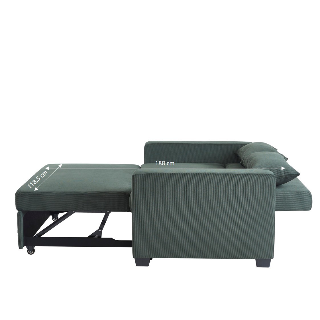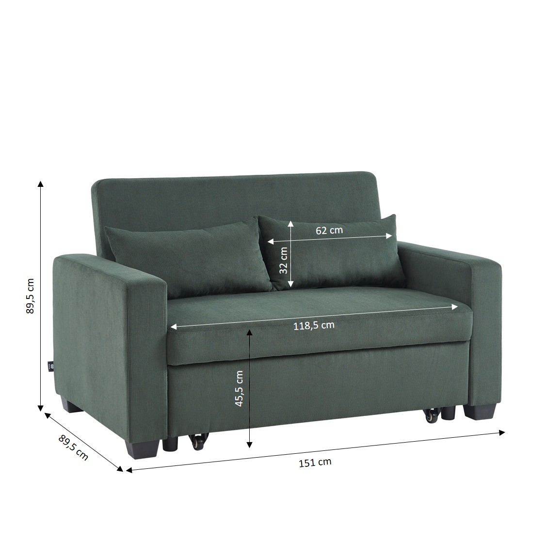 Canapé droit convertible EVA 2 places en velours côtelé vert. Dimensions du canapé : 151 x 89,5 x 89,5 cm. Dimensions du couchage : 188 x 118,5 cm