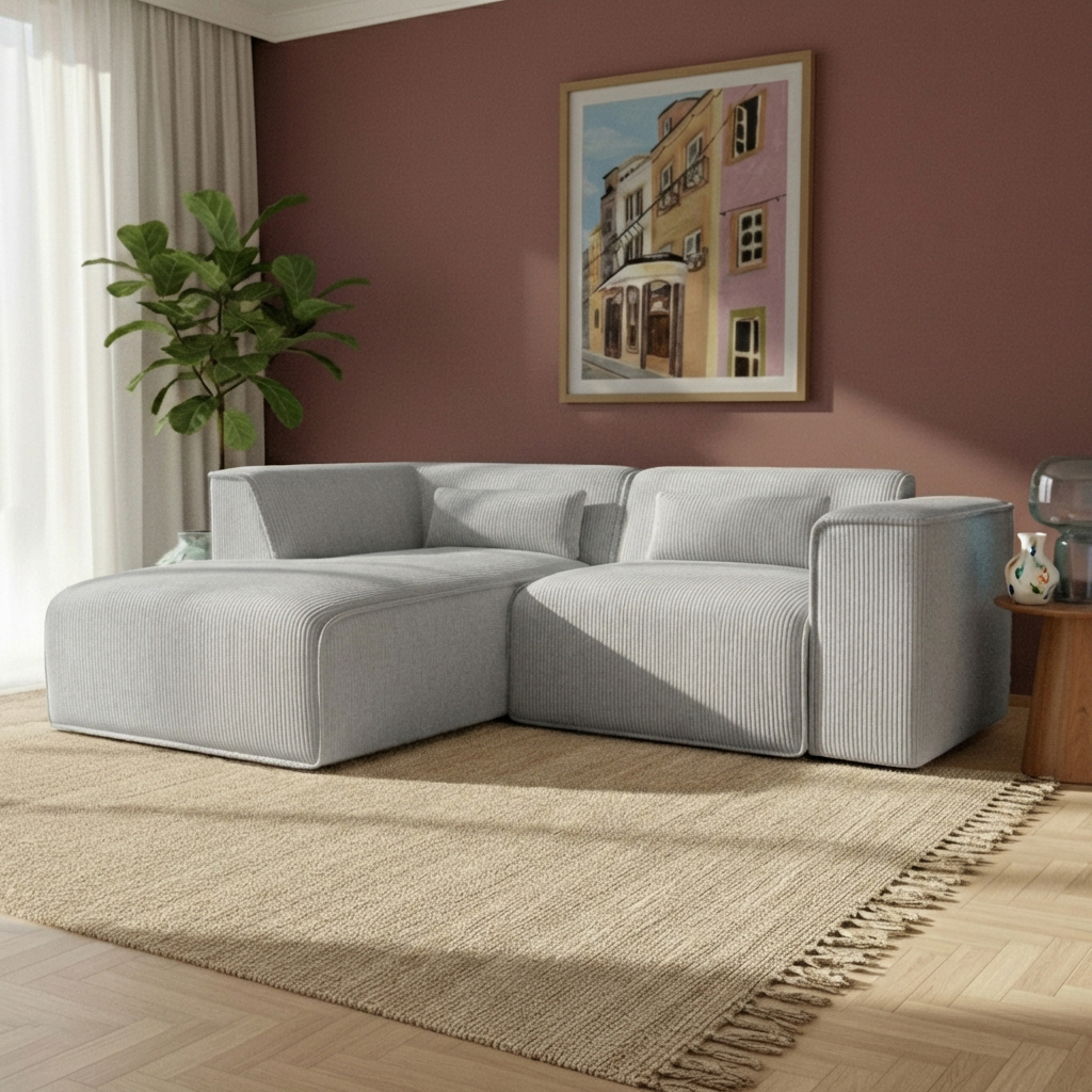 • Canapé d'angle gauche fixe NUNA 4 places velours côtelé gris