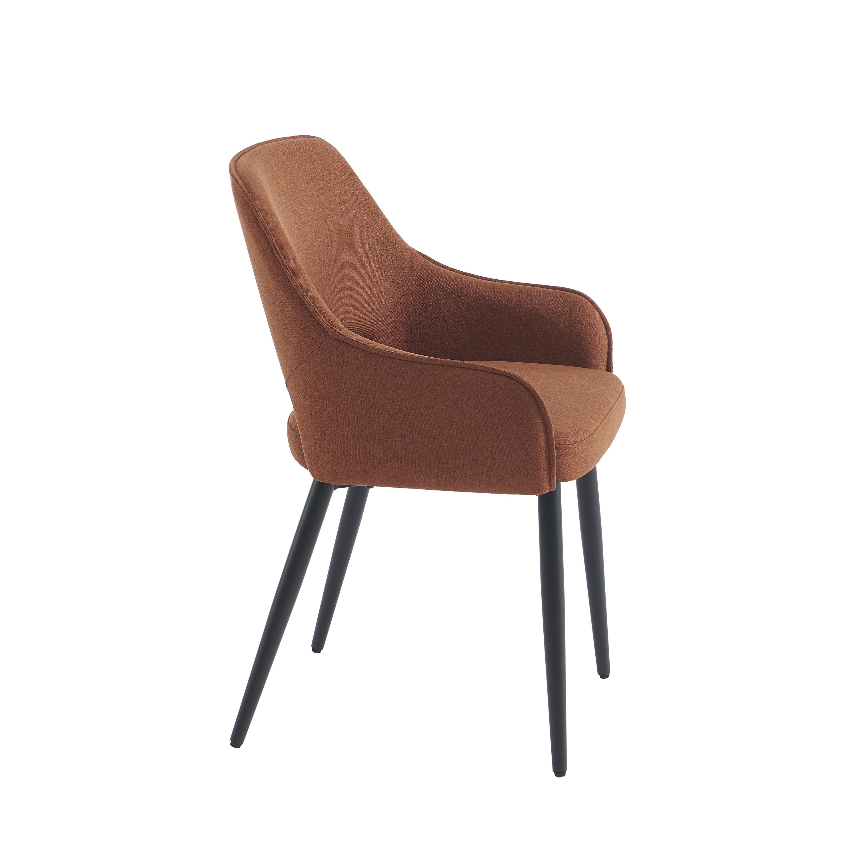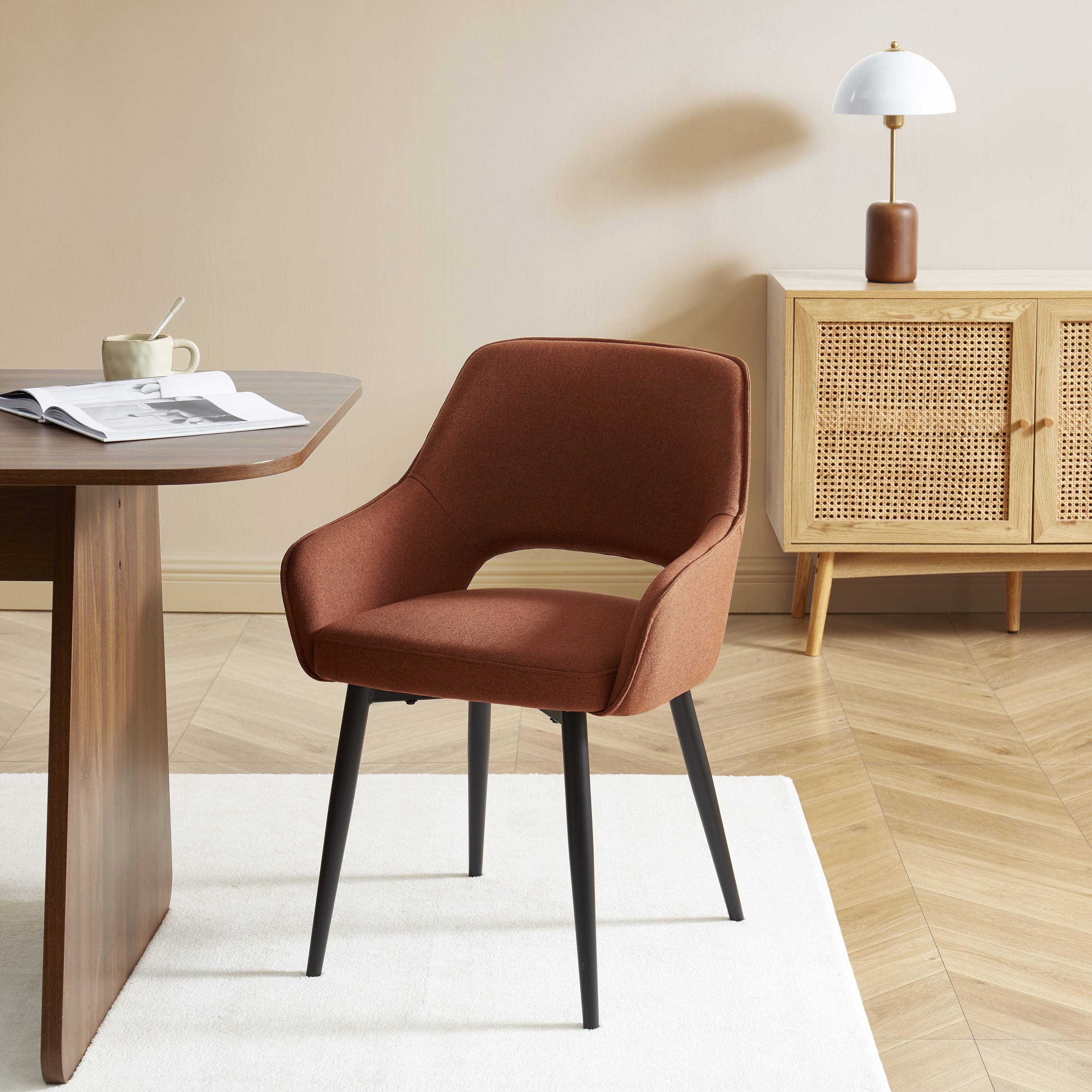 Avec leur tissu terracotta et leurs pieds en métal noir, les fauteuils UNNI mêlent chaleur et modernité. Leur silhouette enveloppante et leurs lignes simples en font des pièces faciles à intégrer dans un intérieur contemporain ou scandinave.