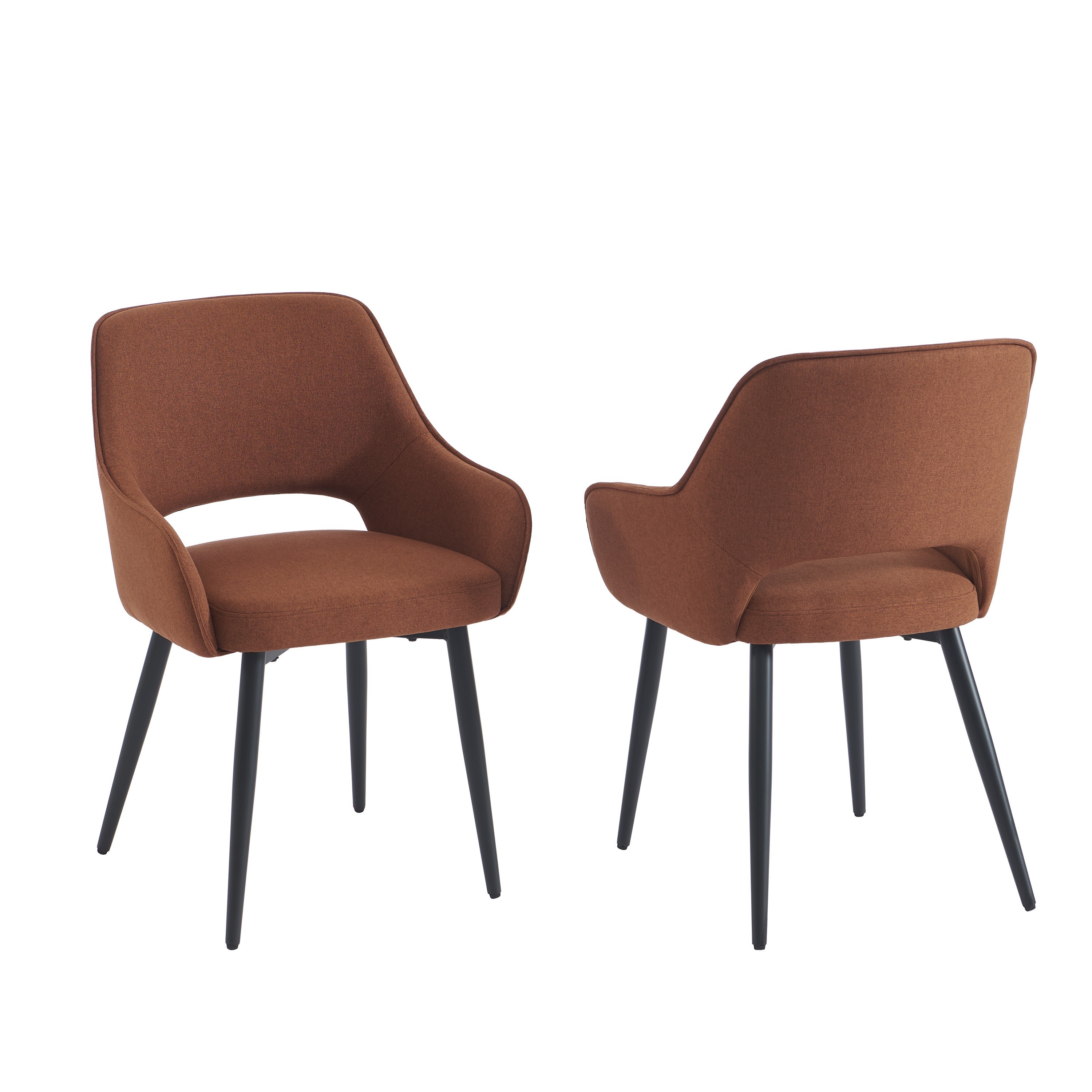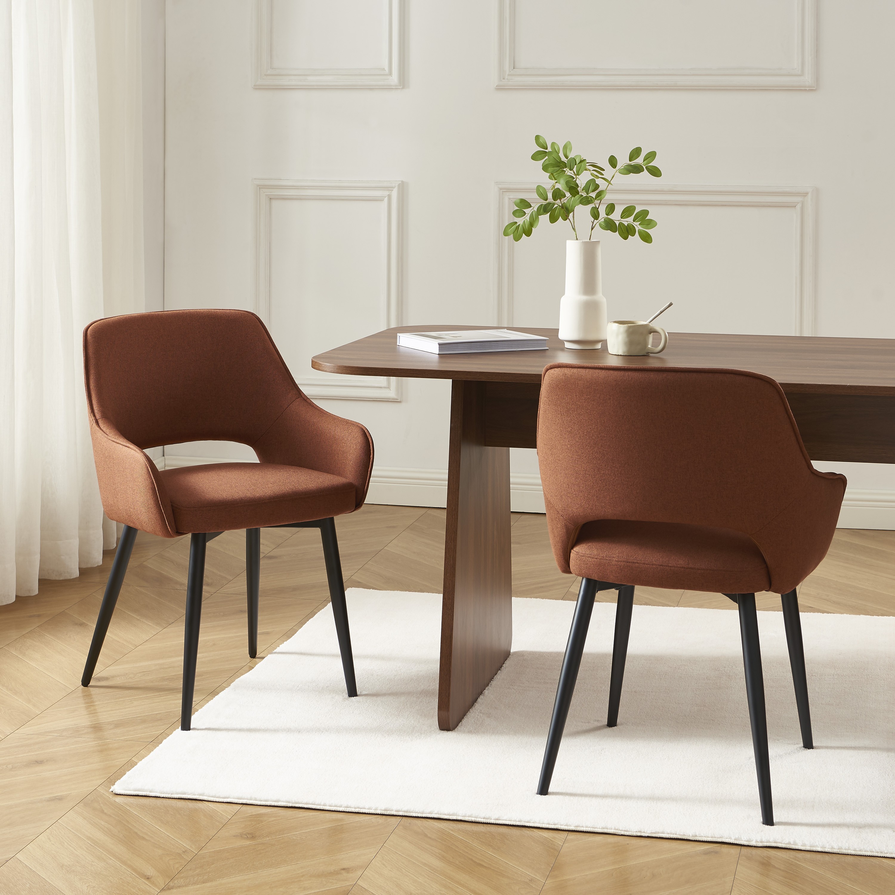 Deux fauteuils élégants et confortables, en tissu terracotta et métal noir, parfaits pour créer une ambiance chaleureuse et moderne autour de la table.