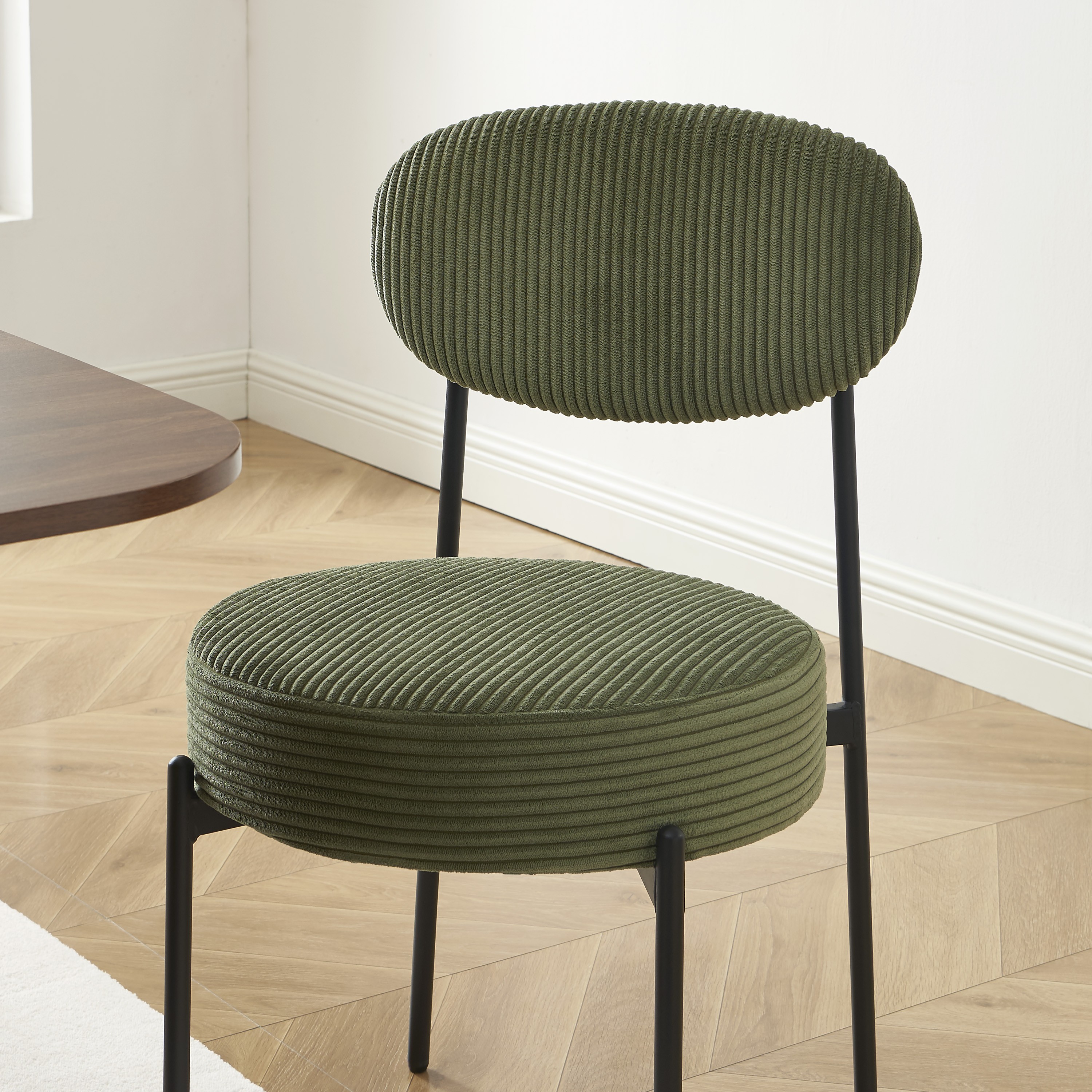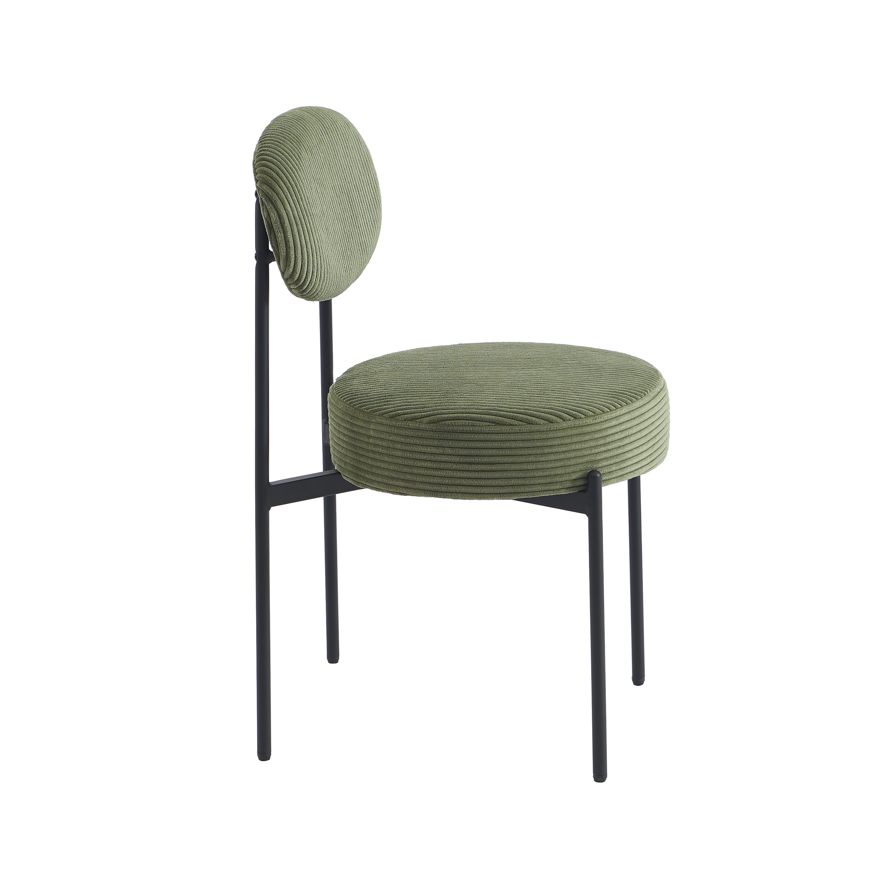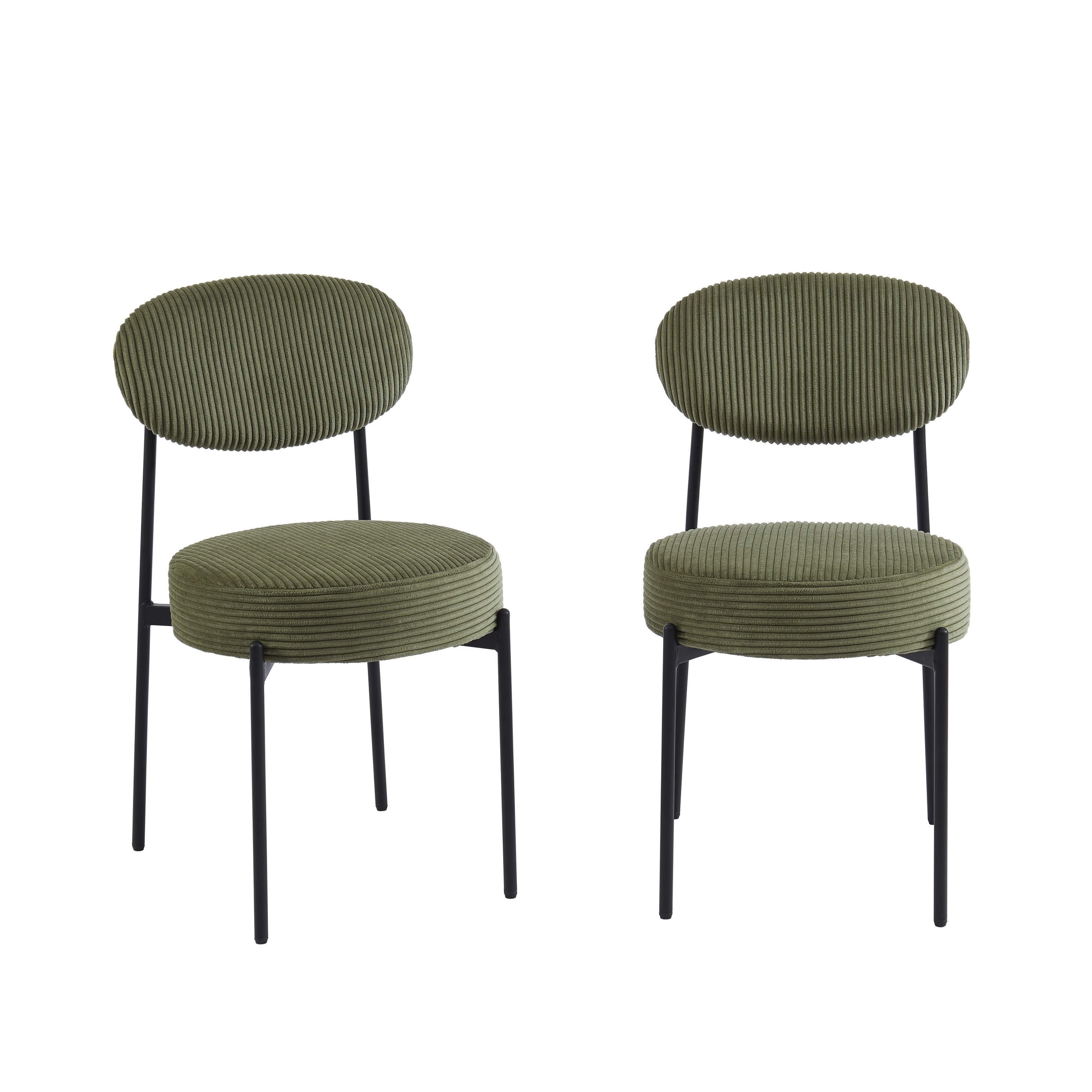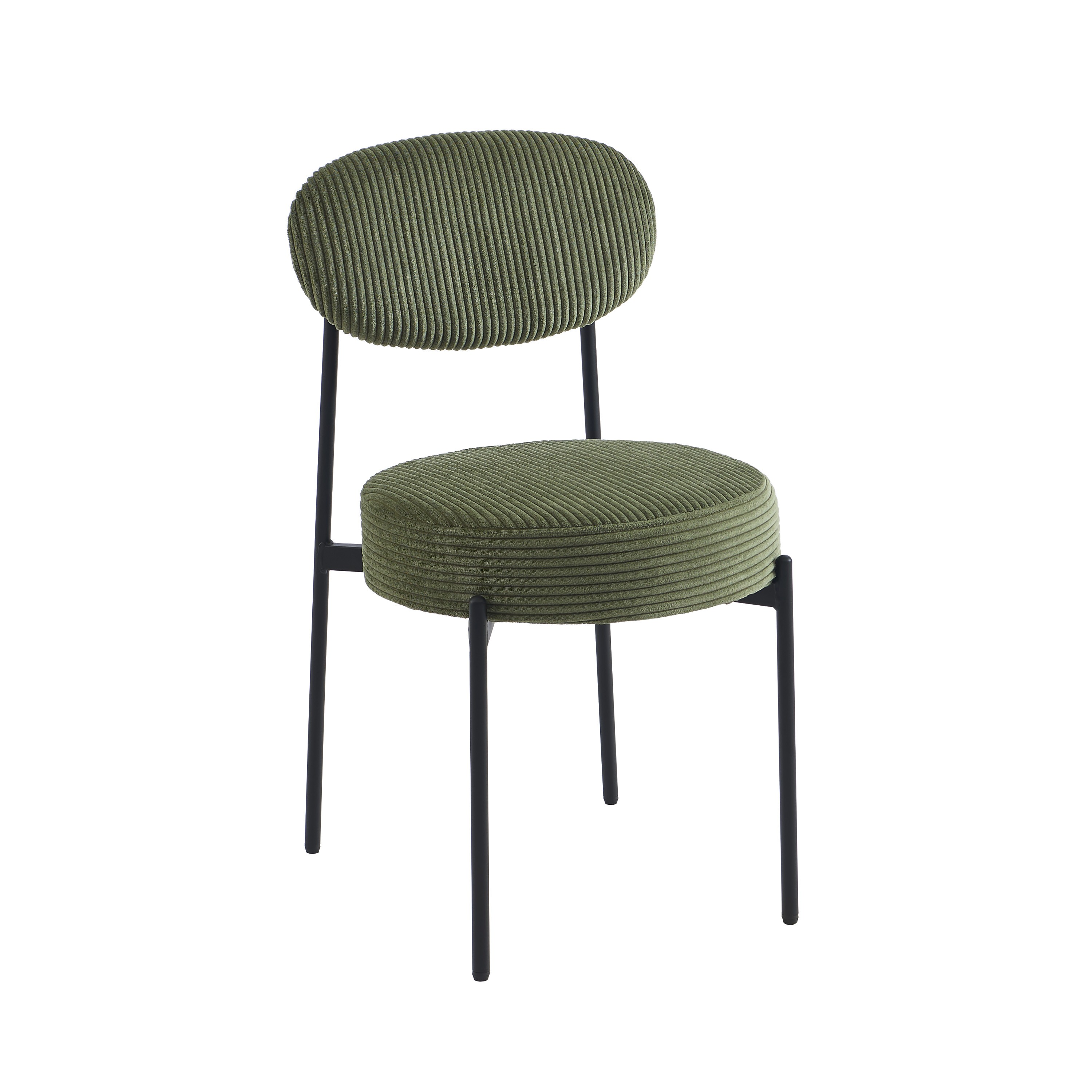 Envie d'une salle à manger qui a du caractère ? Le lot de 2 chaises TEINA coche toutes les cases. Leur assise généreuse en velours côtelé vert, à la fois douce et texturée, contraste parfaitement avec des pieds en métal noir. Un duo au look à la fois rétro et contemporain.