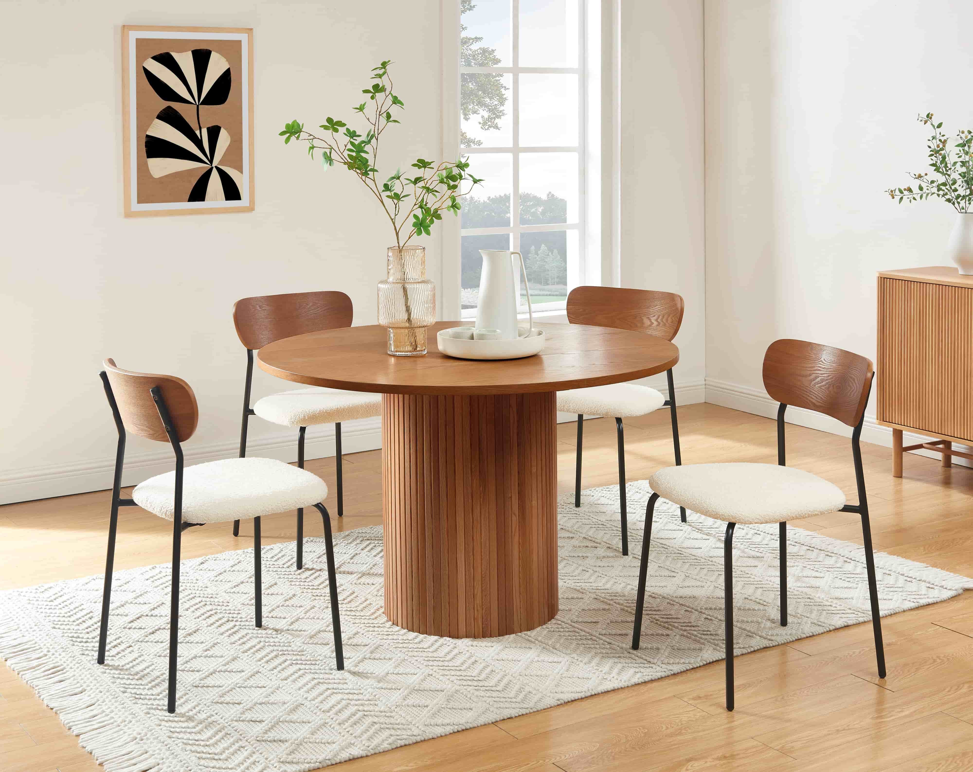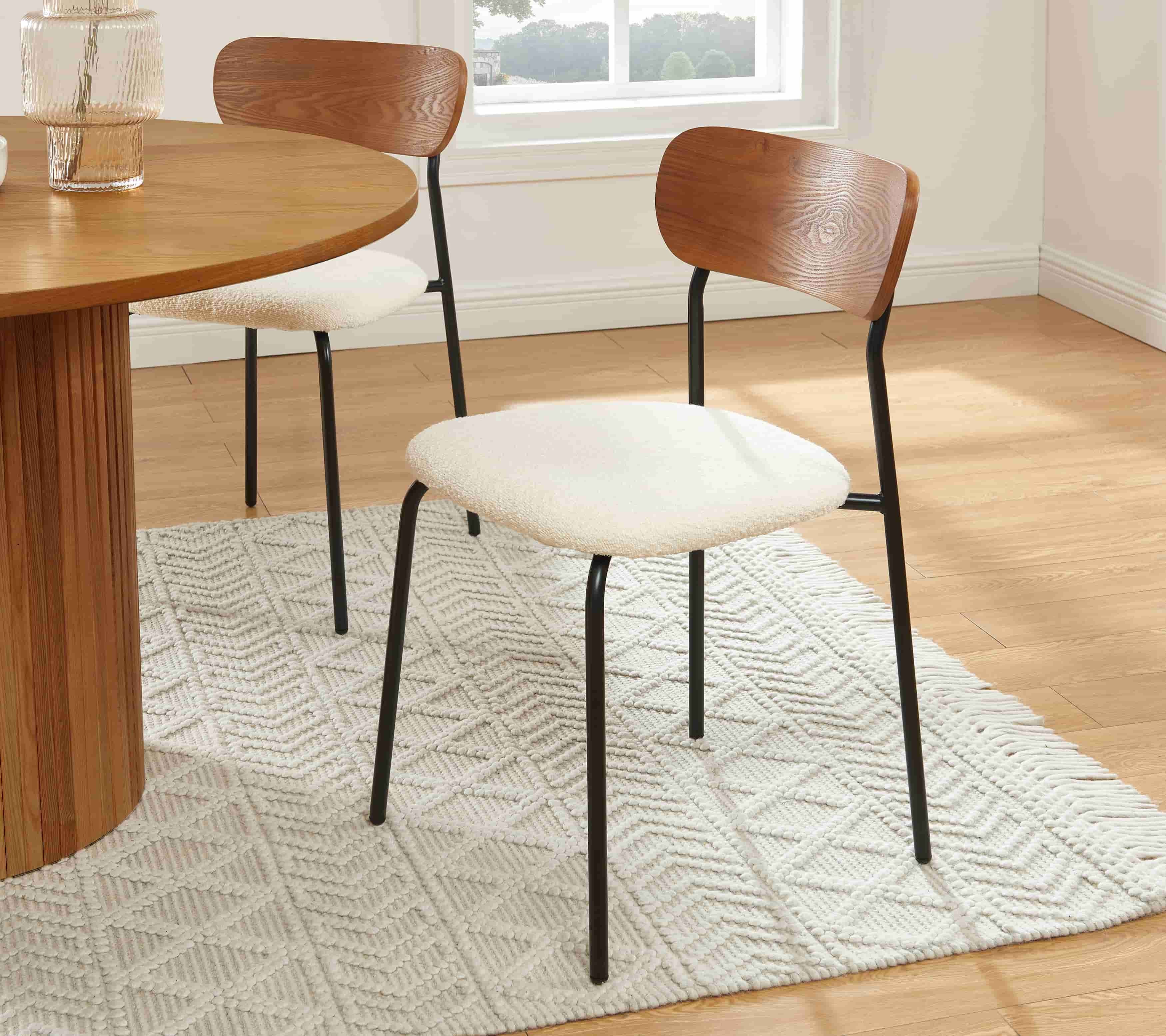Par ailleurs, l'assise des chaises FRIDA est disponible en plusieurs options de tissus et de coloris. Vous pouvez donc choisir entre le tissu bouclette écru, qui évoque une atmosphère douce et accueillante, ou le velours côtelé blanc, noir ou jaune moutarde, pour une apparence plus sophistiquée.