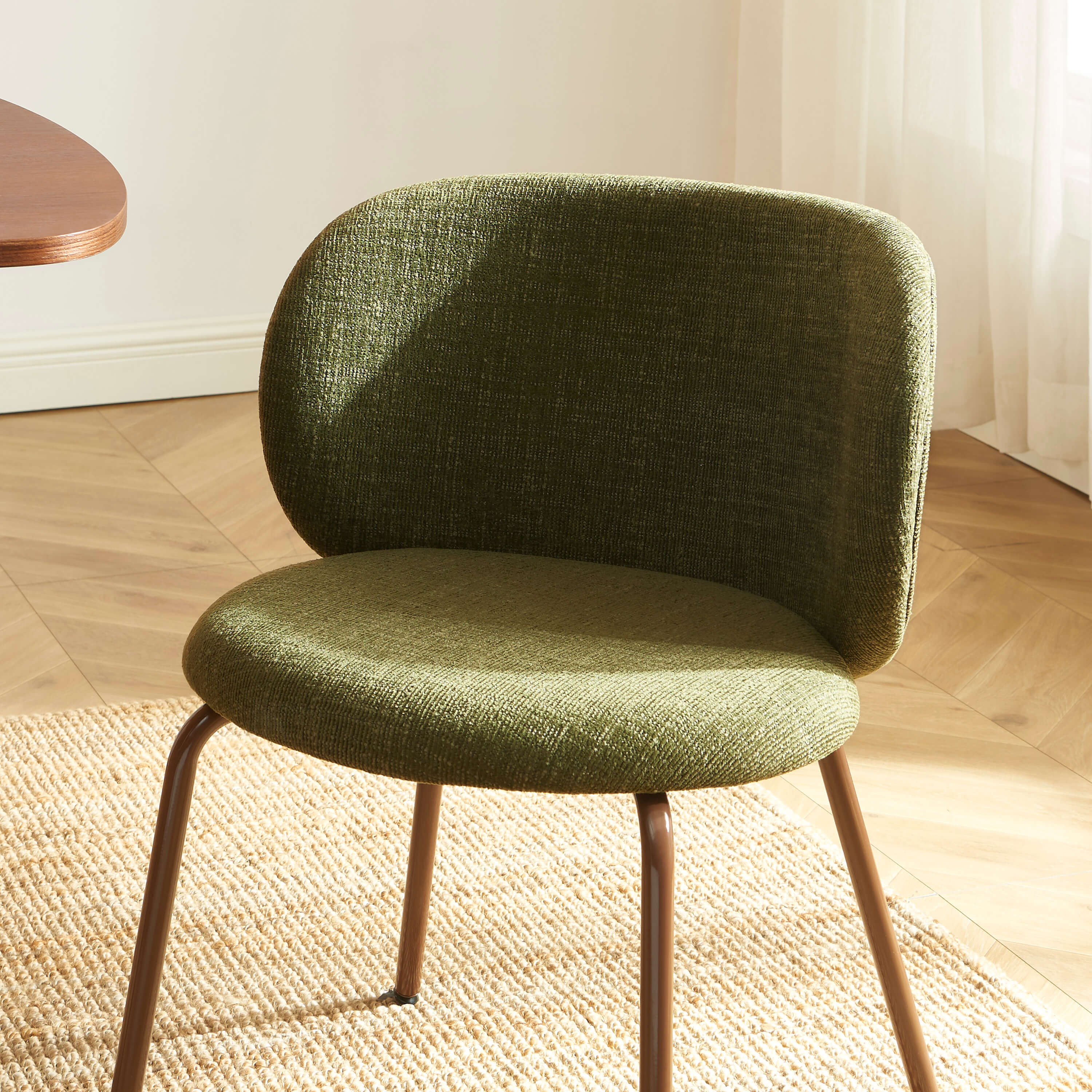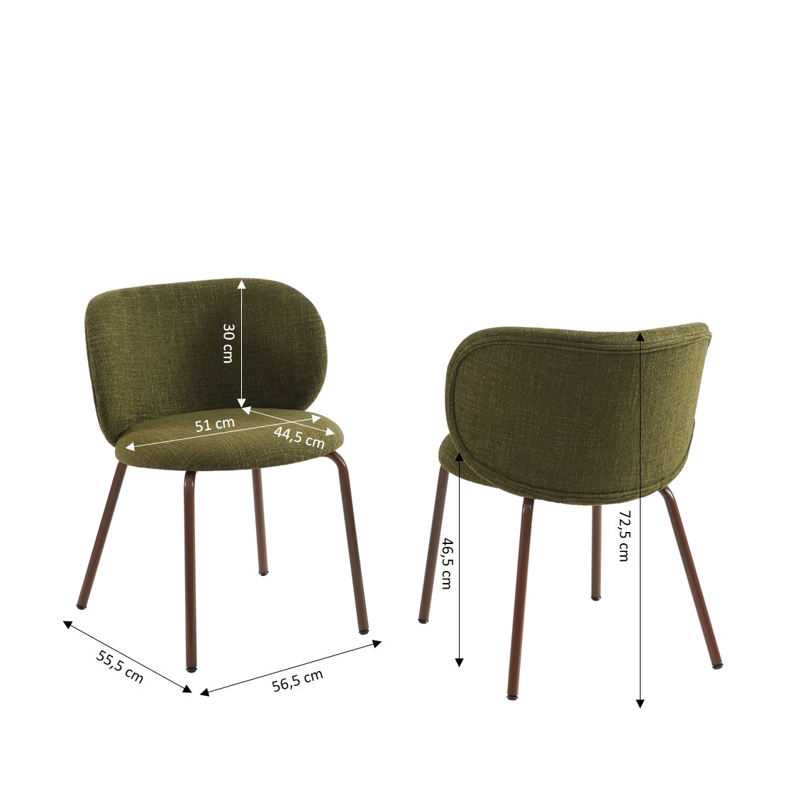 Les chaises SERENA se distinguent par leur assise enveloppante en tissu chenille, à la fois douce et tendance. Le contraste avec les pieds en métal marron apporte une touche contemporaine et élégante, idéale pour une salle à manger conviviale.
