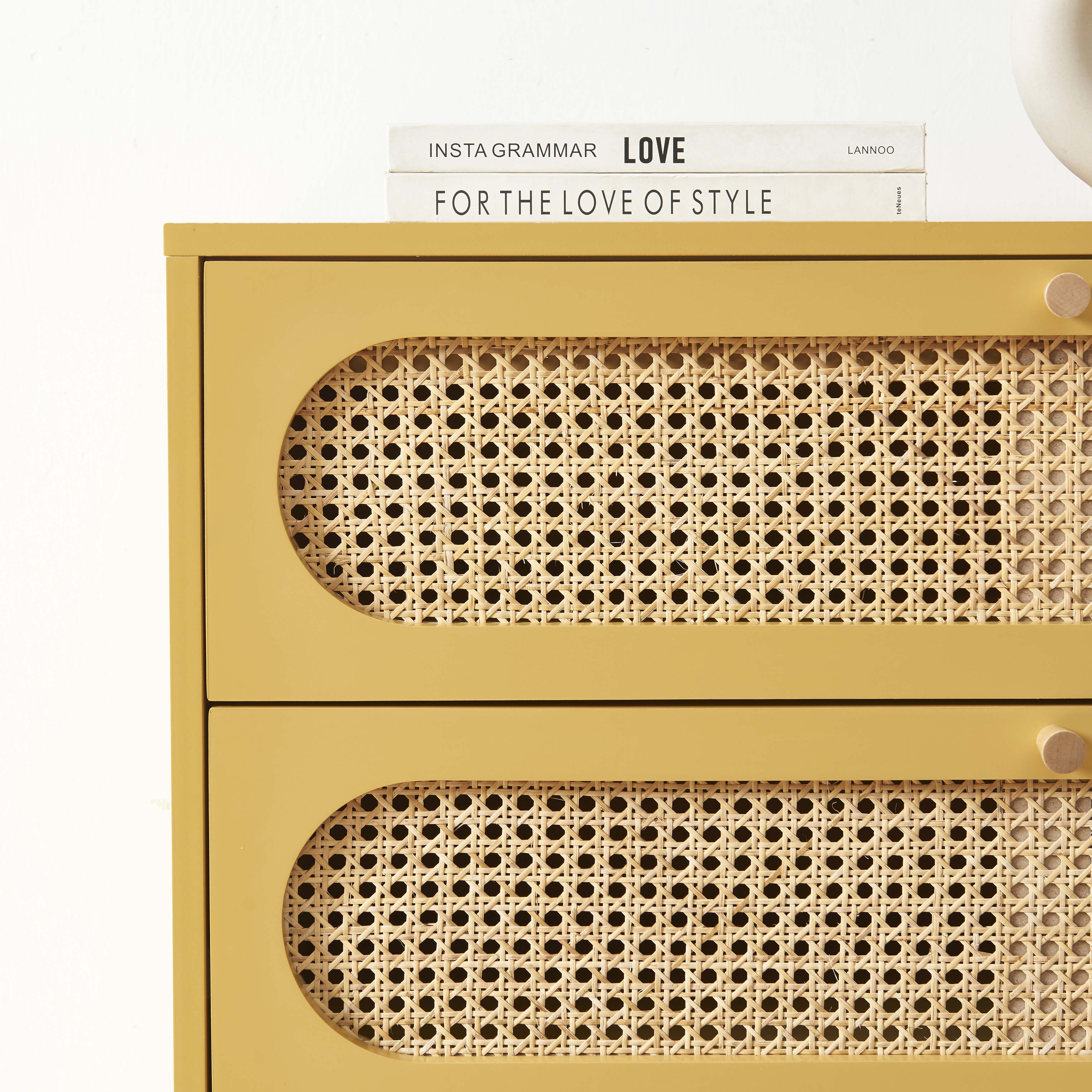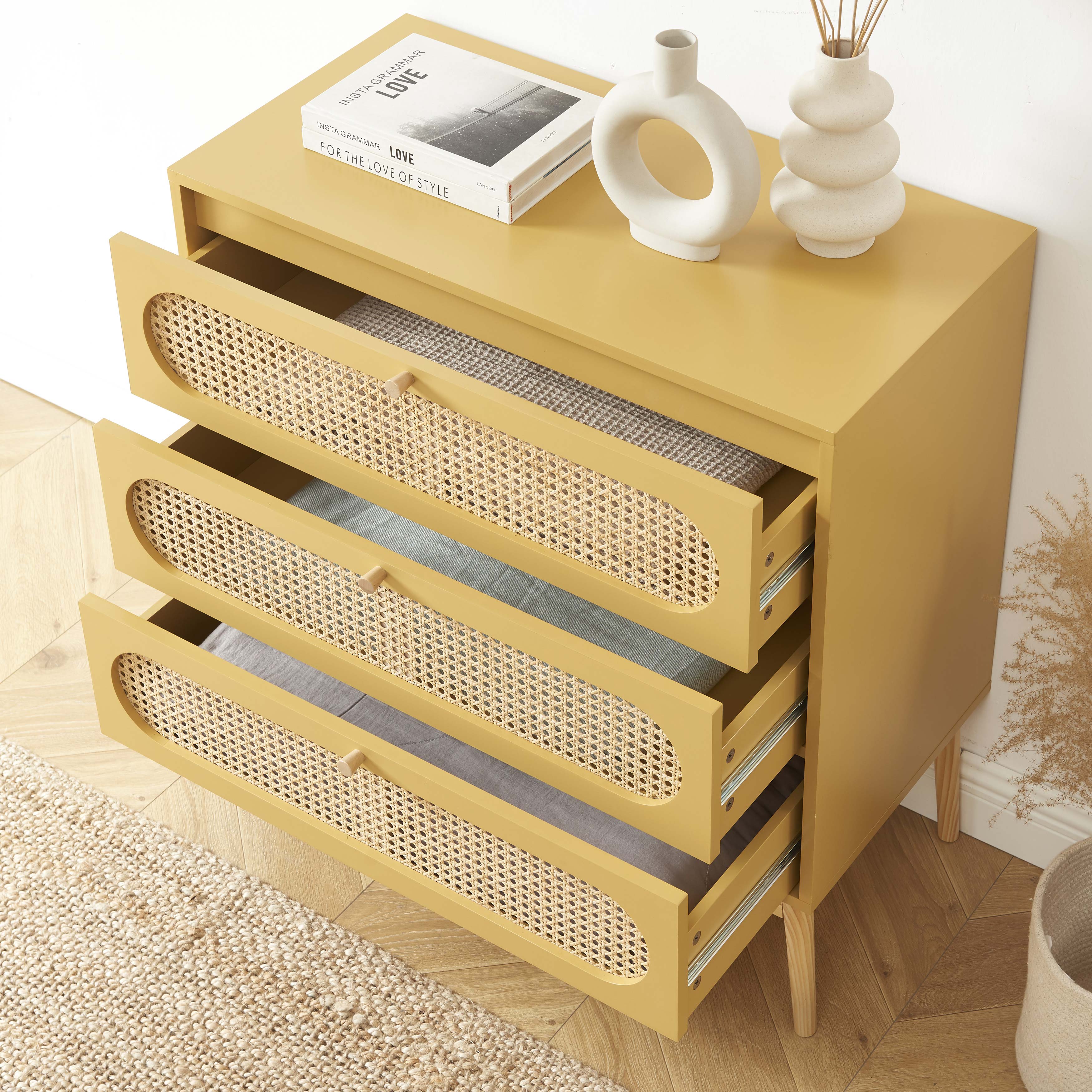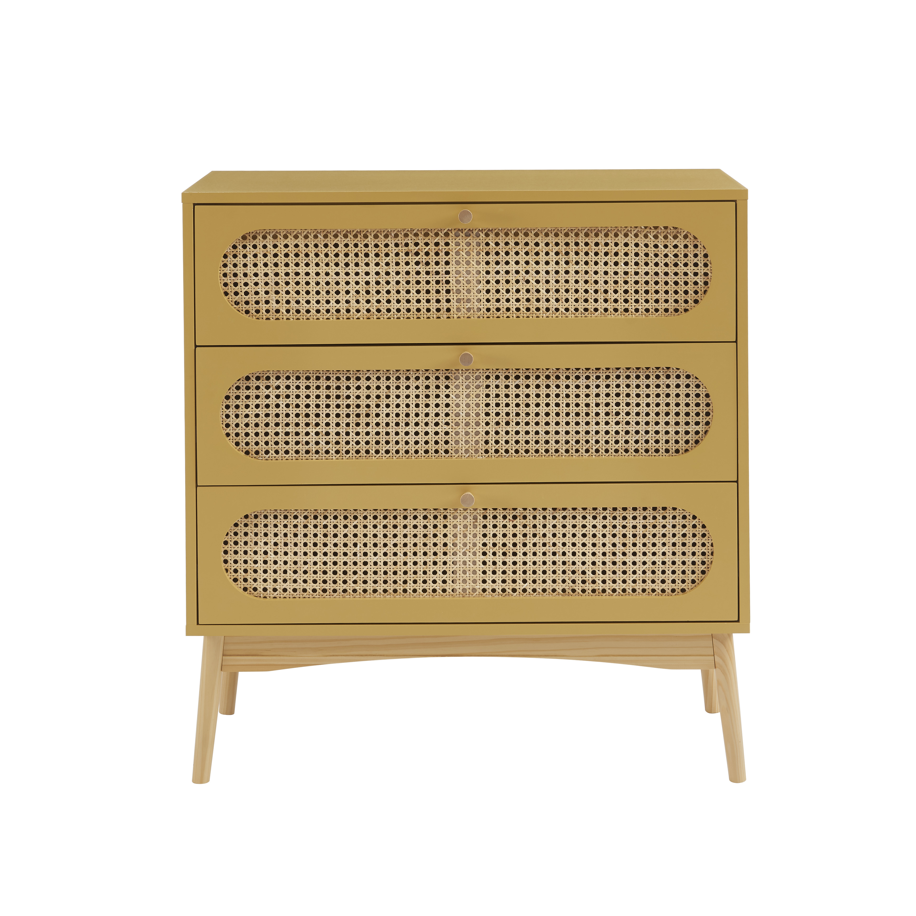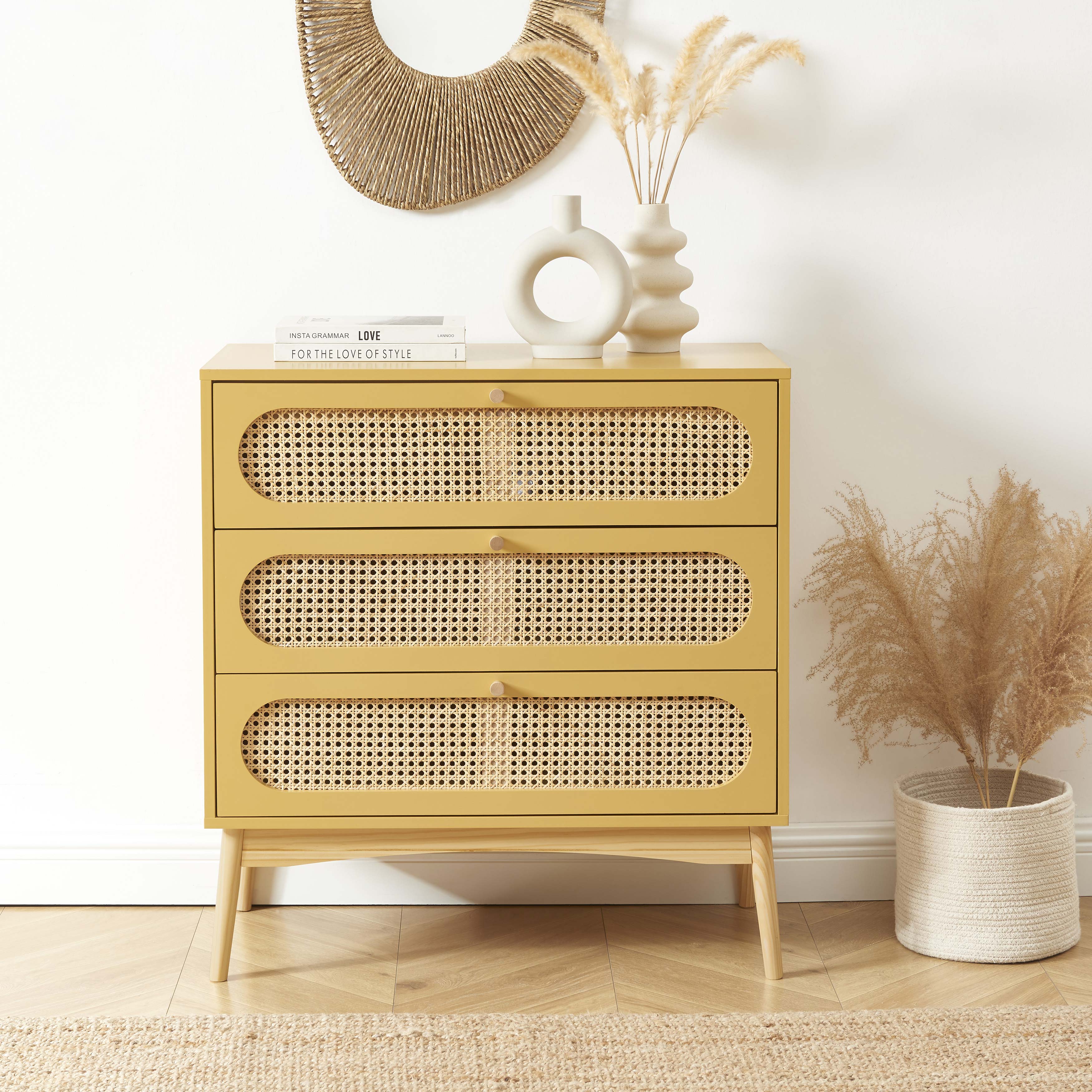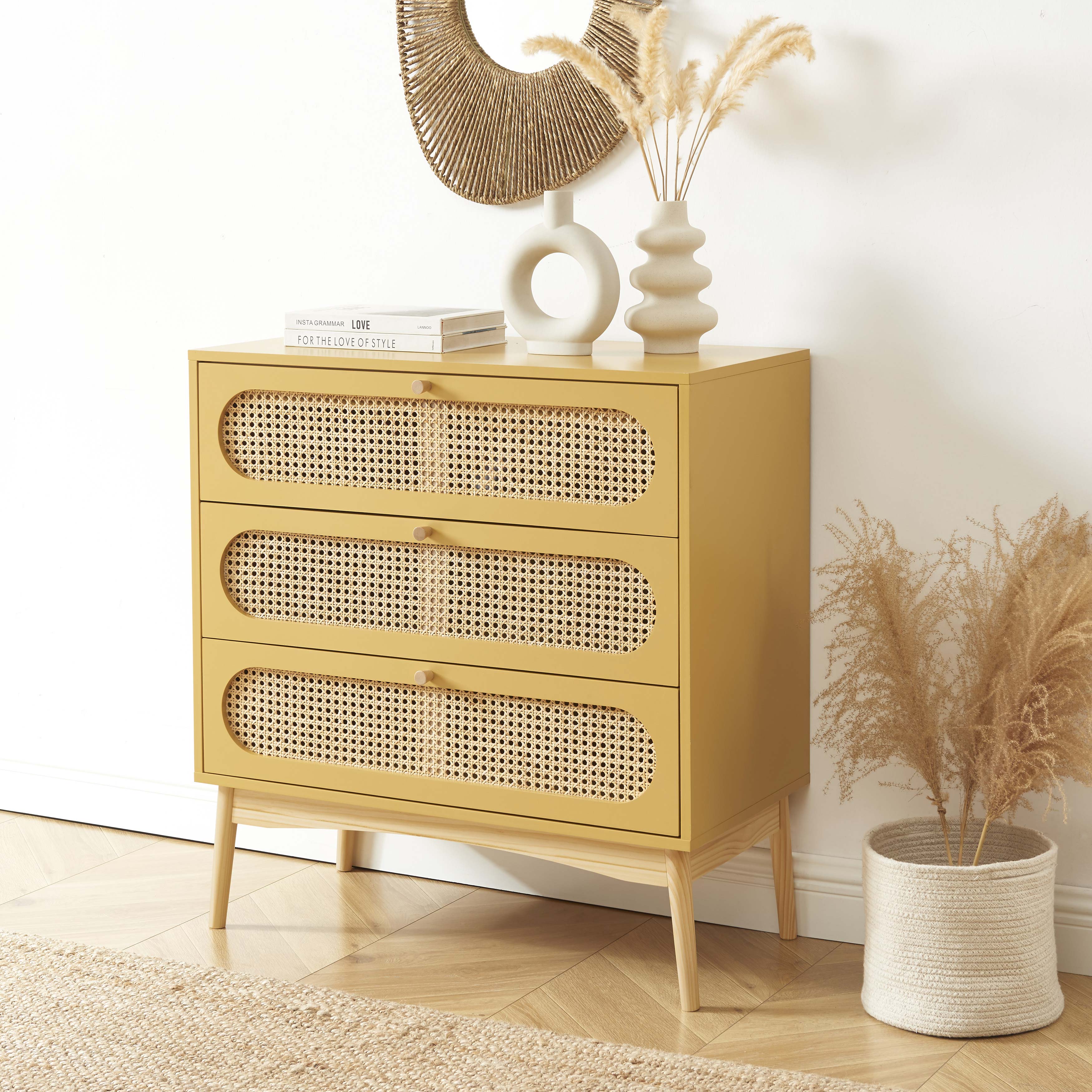Commode SIXTINE 3 tiroirs jaune safran et cannage rotin 80cm