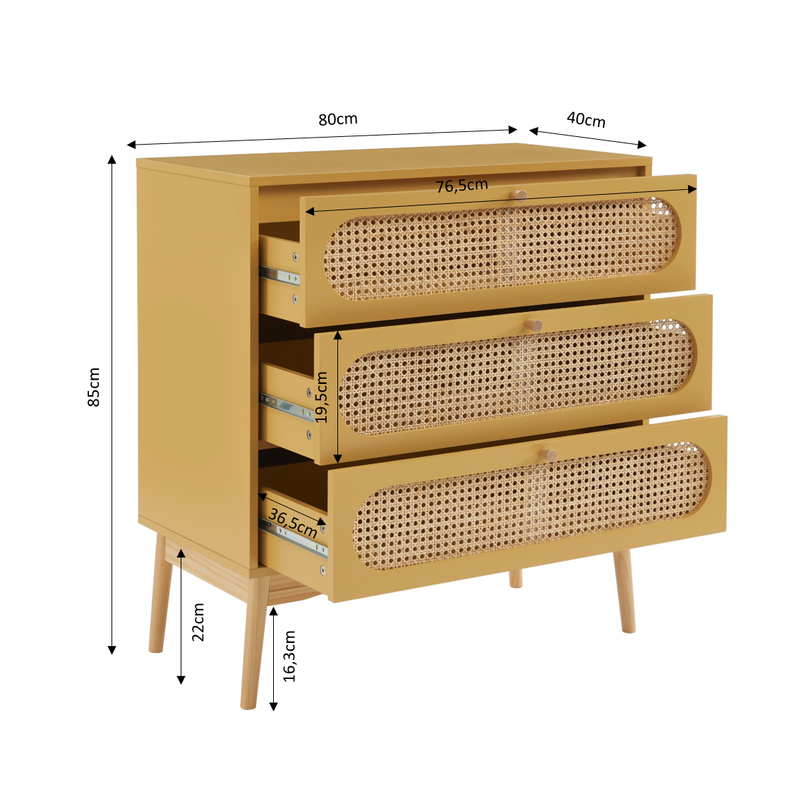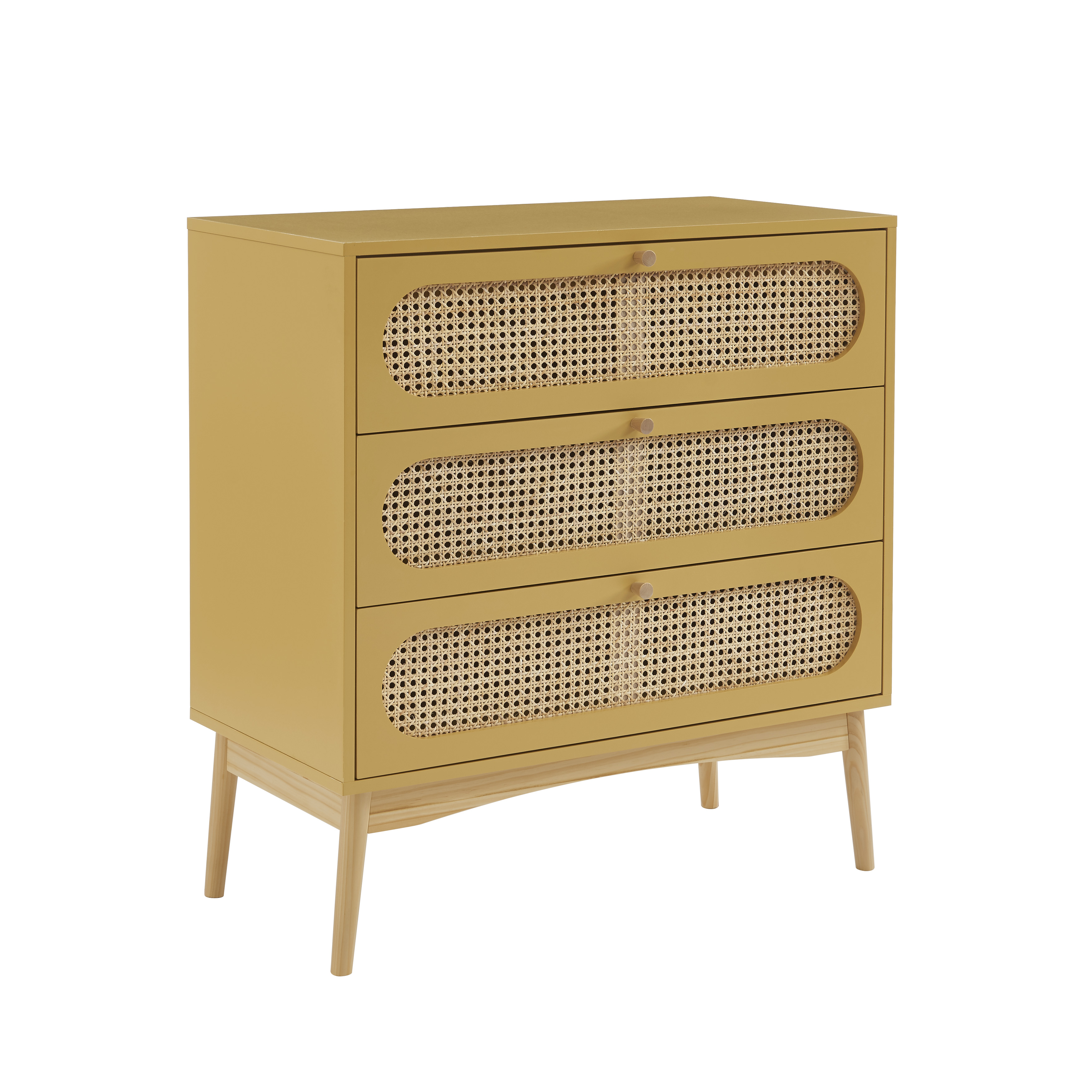 Commode SIXTINE 3 tiroirs jaune safran avec cannage en rotin - dimensions : 80 x 40 x 85 cm