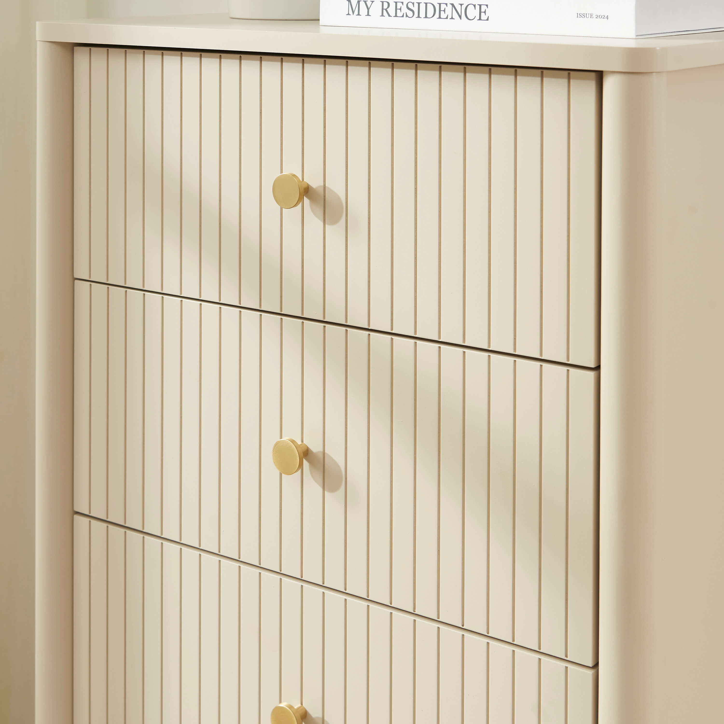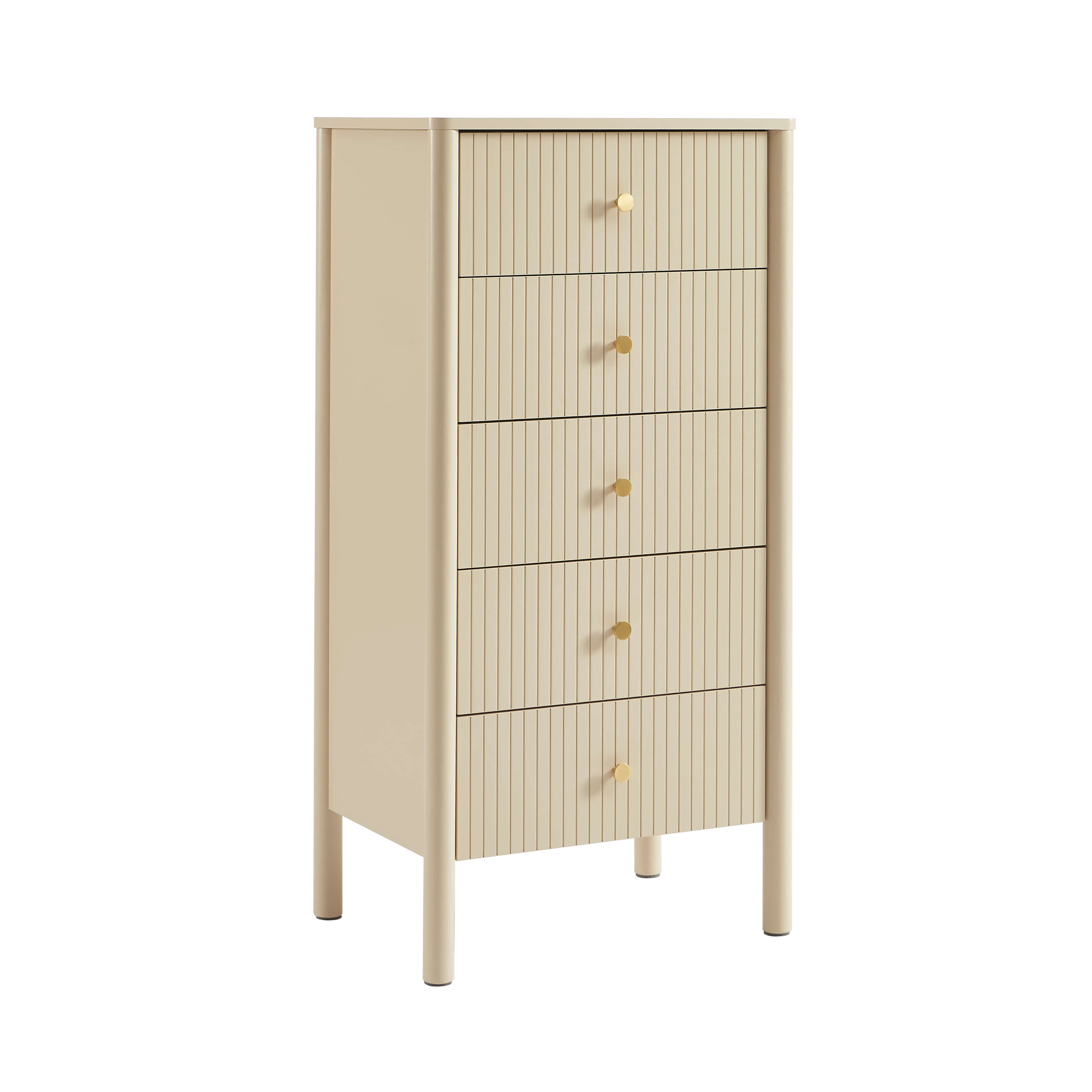 Compact et élégant, le chiffonnier CLEO séduit par ses 5 tiroirs cannelés, ses pieds en frêne massif et ses poignées dorées. Une solution de rangement moderne et pratique pour les petits espaces.