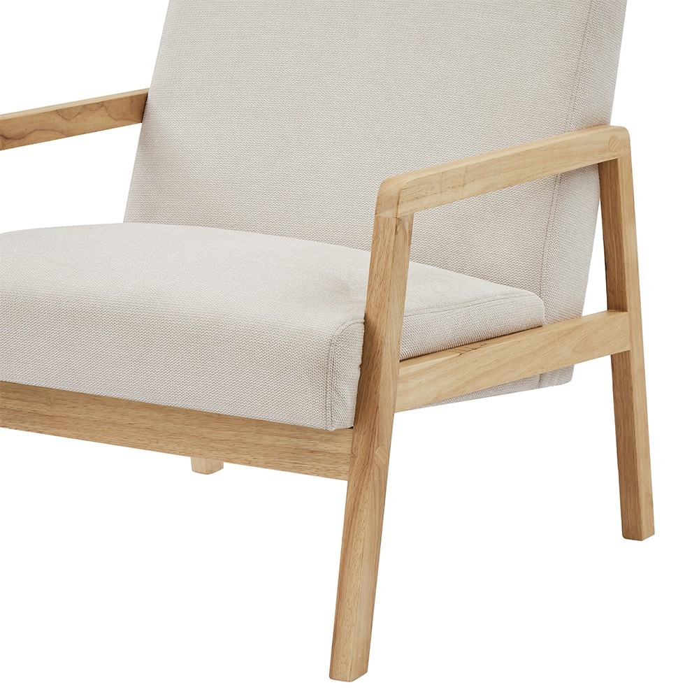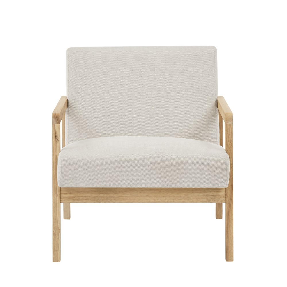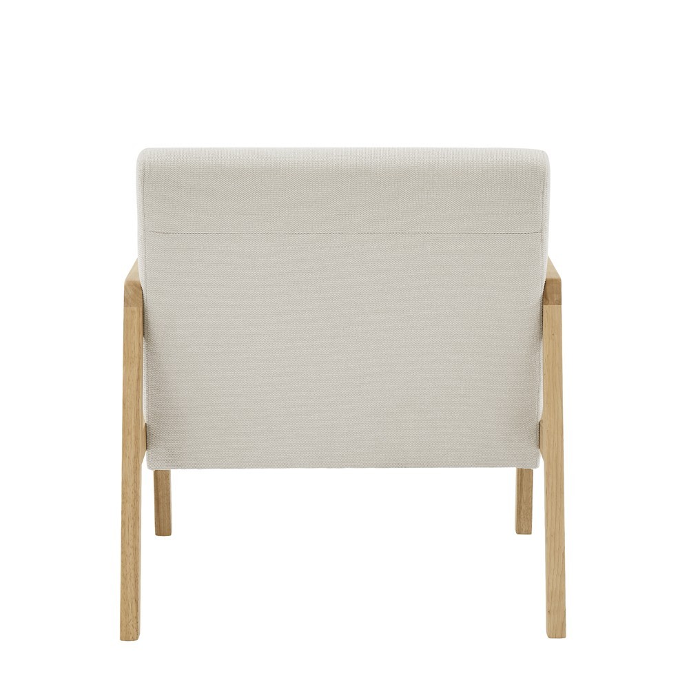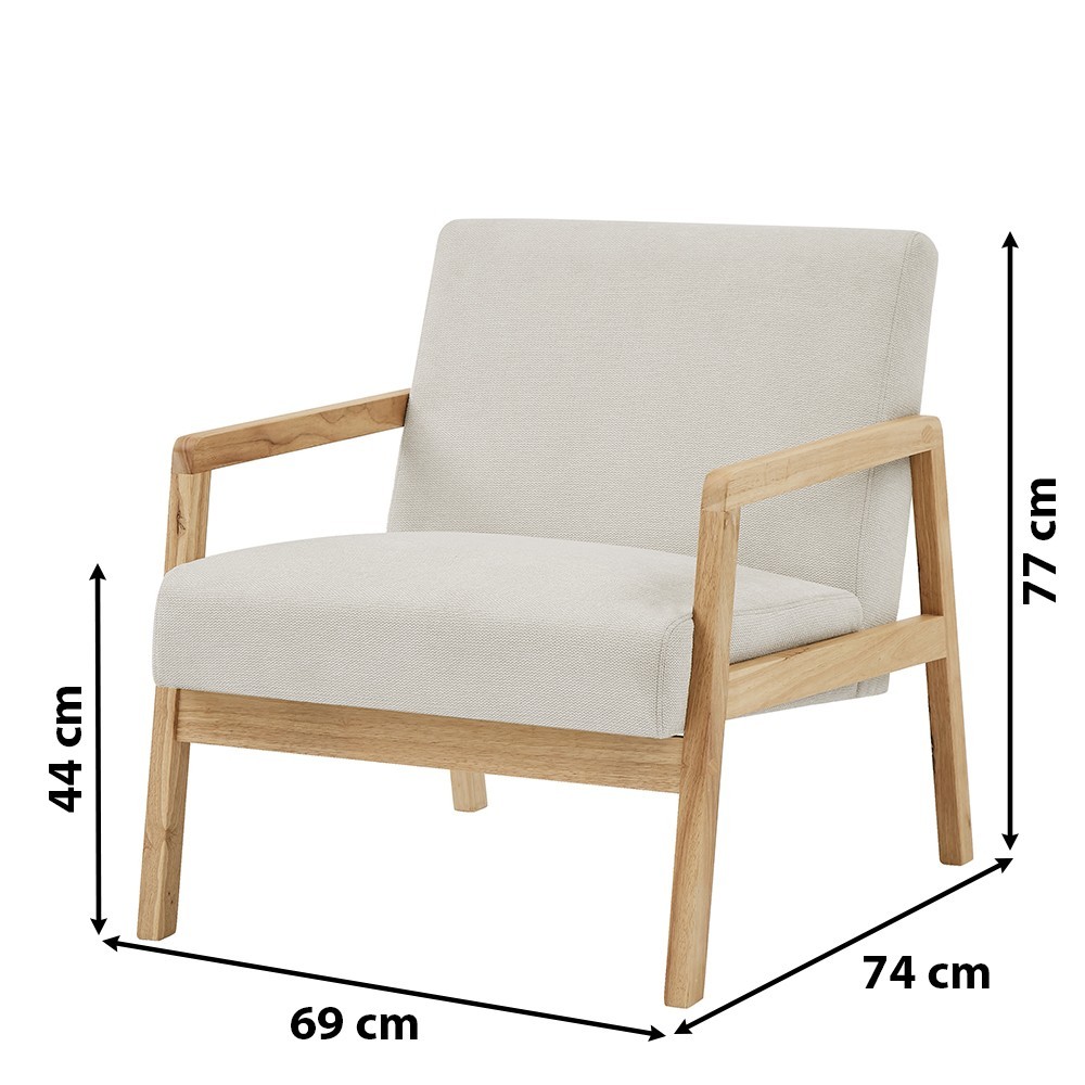 Fauteuil BONIFACIO en tissu beige avec piètement en bois. Dimensions 69 x 74 x 77 cm